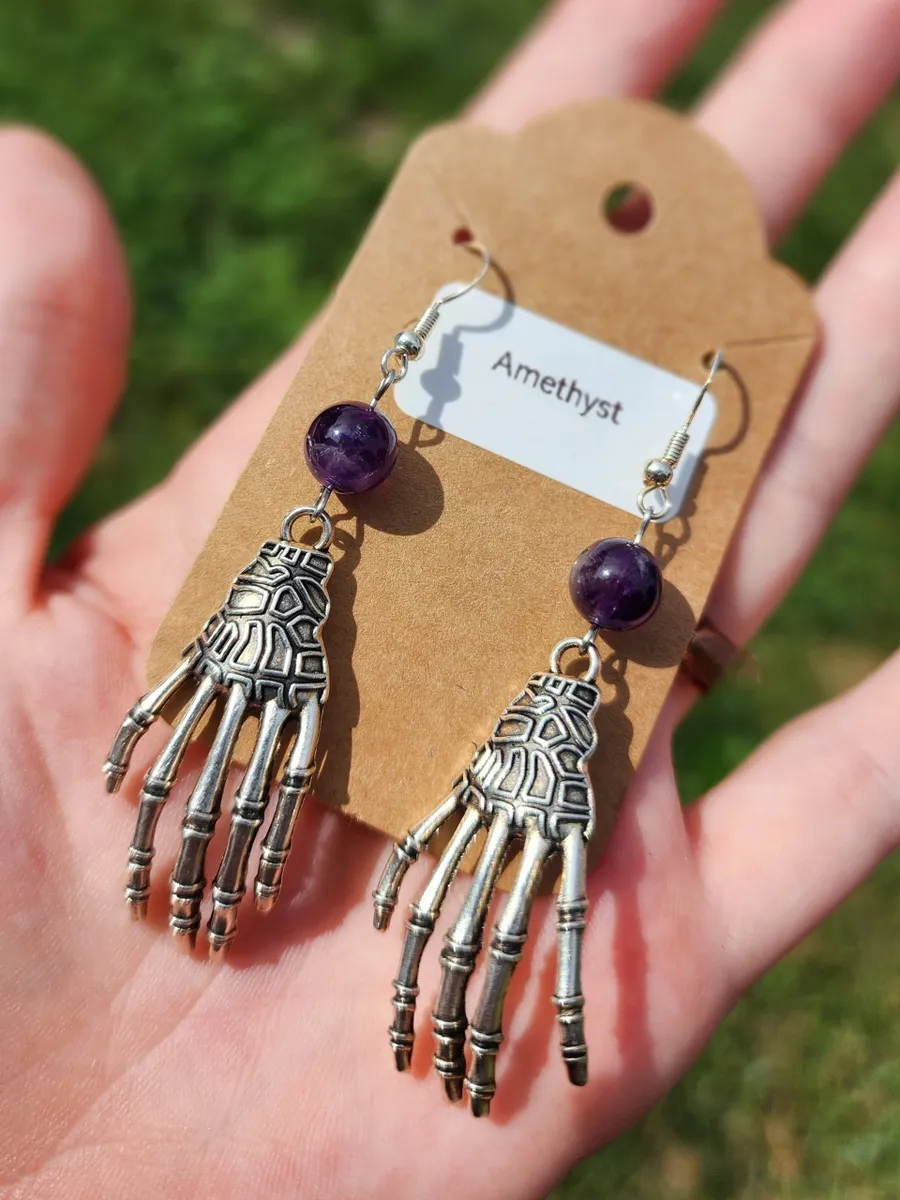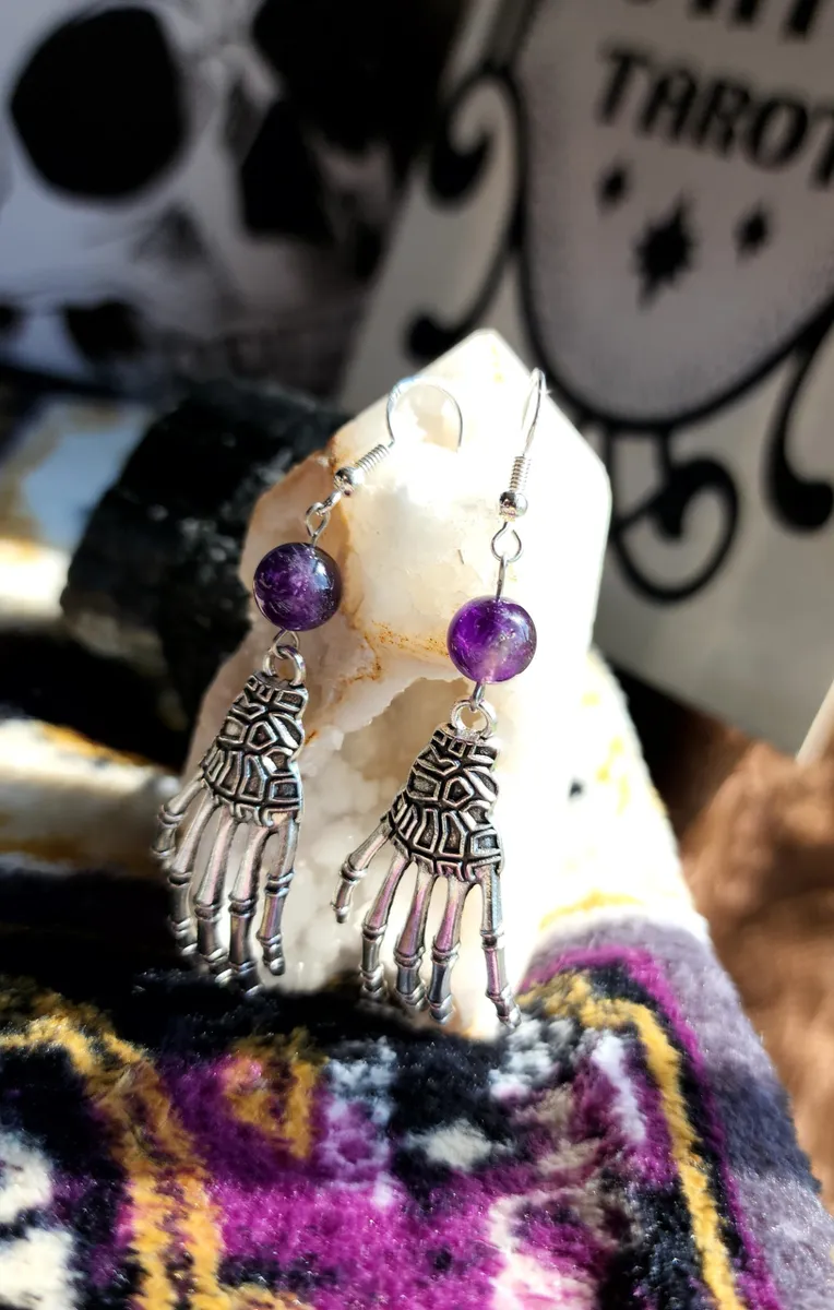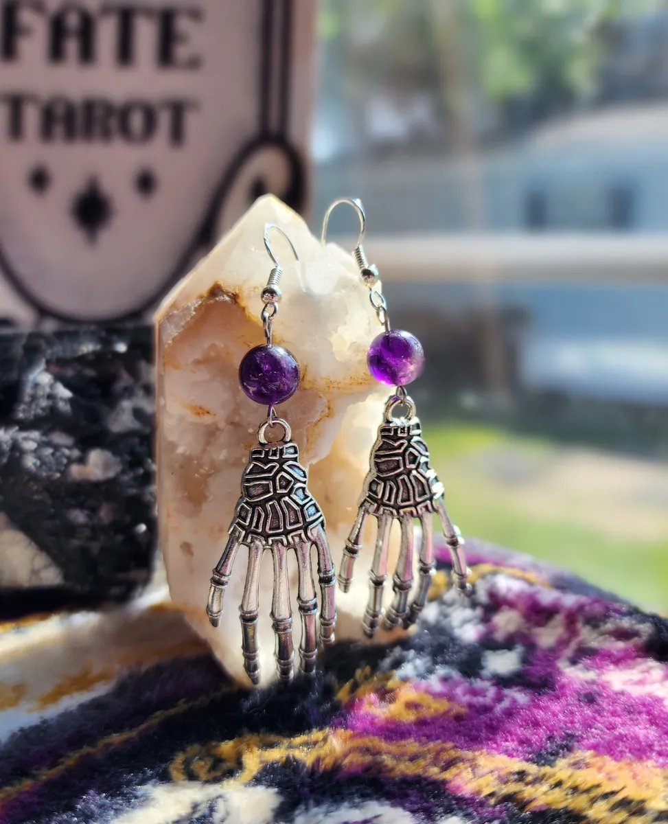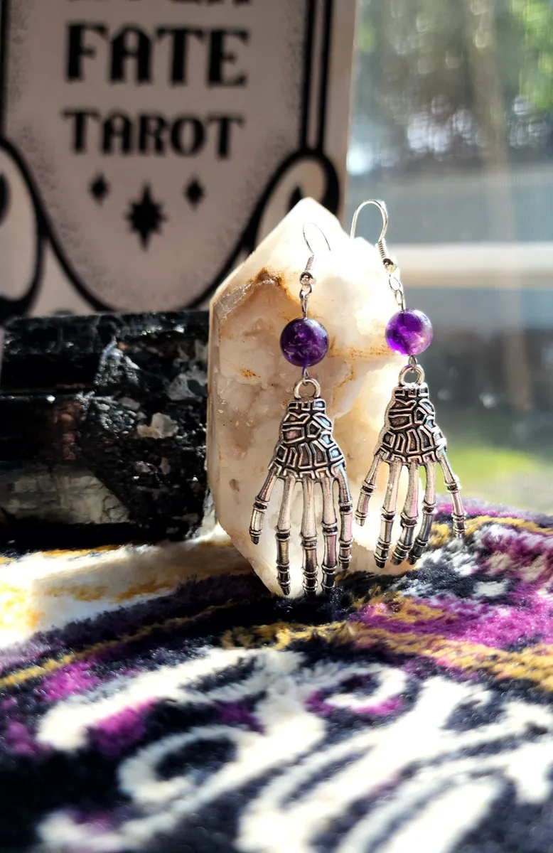 Each earring is meticulously handcrafted, ensuring that no two pairs are exactly alike. The amethyst beads are skillfully arranged, highlighting their natural beauty and creating a striking visual impact. The skeleton hand charm is expertly crafted, capturing the intricate details of each bone, resulting in a finely balanced design that is both eye-catching and elegant.