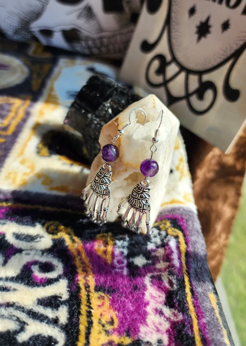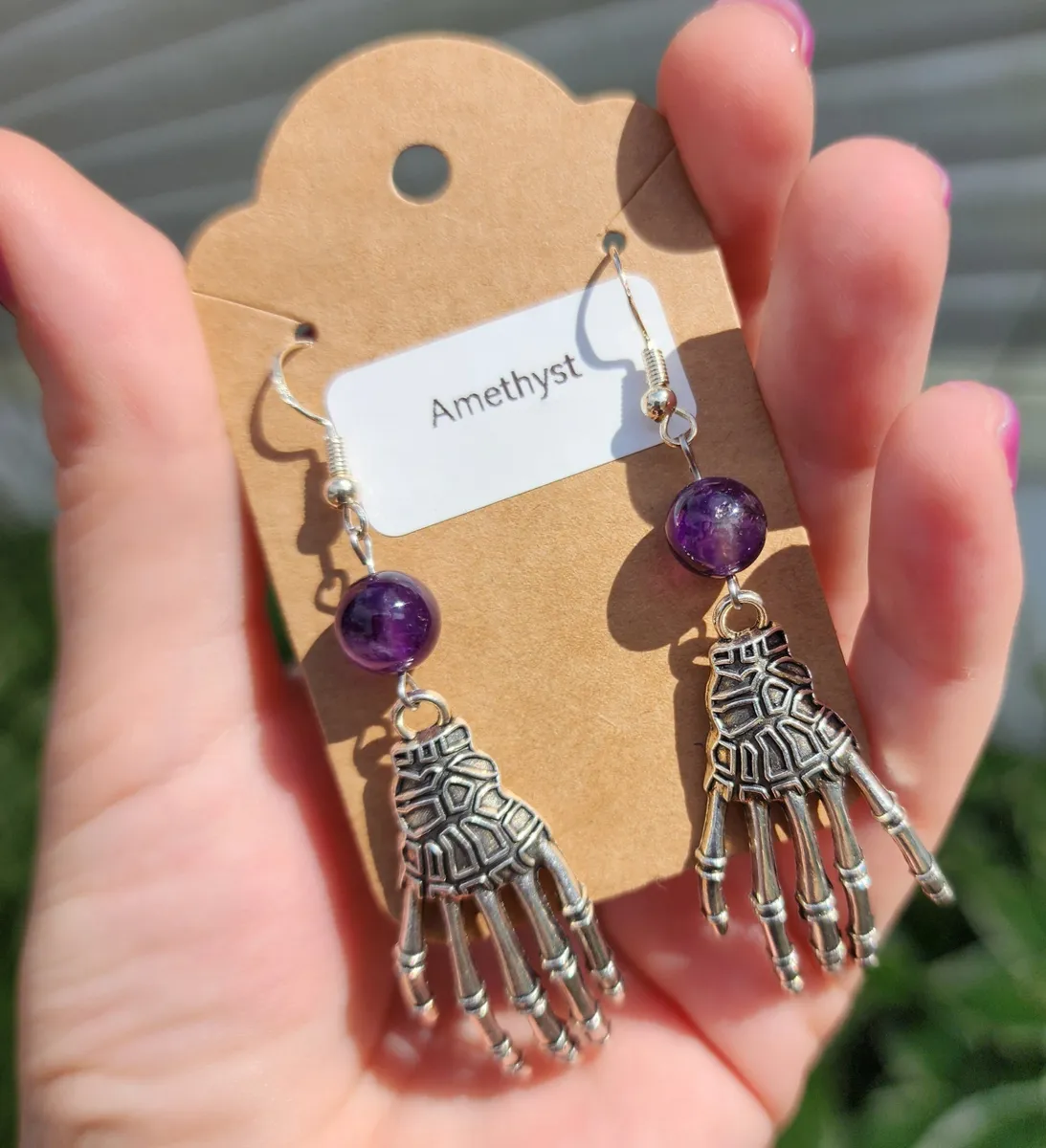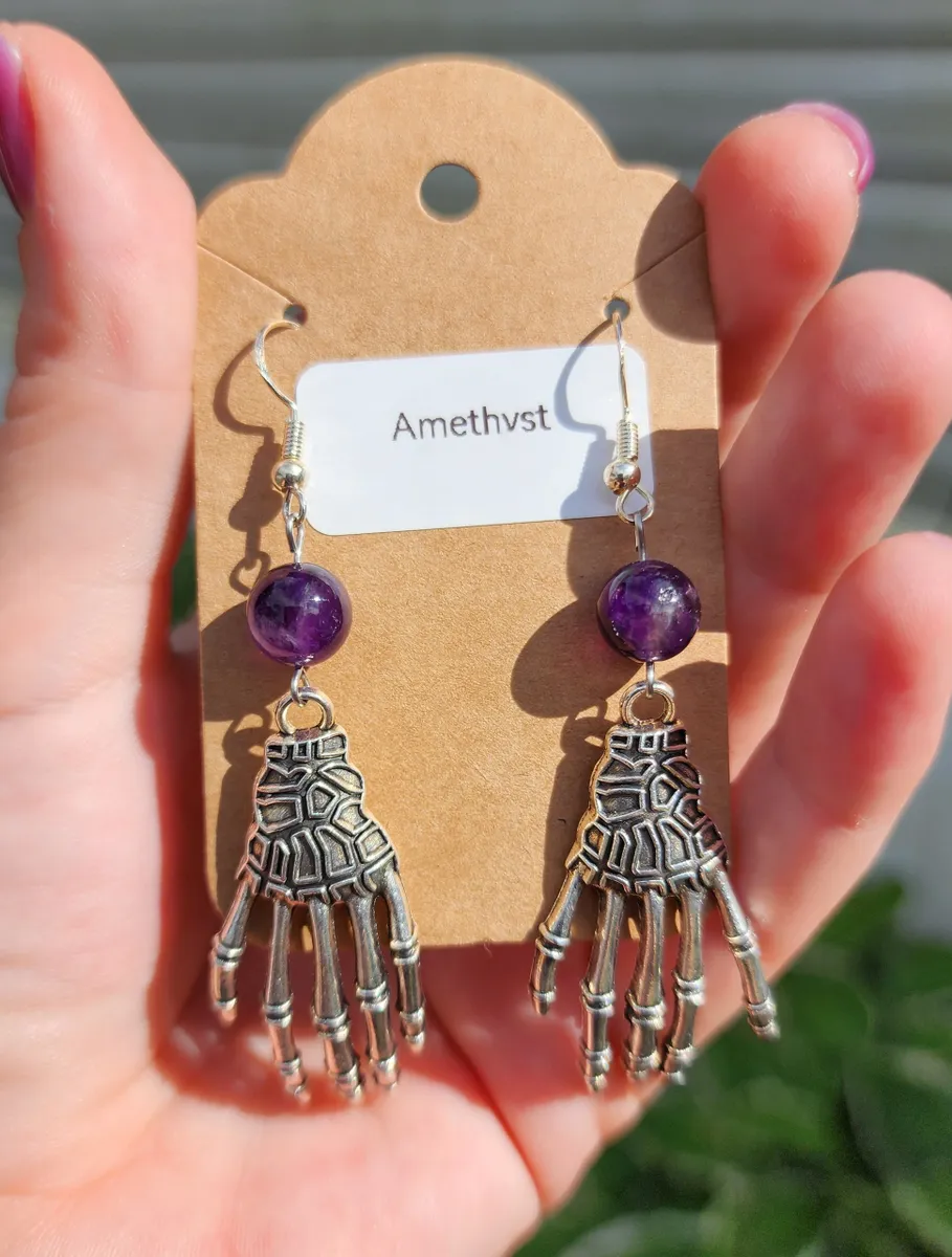 Each earring is meticulously handcrafted, ensuring that no two pairs are exactly alike. The amethyst beads are skillfully arranged, highlighting their natural beauty and creating a striking visual impact. The skeleton hand charm is expertly crafted, capturing the intricate details of each bone, resulting in a finely balanced design that is both eye-catching and elegant.