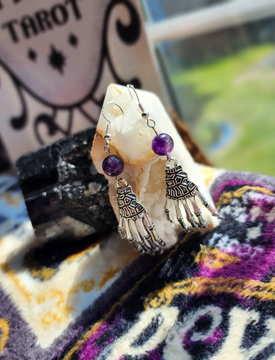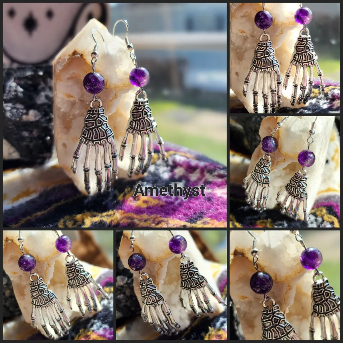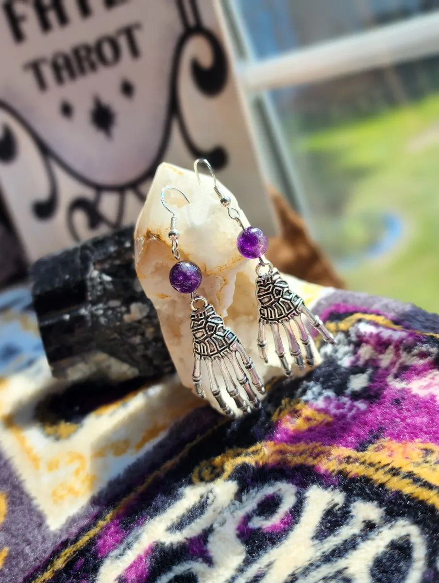 Introducing our exquisite Amethyst and Skeleton Hand Dangle Earrings, the perfect blend of edgy style and natural elegance. Crafted with meticulous attention to detail, these captivating earrings are the epitome of unique craftsmanship.