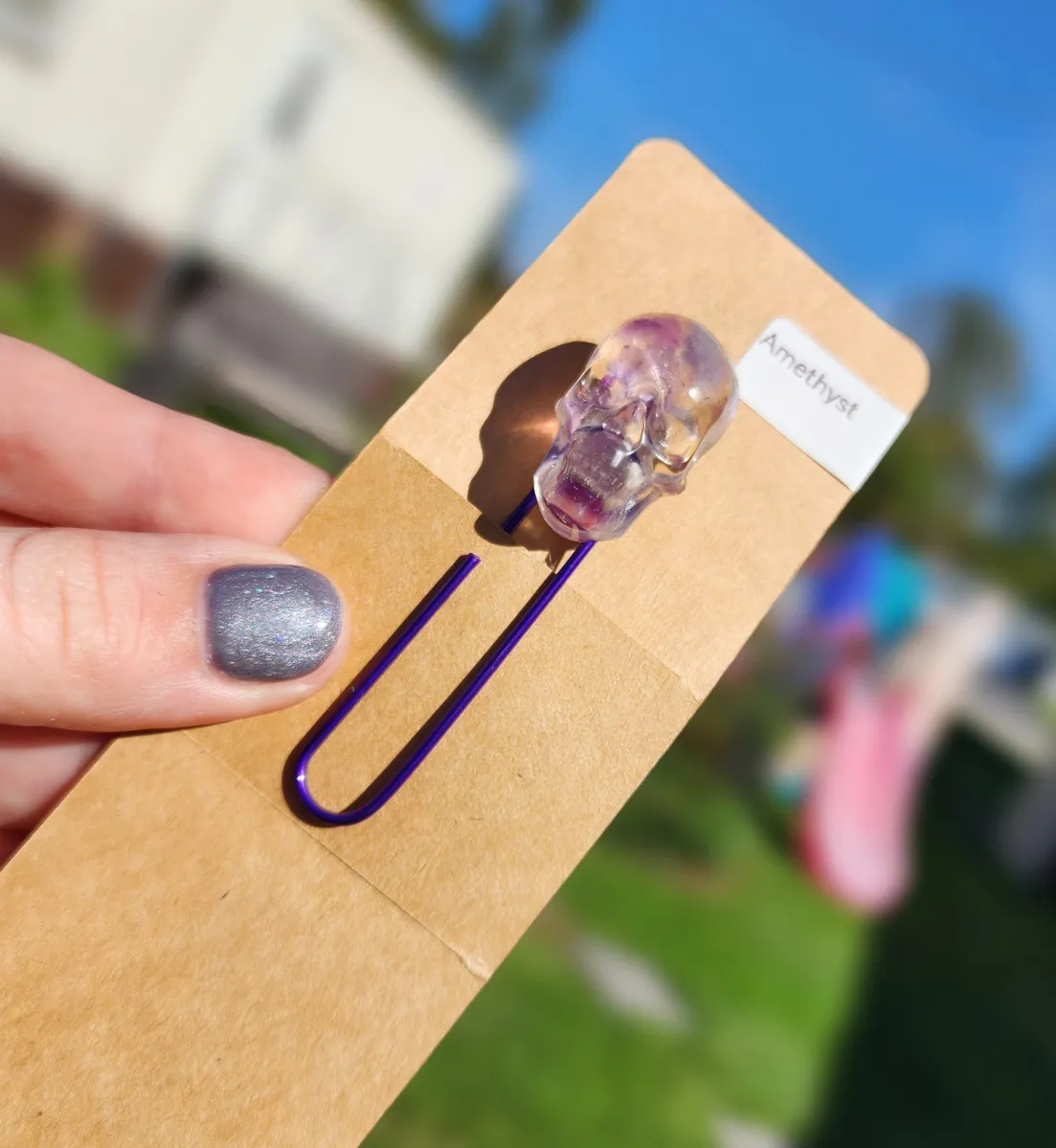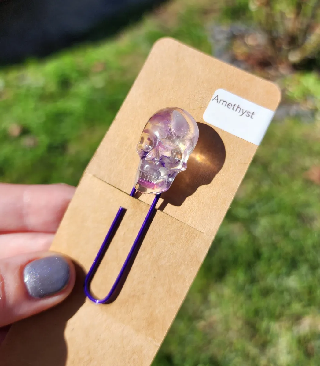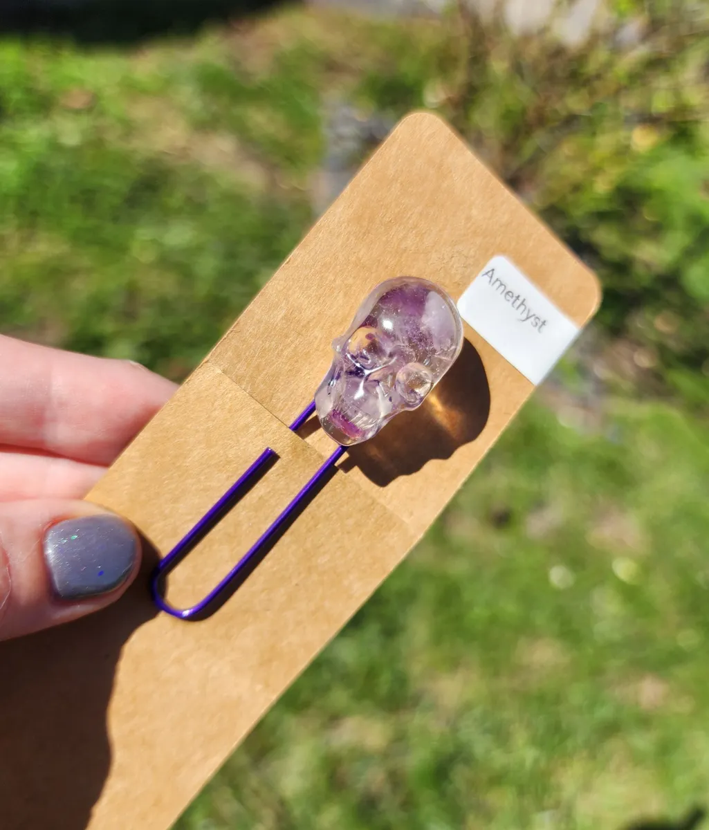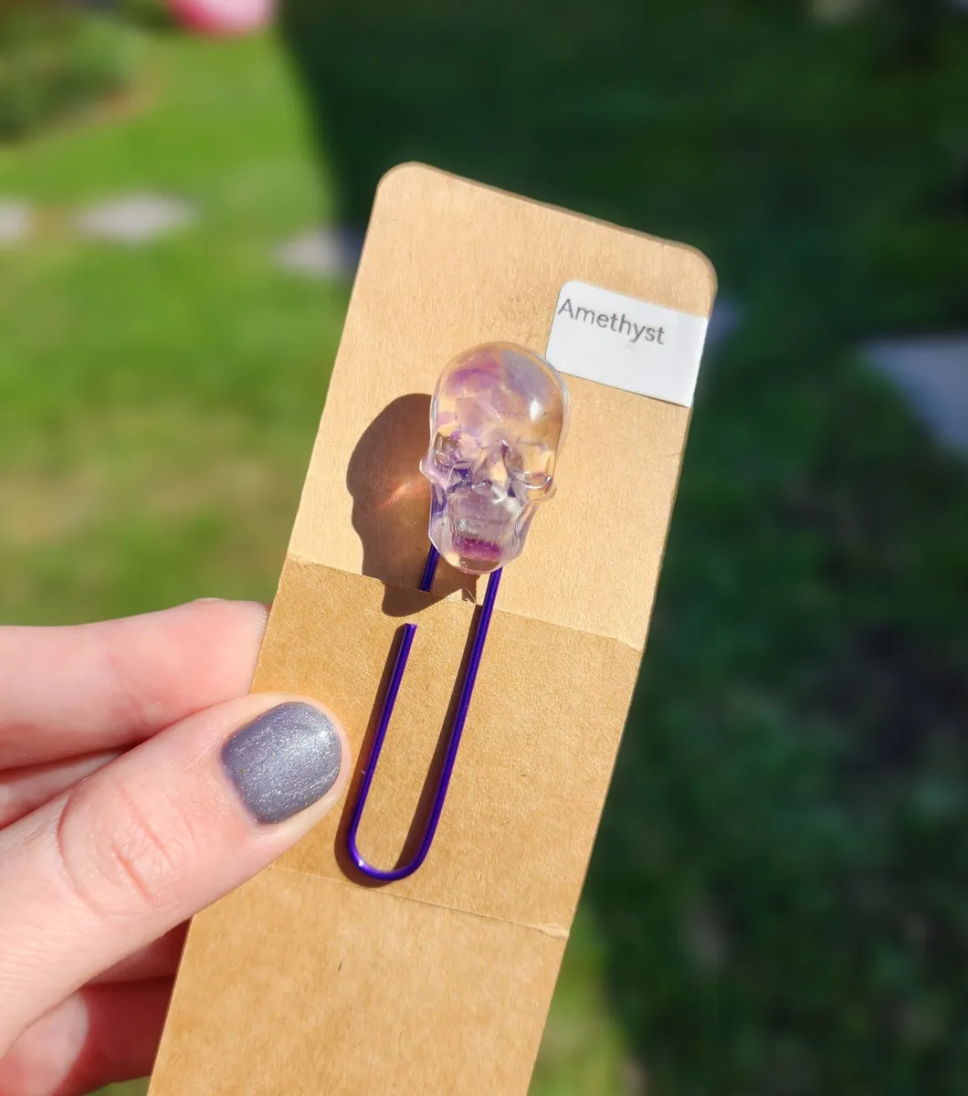 Introducing our Amethyst Skull Bookmark! This unique and eye-catching bookmark is perfect for all book lovers who want to add a touch of edgy style to their reading experience. The stunning amethyst skull design is sure to stand out on any page, while the paperclip attachment ensures your place is always marked securely. Made with high-quality materials, this bookmark is durable and long-lasting. Whether you’re reading a thrilling mystery or a romantic novel, this bookmark is the perfect accessory to accompany you on your literary adventures. Don’t miss out on this must-have item for any bookworm!