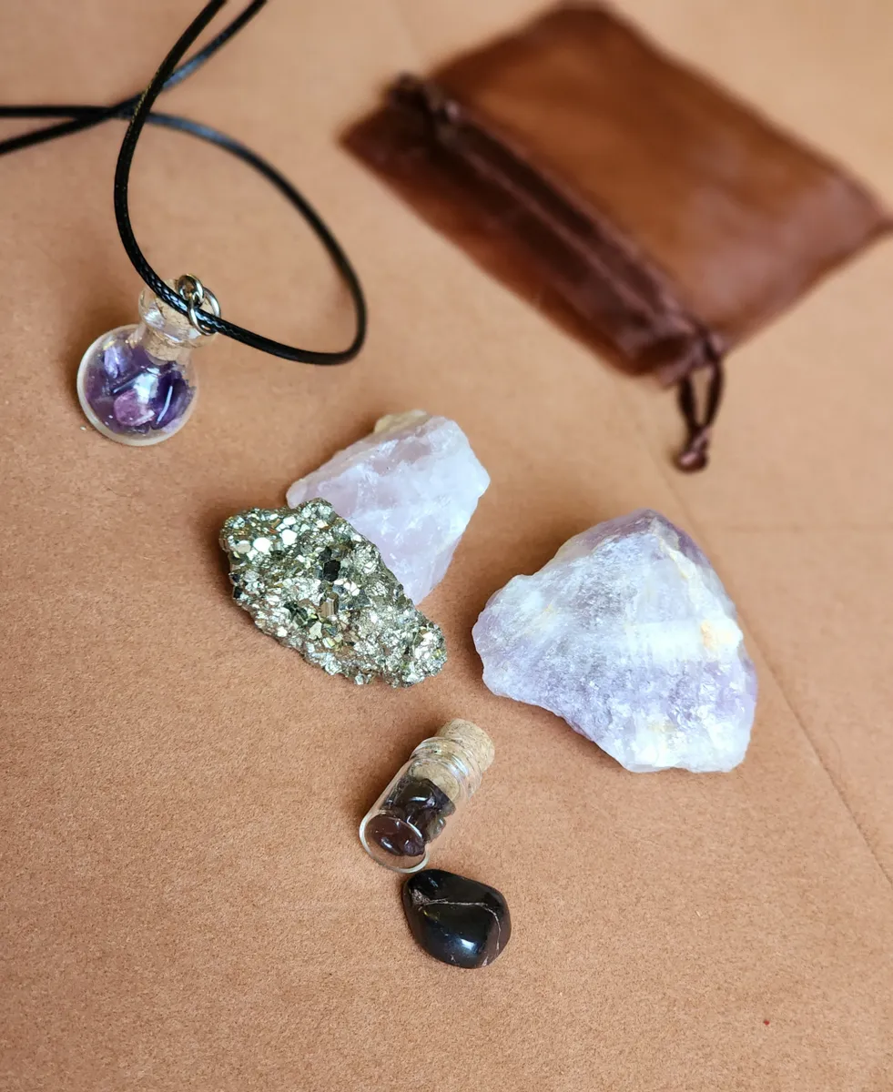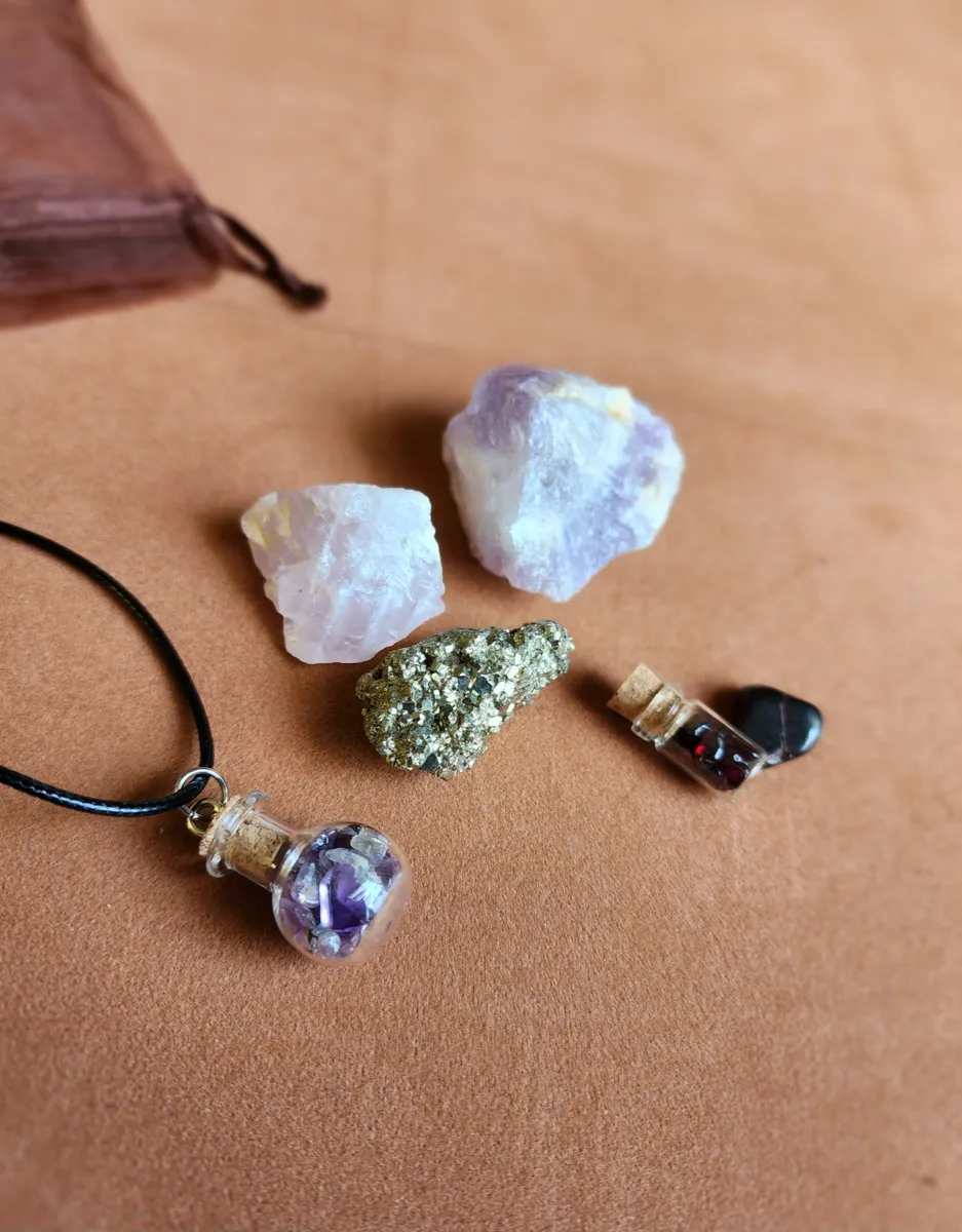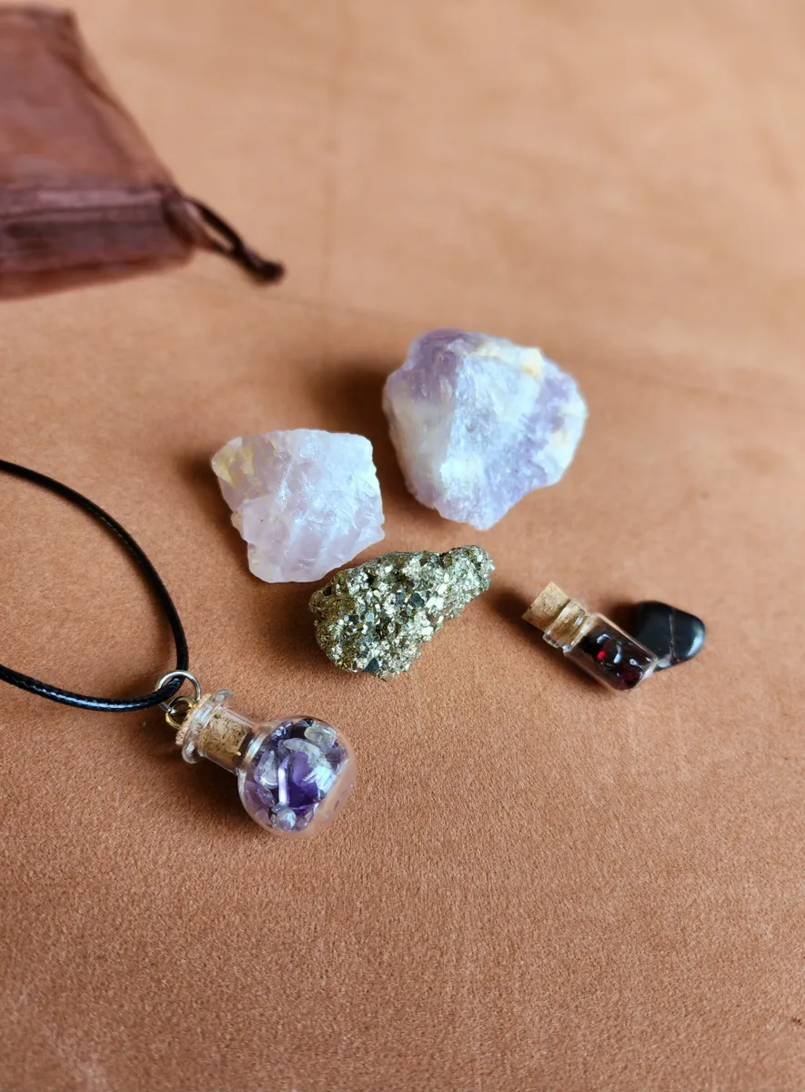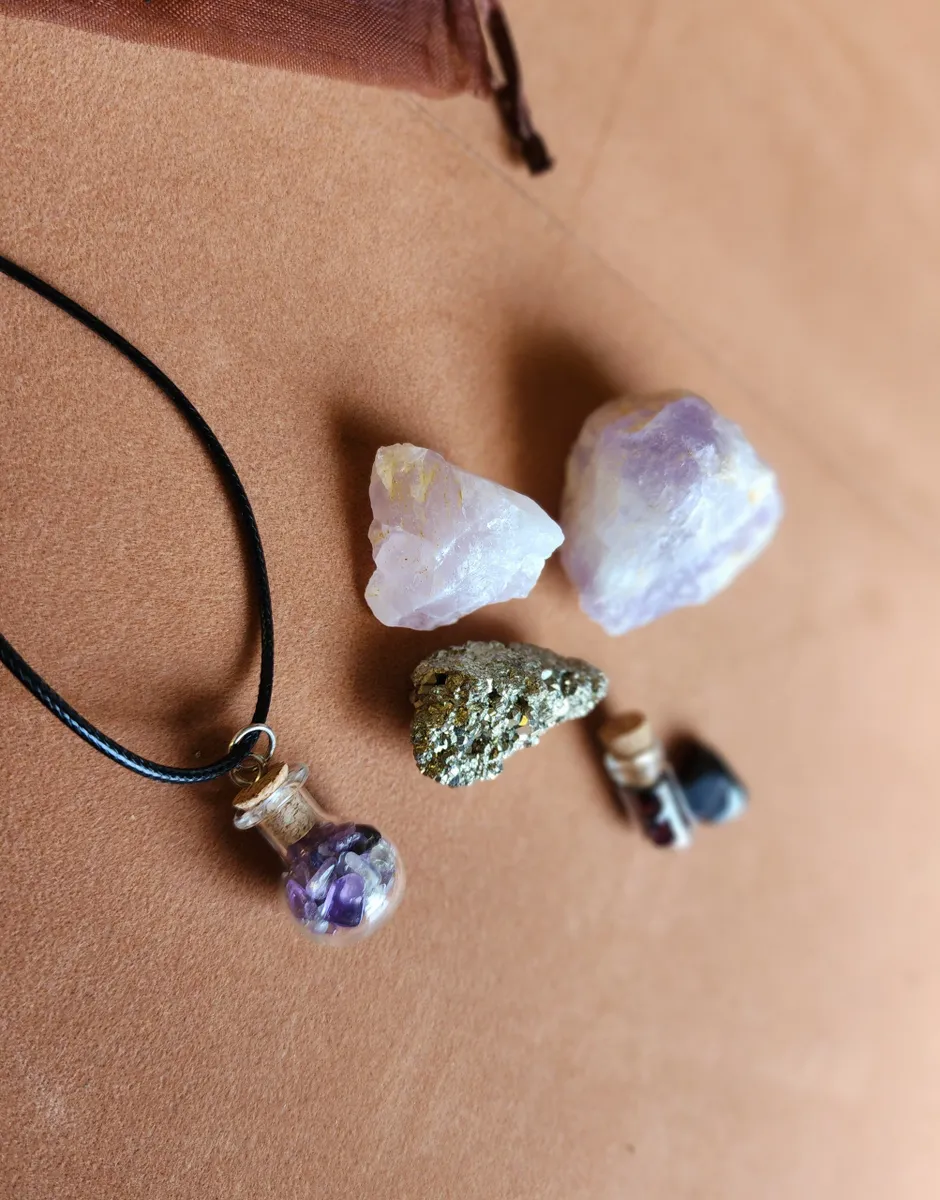 This Bag includes a Glass Bottle necklaces filled with Amethyst, a tiny bottle with Garnet inside, a piece of Pyrite, Amethyst, Rose Quartz and a hematite chip.