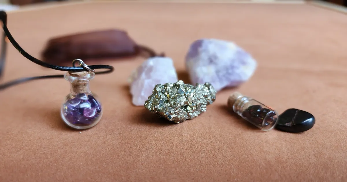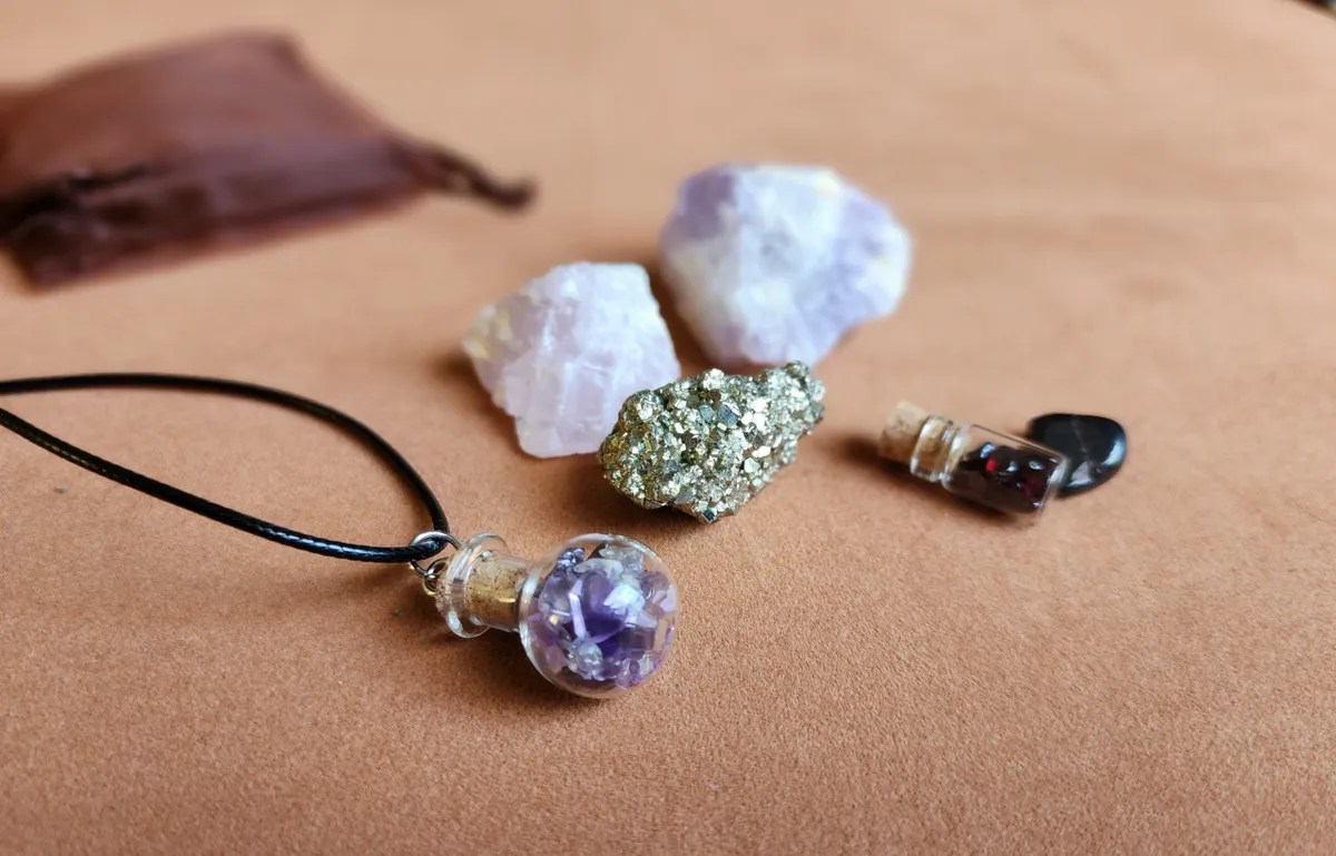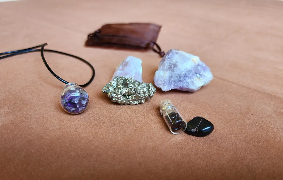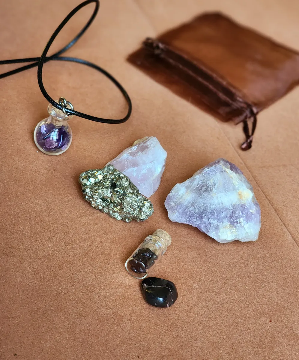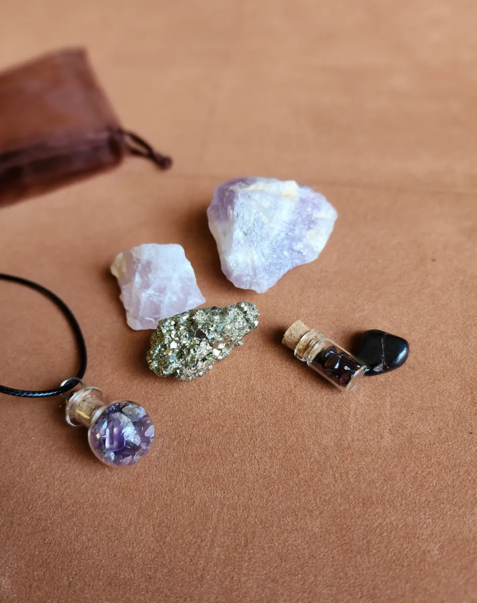 This Bag includes a Glass Bottle necklaces filled with Amethyst, a tiny bottle with Garnet inside, a piece of Pyrite, Amethyst, Rose Quartz and a hematite chip.