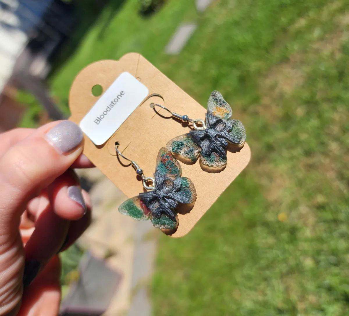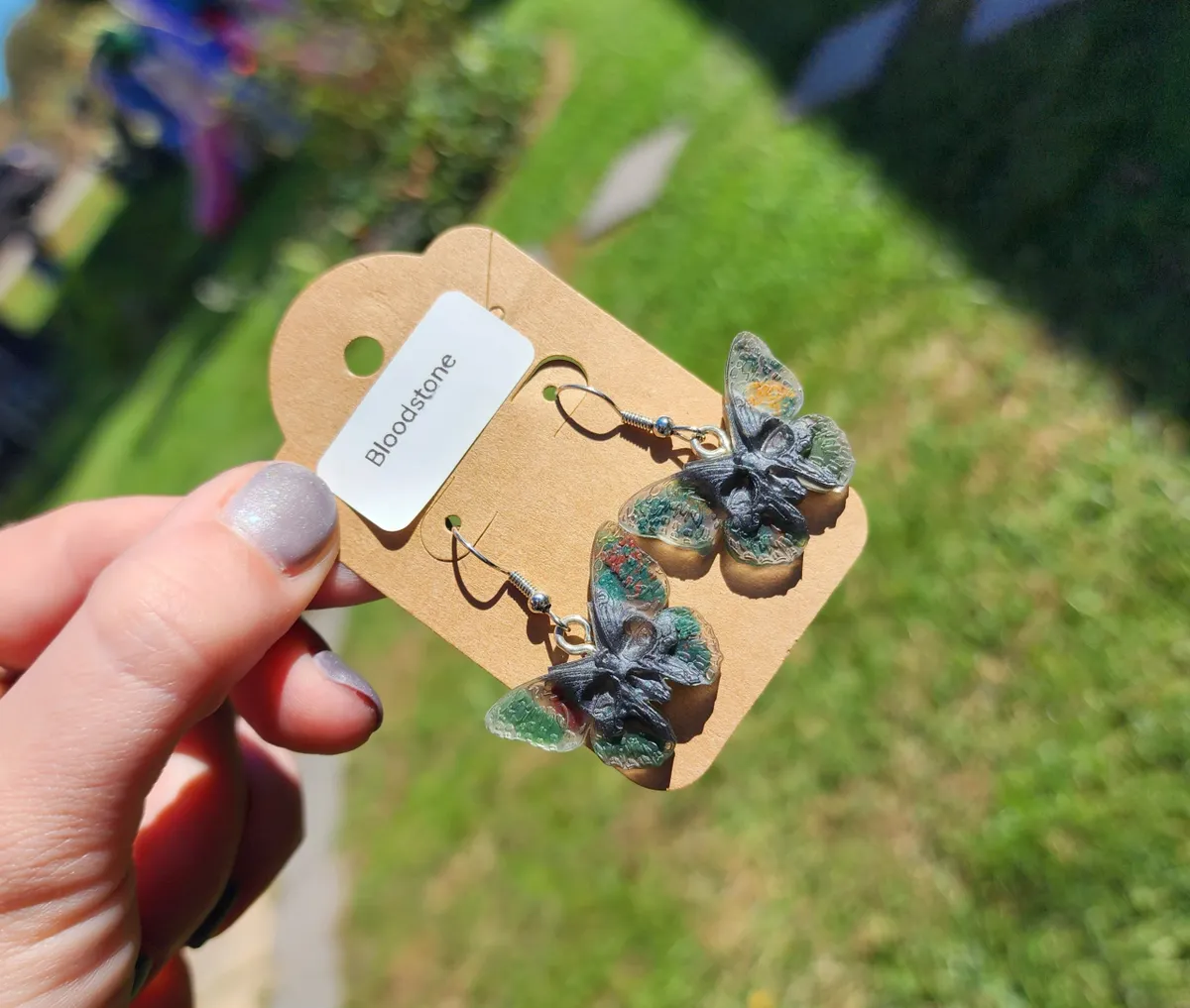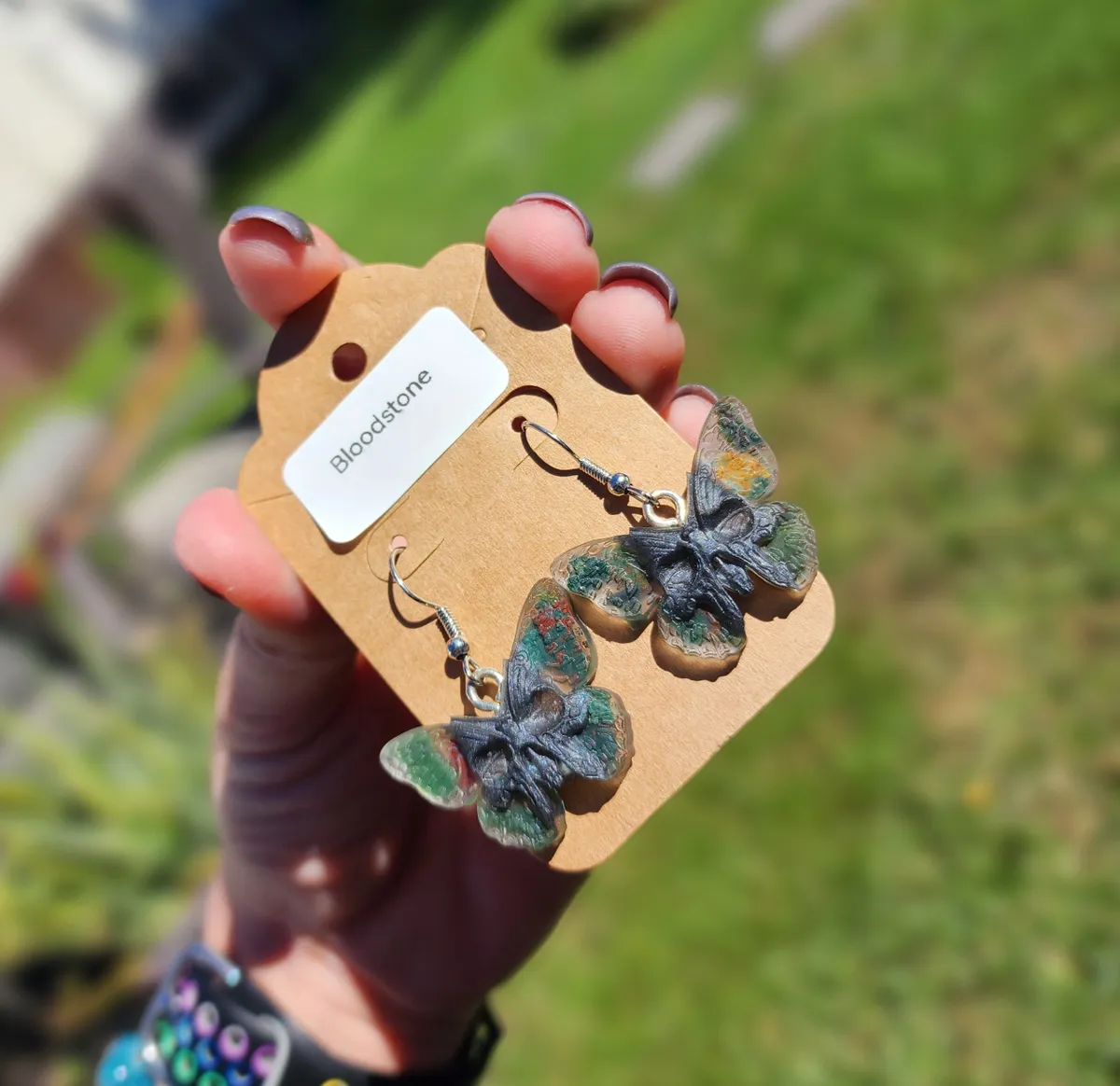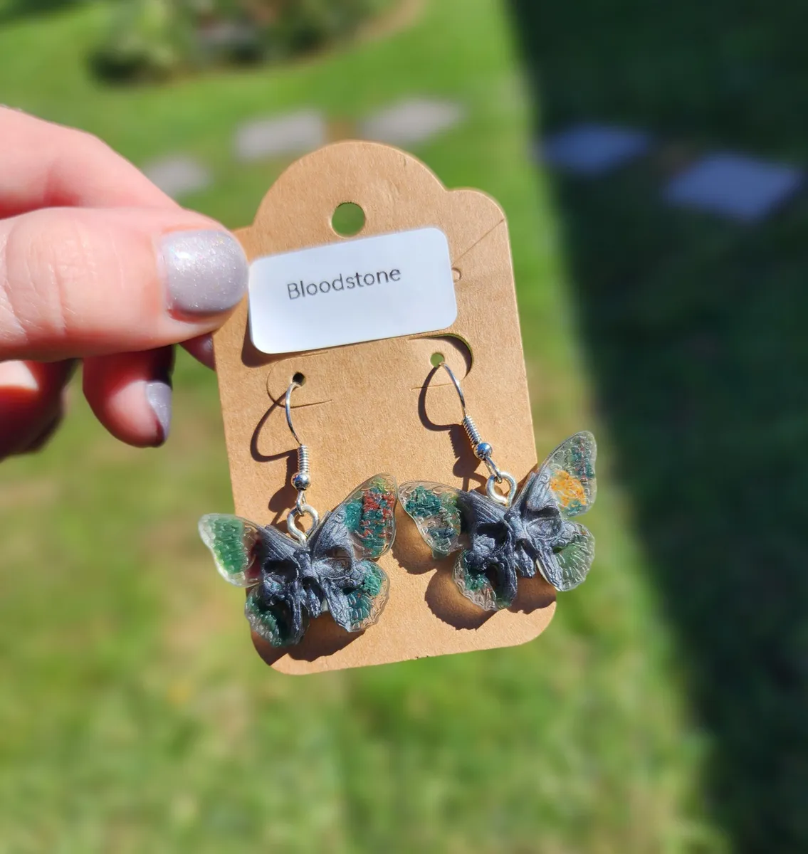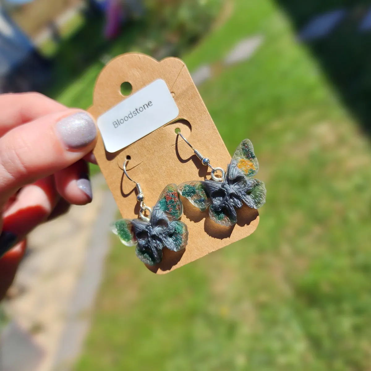 Introducing our stunning Bloodstone Butterfly Skull Earrings, perfect for adding a touch of edgy elegance to any outfit! Each earring features a beautifully detailed skull design adorned with delicate butterfly wings, crafted from epoxy with bloodstone inside for a striking and unique look. These earrings are a must-have accessory for any bold and fearless fashionista. Handmade with care and attention to detail, these earrings are sure to make a statement wherever you go. Treat yourself or a loved one to these one-of-a-kind earrings and stand out from the crowd. Embrace your inner rebel with our Bloodstone Butterfly Skull Earrings today!