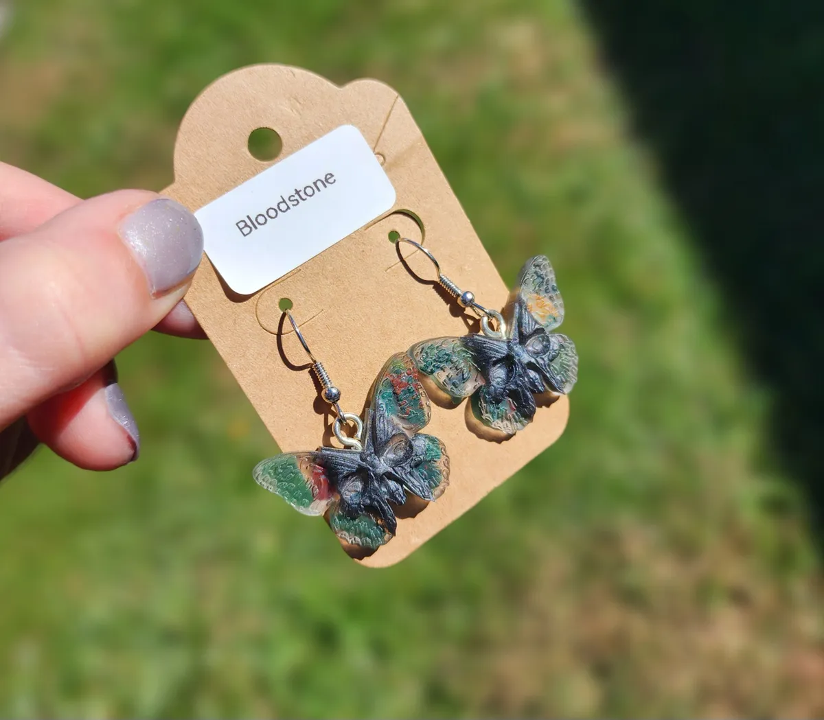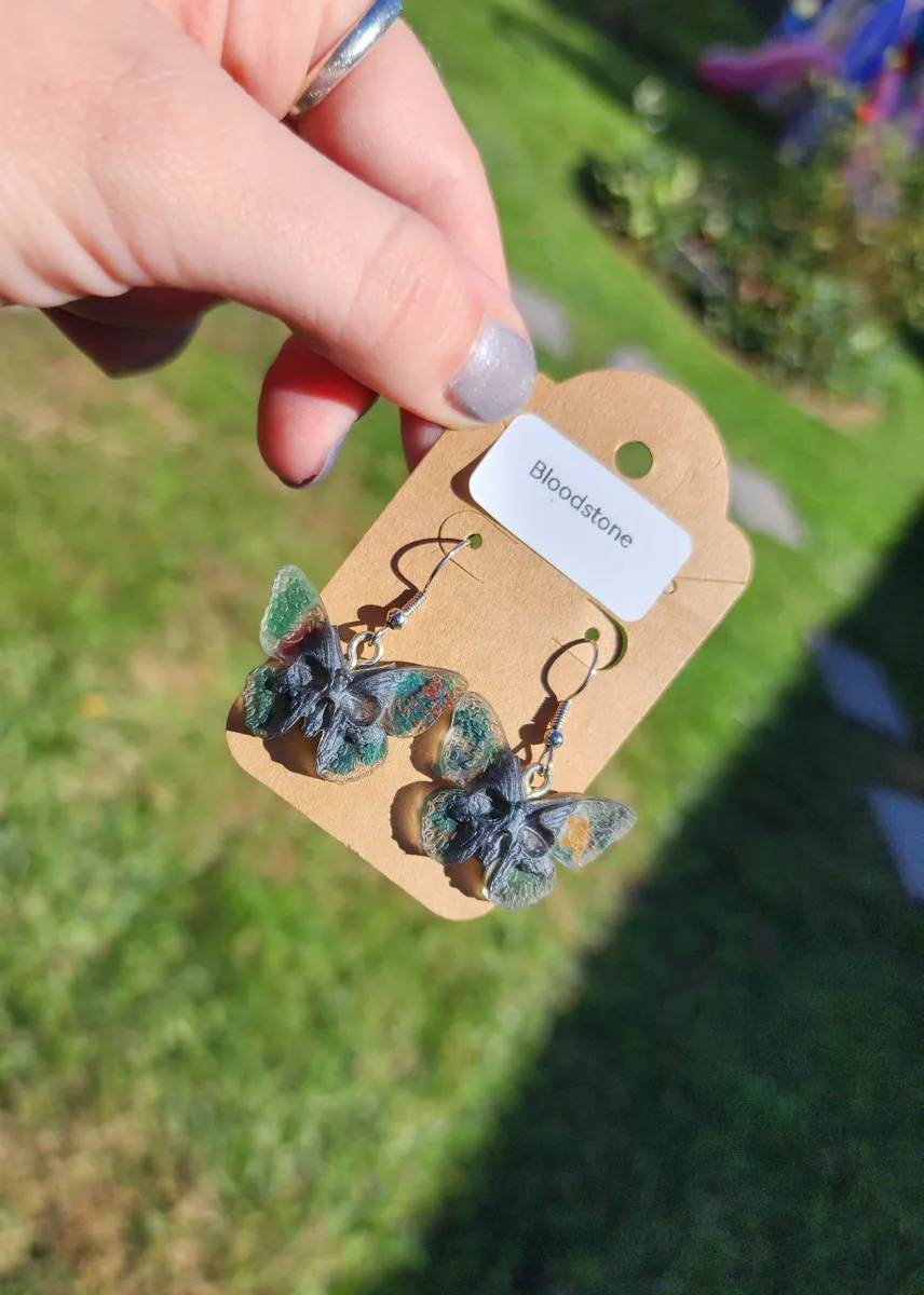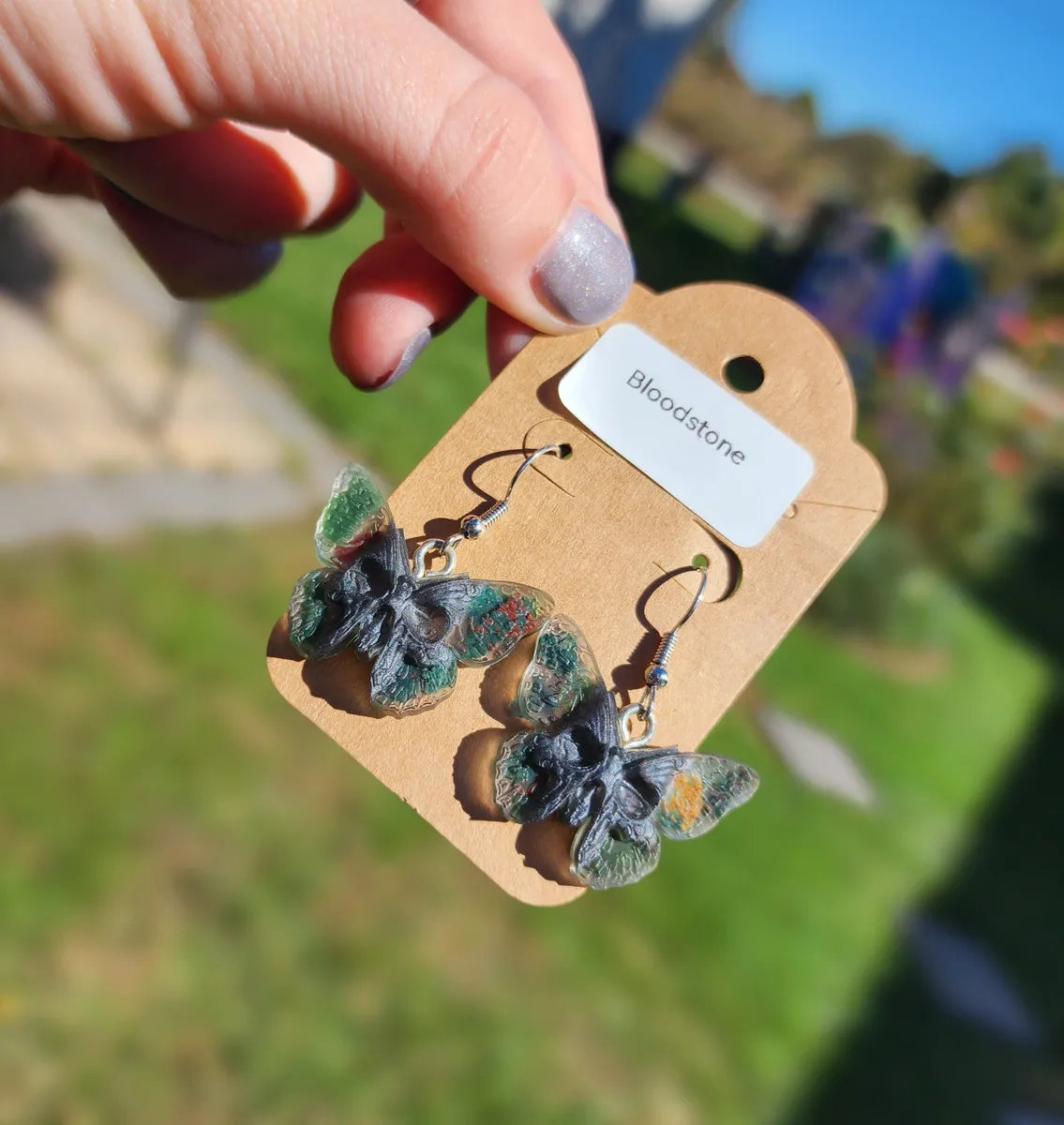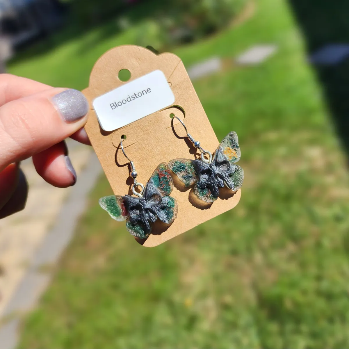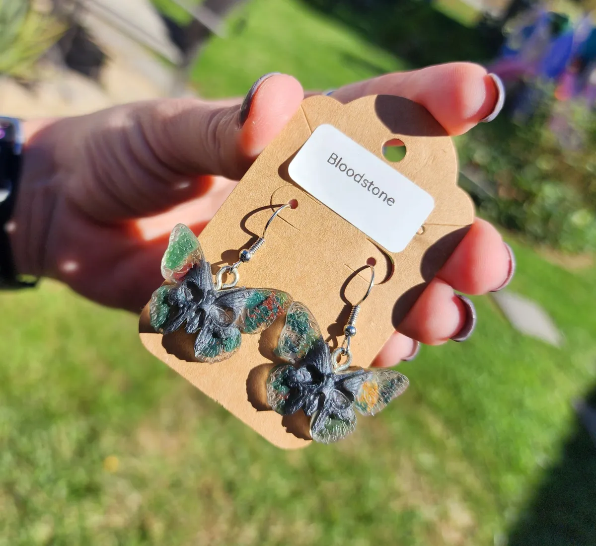 Introducing our stunning Bloodstone Butterfly Skull Earrings, perfect for adding a touch of edgy elegance to any outfit! Each earring features a beautifully detailed skull design adorned with delicate butterfly wings, crafted from epoxy with bloodstone inside for a striking and unique look. These earrings are a must-have accessory for any bold and fearless fashionista. Handmade with care and attention to detail, these earrings are sure to make a statement wherever you go. Treat yourself or a loved one to these one-of-a-kind earrings and stand out from the crowd. Embrace your inner rebel with our Bloodstone Butterfly Skull Earrings today!