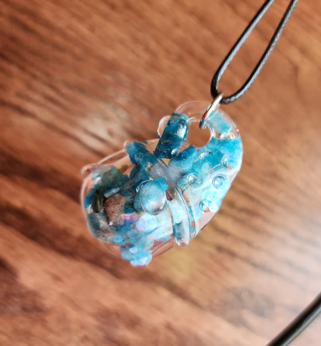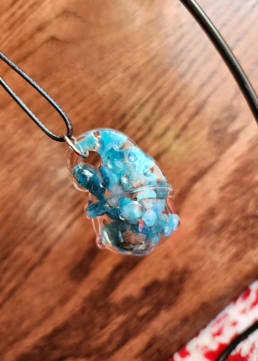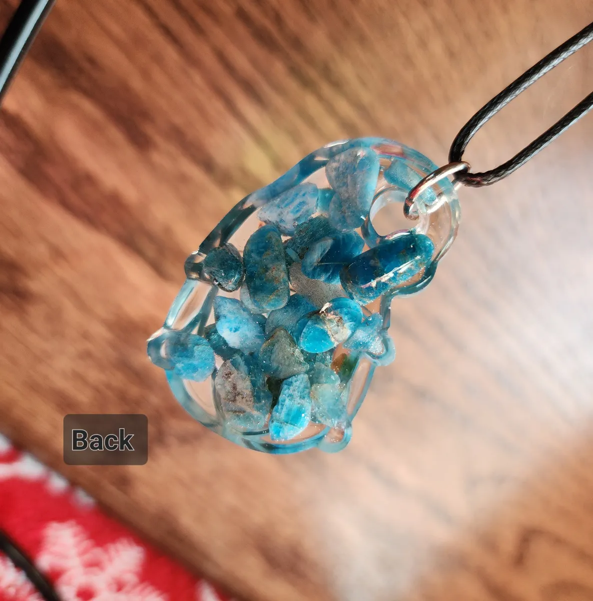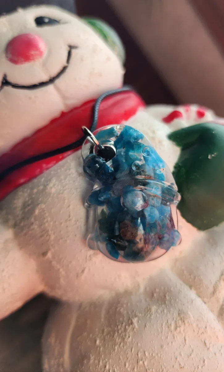 Introducing the enchanting Blue Apatite Gnome Necklace, a whimsical masterpiece that will sprinkle magic into your everyday ensemble! Crafted with care, there is a picture of the necklace showcasing the back side of the gnome, beautifully adorned with mesmerizing blue apatite gemstones. As you wear this unique accessory, be prepared to captivate everyone’s attention with its mysterious allure. The front part, handcrafted with epoxy and genuine stones, it adds a touch of elegance to its playful charm. Whether you’re attending a mystical gathering or simply jazzing up your casual outfit, this gnome necklace is the perfect companion for those who dare to embrace their inner enchantment. Get ready to embark on a magical fashion journey with our Blue Apatite Gnome Necklace!