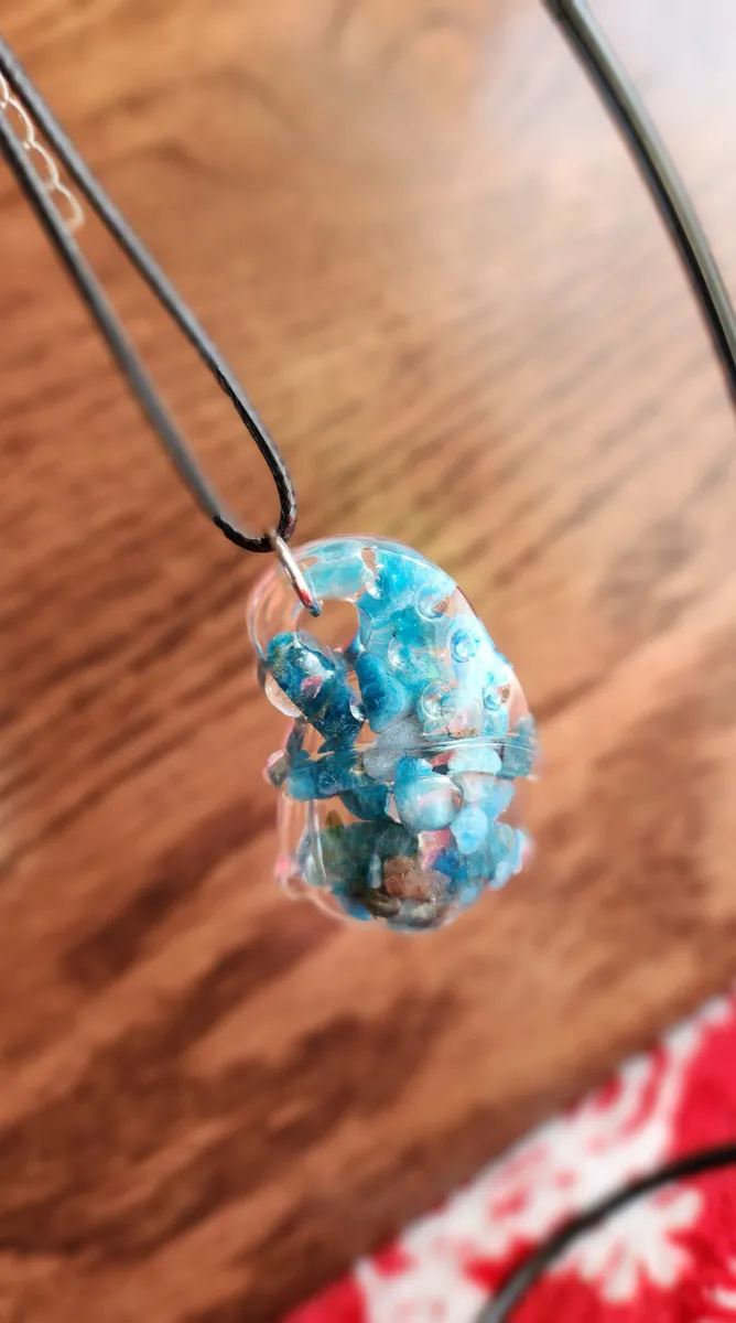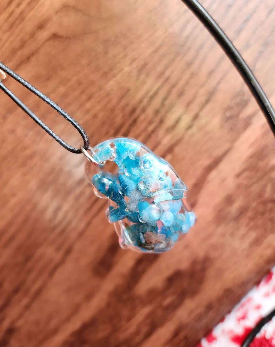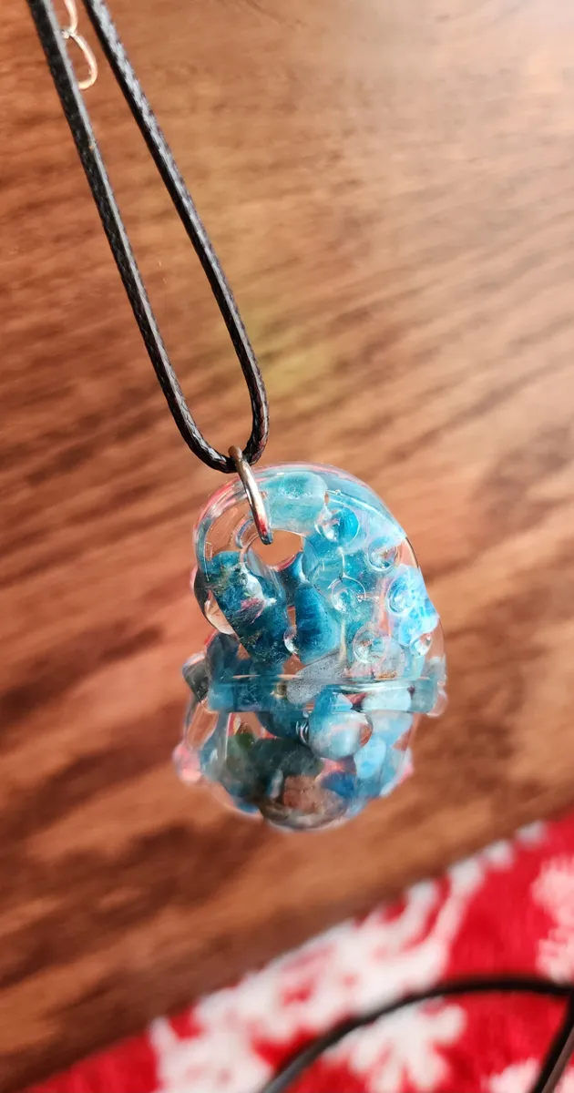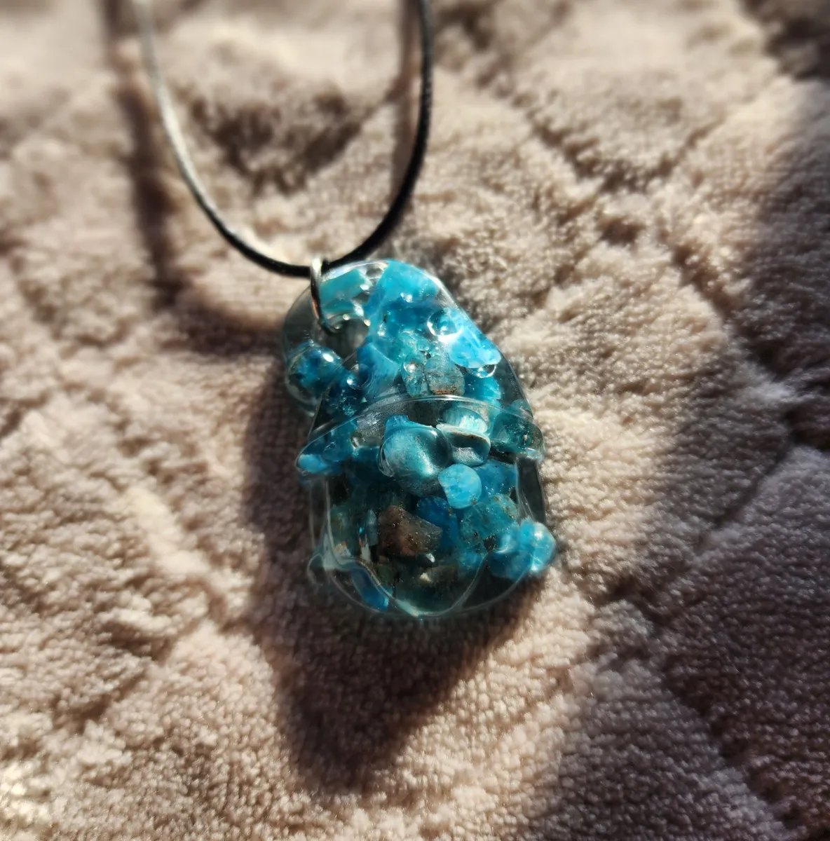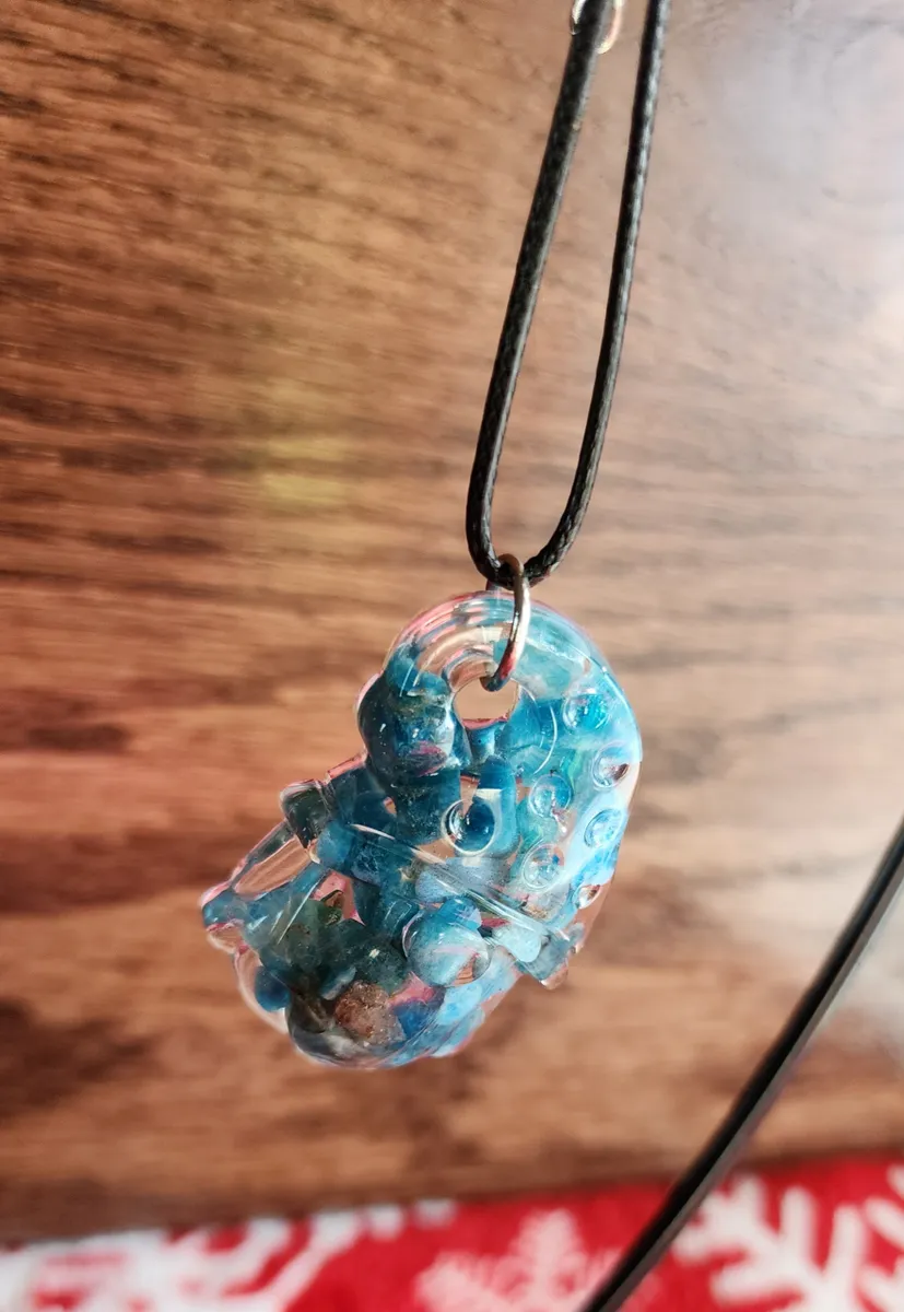 Introducing the enchanting Blue Apatite Gnome Necklace, a whimsical masterpiece that will sprinkle magic into your everyday ensemble! Crafted with care, there is a picture of the necklace showcasing the back side of the gnome, beautifully adorned with mesmerizing blue apatite gemstones. As you wear this unique accessory, be prepared to captivate everyone’s attention with its mysterious allure. The front part, handcrafted with epoxy and genuine stones, it adds a touch of elegance to its playful charm. Whether you’re attending a mystical gathering or simply jazzing up your casual outfit, this gnome necklace is the perfect companion for those who dare to embrace their inner enchantment. Get ready to embark on a magical fashion journey with our Blue Apatite Gnome Necklace!