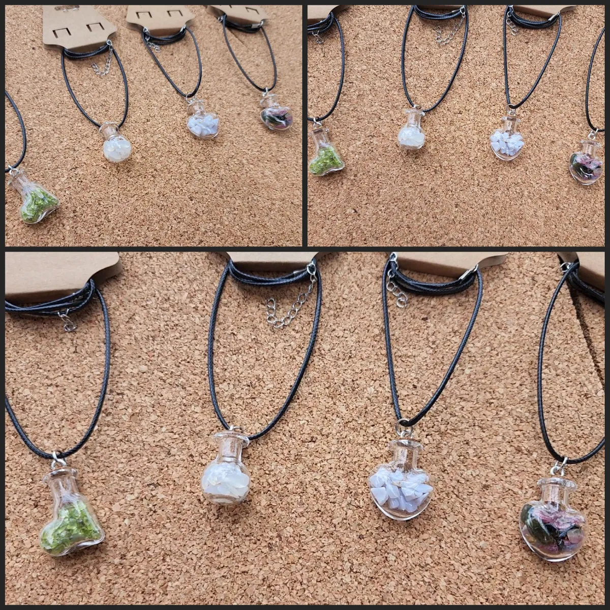 Introducing our exquisite collection of Crystal Filled Glass Bottle Necklaces, designed to radiate elegance and capture the essence of natural gemstones. Each necklace is meticulously handcrafted with love and attention to detail, making them a perfect accessory for any occasion.
