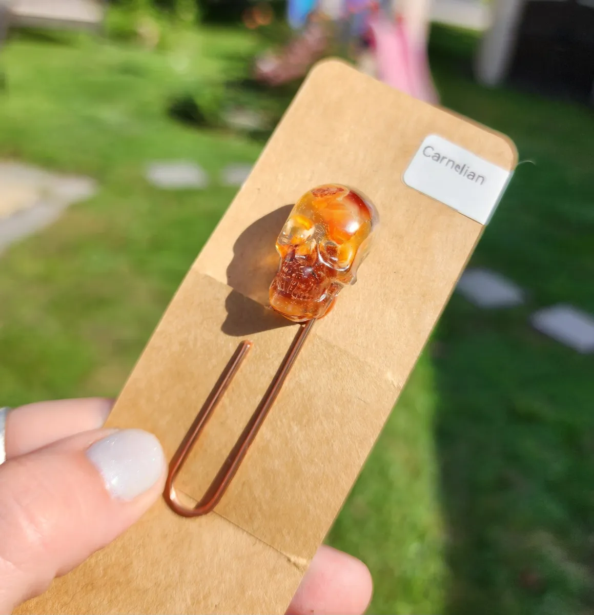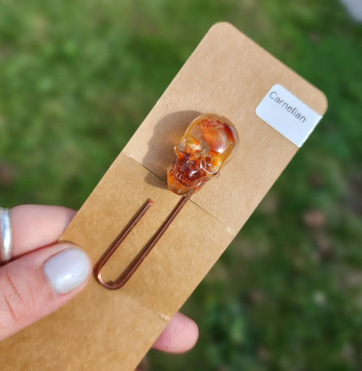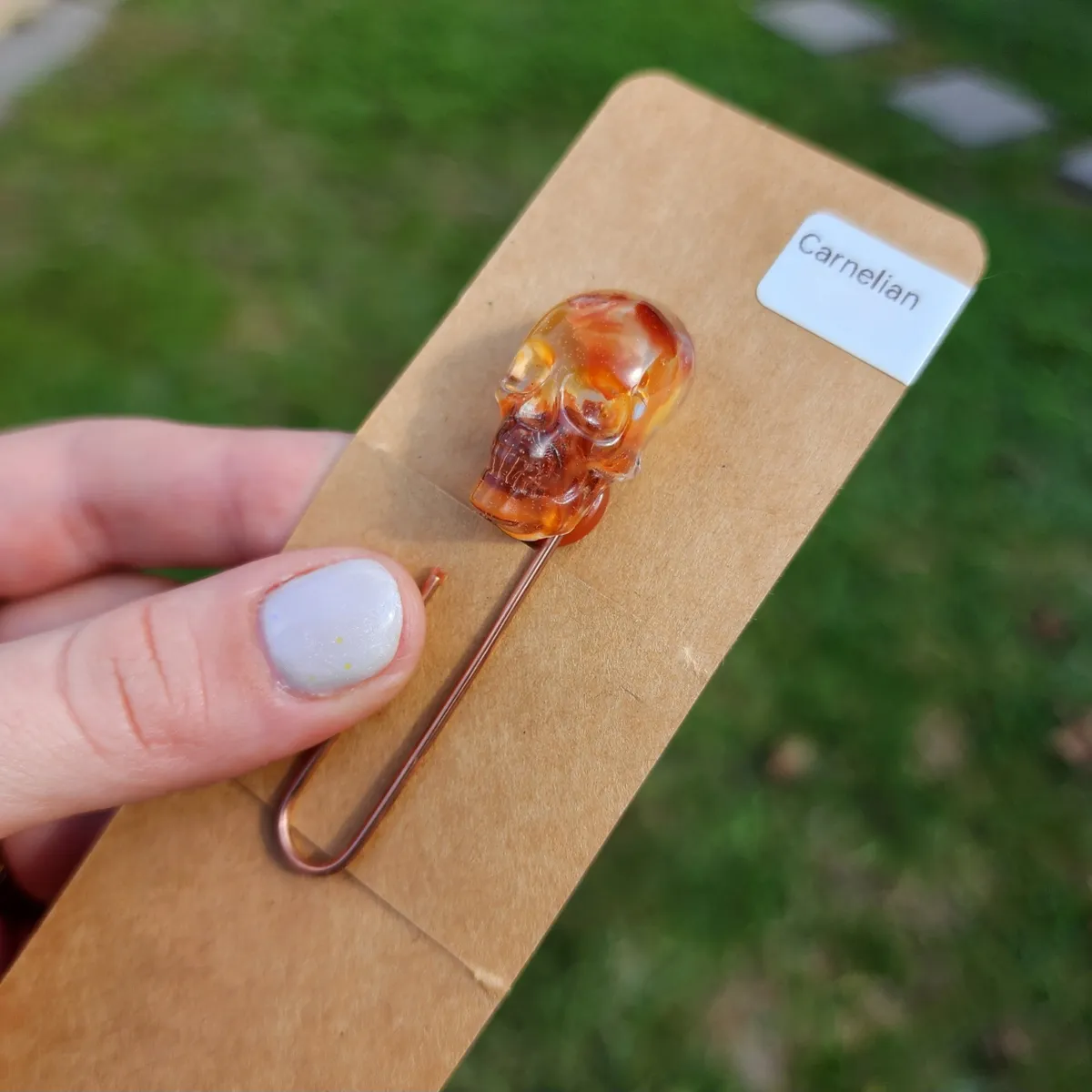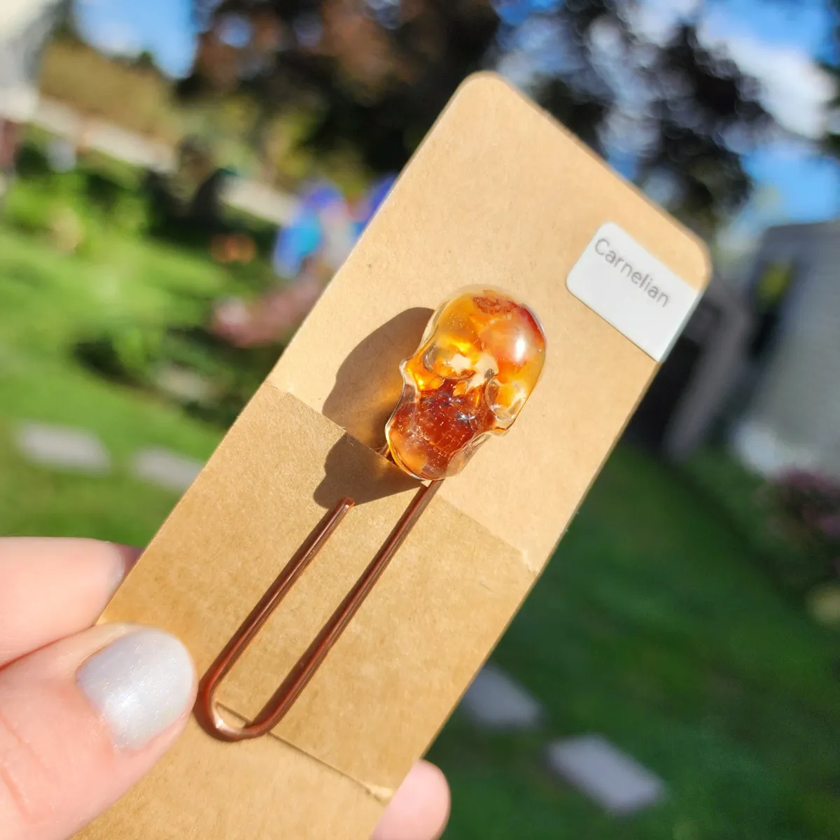 Add a touch of macabre elegance to your reading experience with our Carnelian Skull Paperclip Bookmark! This unique and eye-catching bookmark features a stunning epoxy skull with Carnelian stones inside that adds a touch of gothic charm to any book. The paperclip design ensures that your page stays securely marked while adding a touch of style to your reading routine. Perfect for book lovers who appreciate the dark and mysterious, this bookmark is a must-have accessory for any avid reader. Treat yourself or gift it to a friend who loves all things spooky and stylish. Upgrade your reading game with our Carnelian Skull Paperclip Bookmark today!