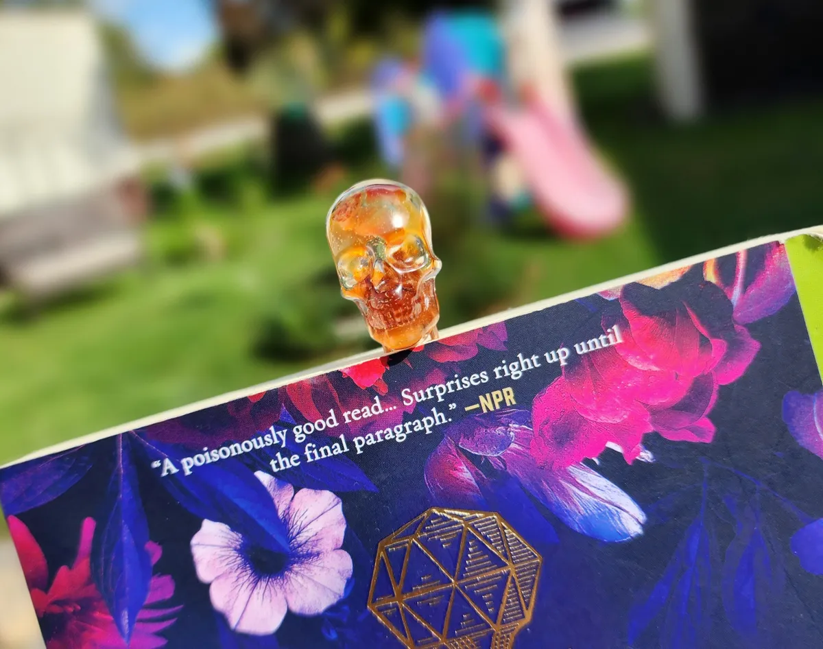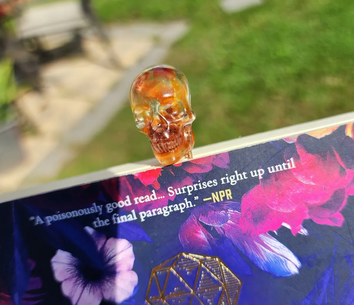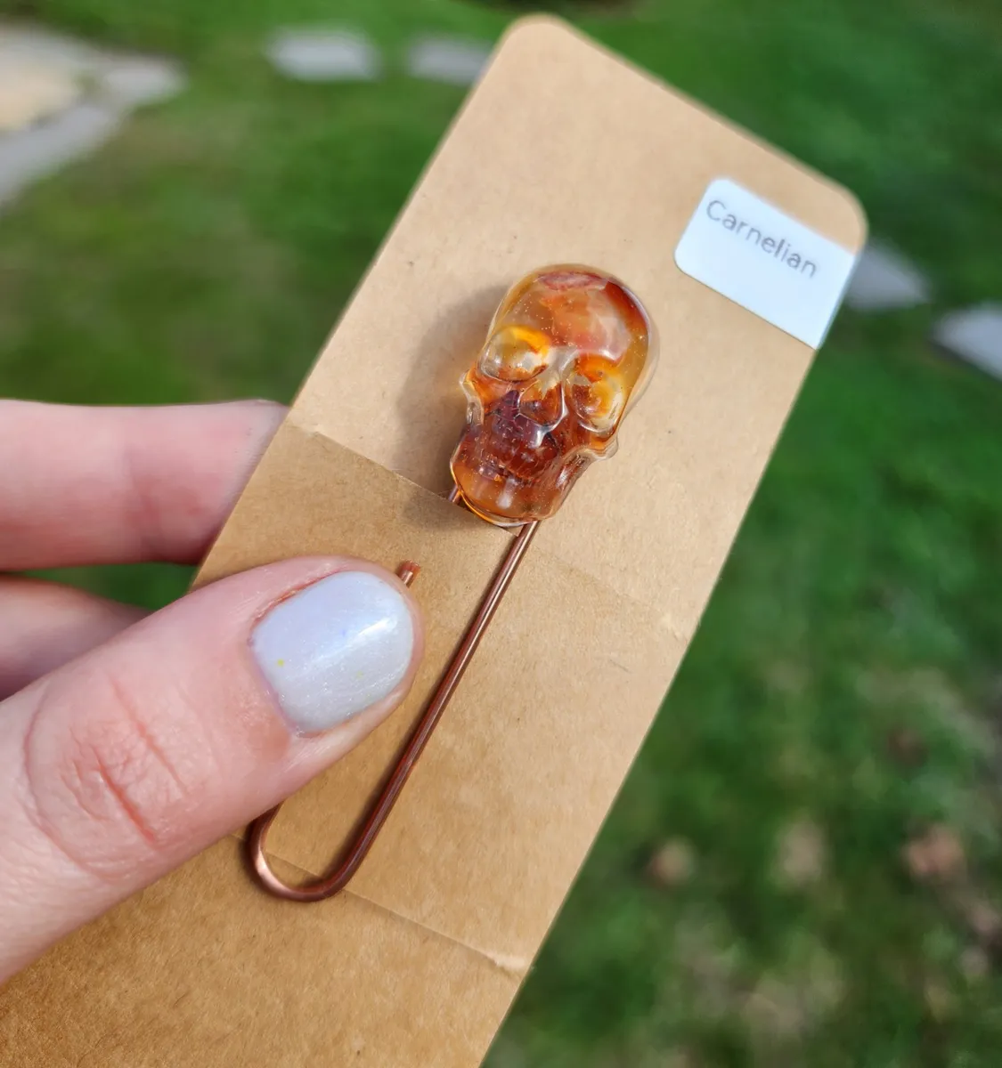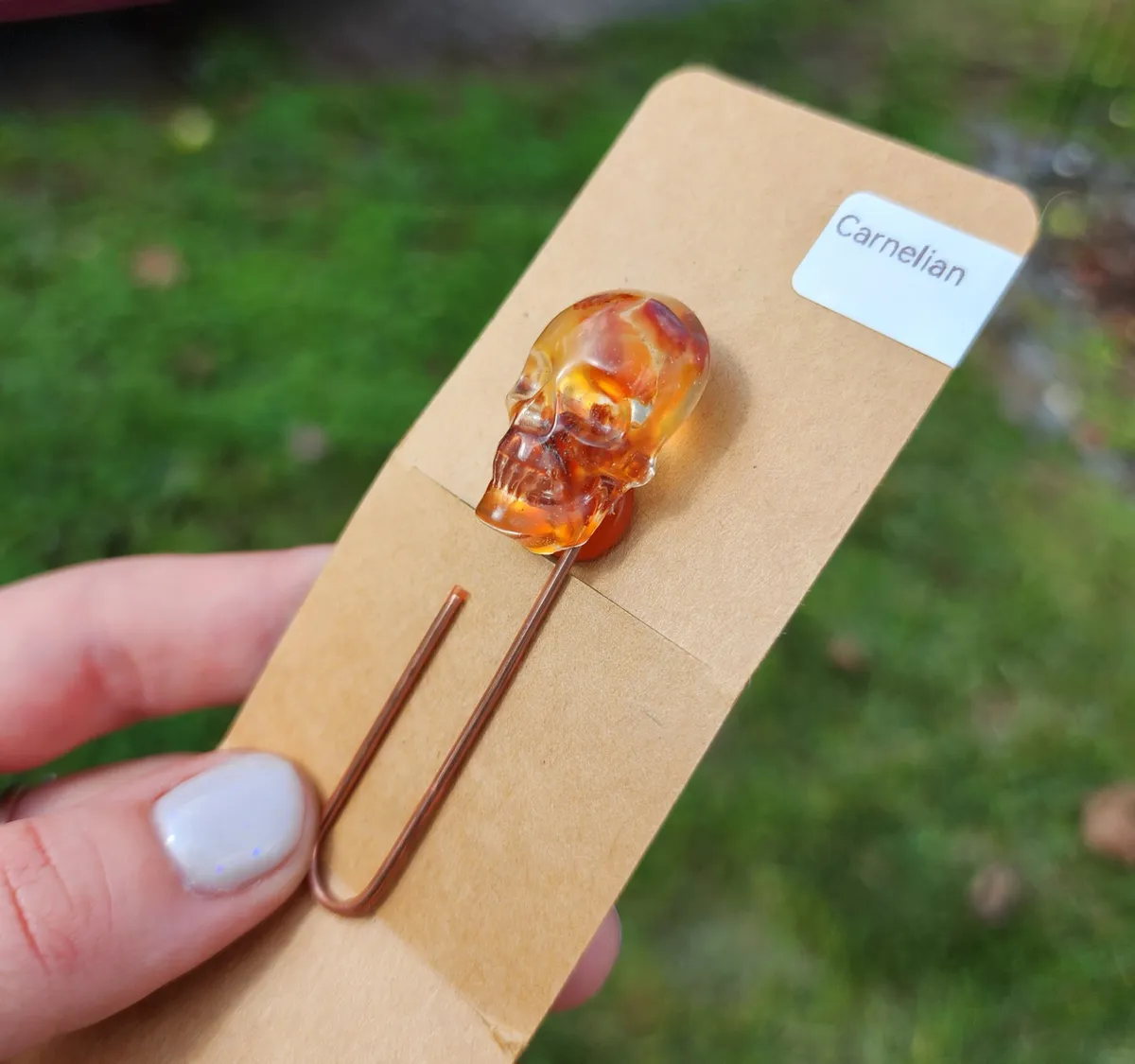 Add a touch of macabre elegance to your reading experience with our Carnelian Skull Paperclip Bookmark! This unique and eye-catching bookmark features a stunning epoxy skull with Carnelian stones inside that adds a touch of gothic charm to any book. The paperclip design ensures that your page stays securely marked while adding a touch of style to your reading routine. Perfect for book lovers who appreciate the dark and mysterious, this bookmark is a must-have accessory for any avid reader. Treat yourself or gift it to a friend who loves all things spooky and stylish. Upgrade your reading game with our Carnelian Skull Paperclip Bookmark today!