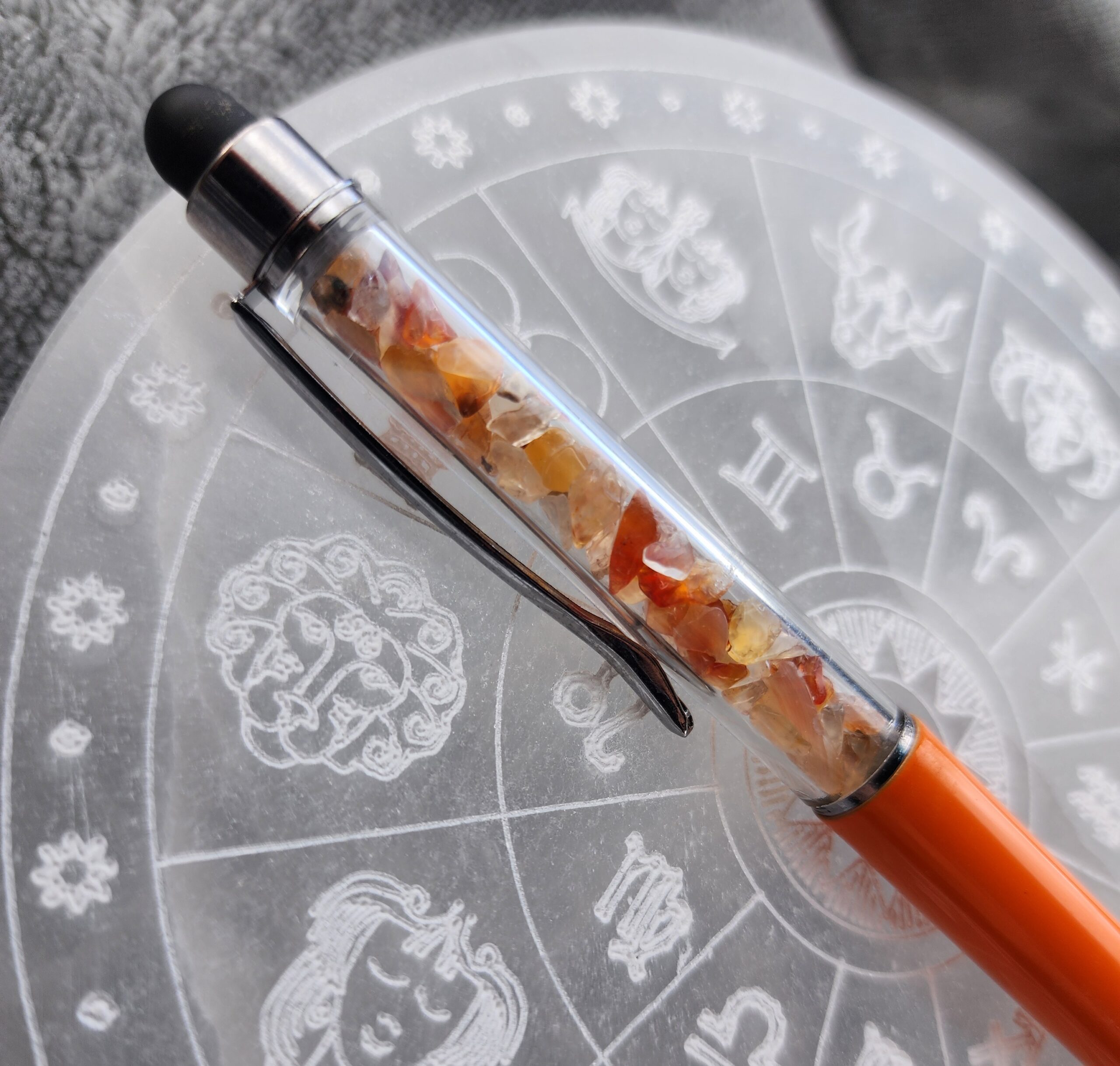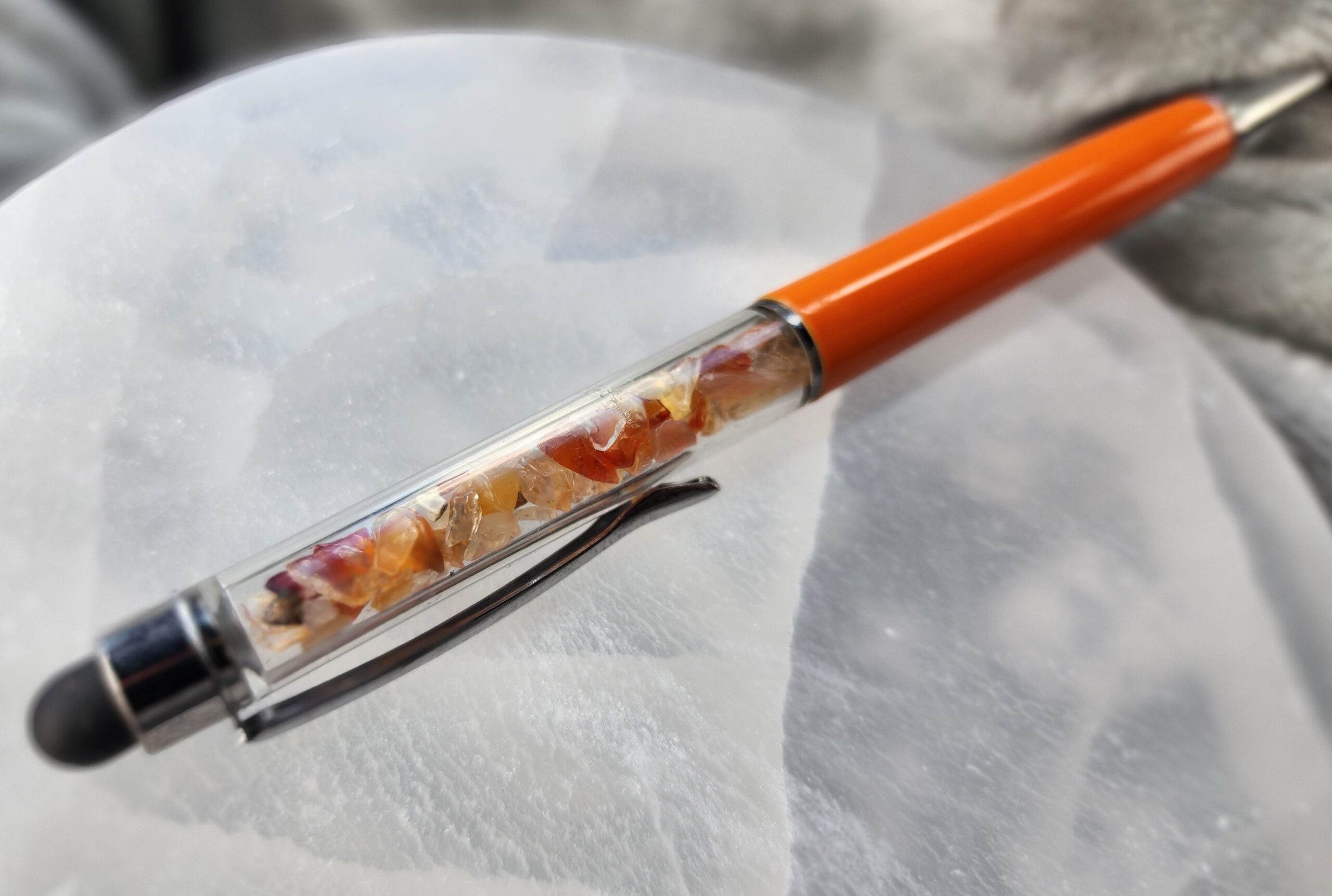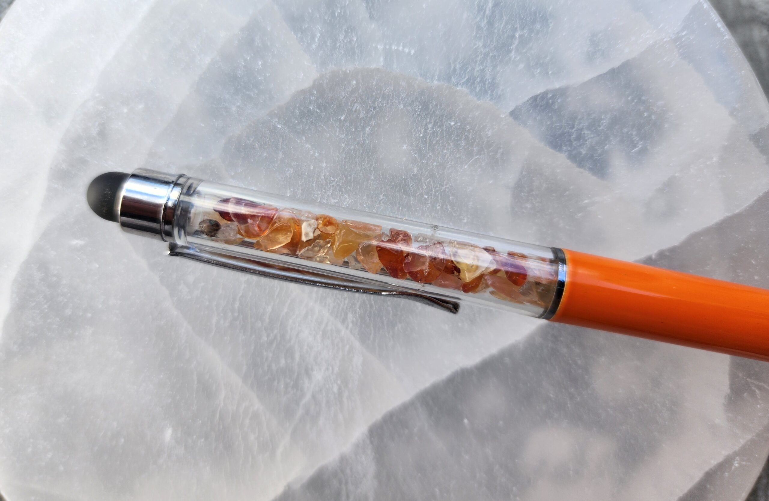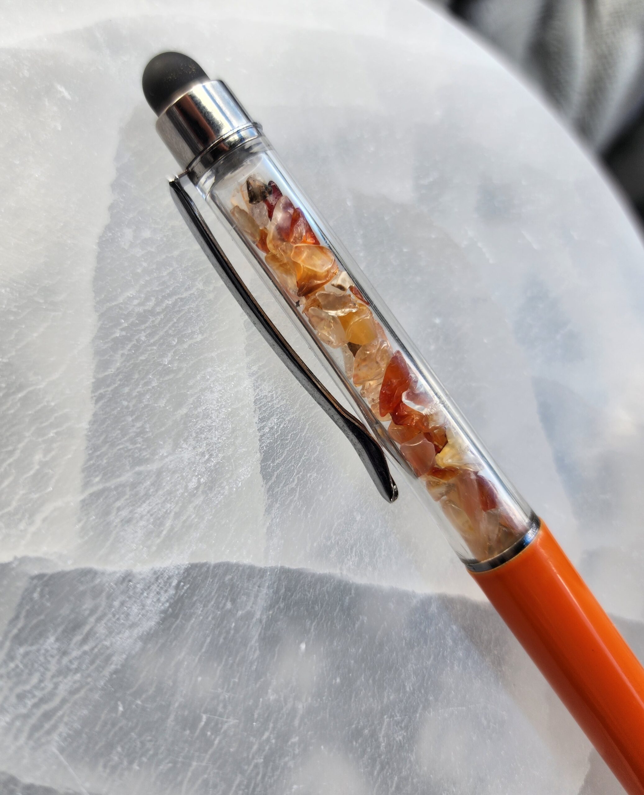 Infused with the warm glow of carnelian, this pen is more than a tool — it’s a little beacon of creativity. Scribble your thoughts, sketch your dreams, or swipe through your digital universe with smooth, effortless grace. Balanced and beautiful, it helps you find your flow, one inspired line at a time.