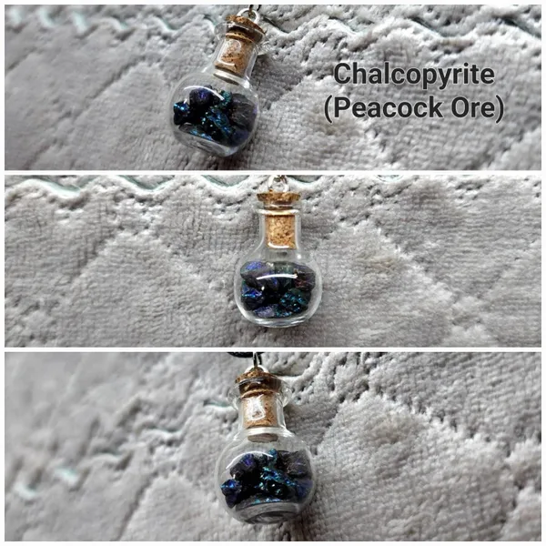 Each necklace showcases a delicate glass bottle pendant that encapsulates the natural beauty of these precious crystals.