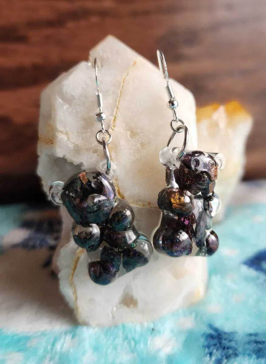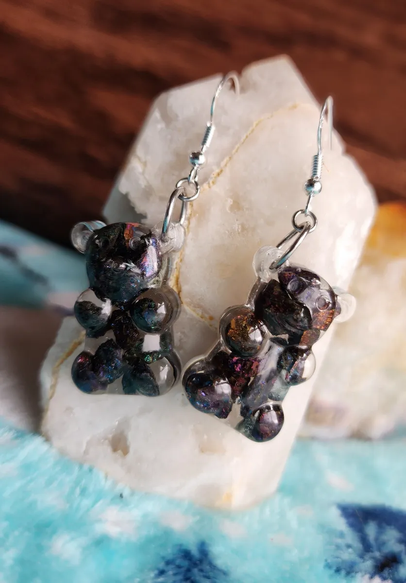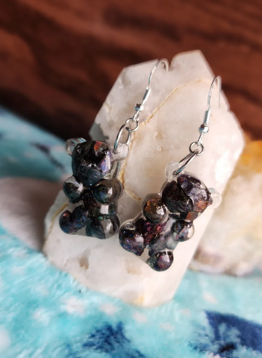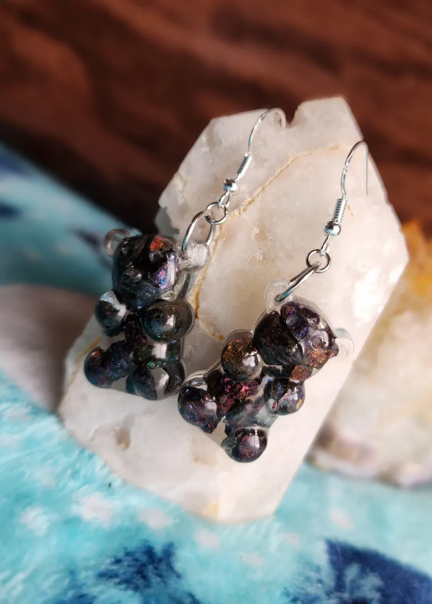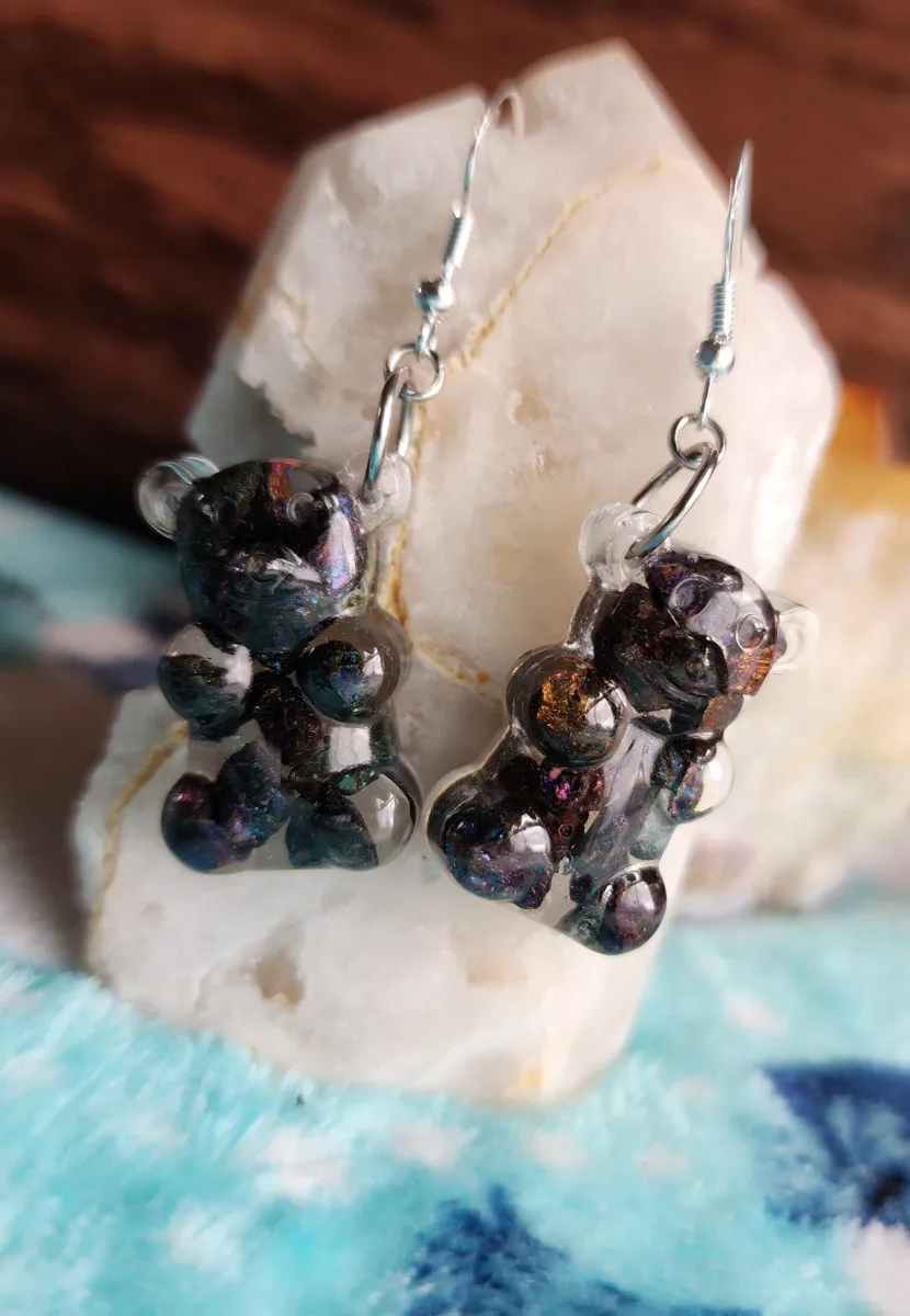 Crafted with love, each earring features a colorful gummy bear made from epoxy and sparkling Chalcopyrite (Peacock Ore) stones, adding a touch of enchantment to your style. Resting atop a rock, these adorable accessories showcase the wonders of Earth’s treasures in the most fashionable way.