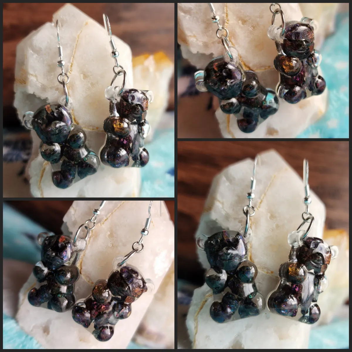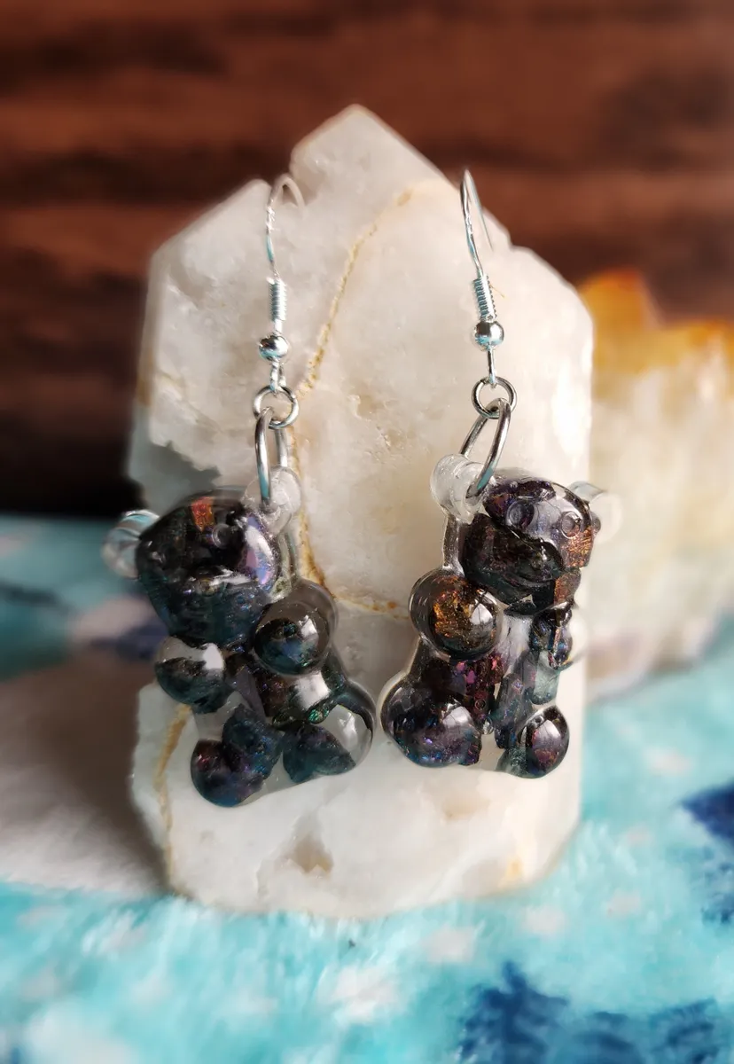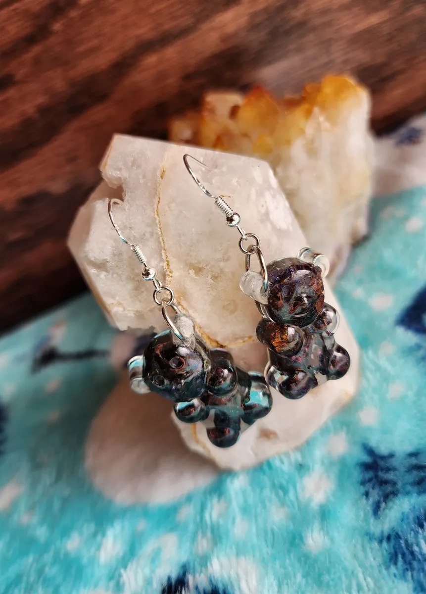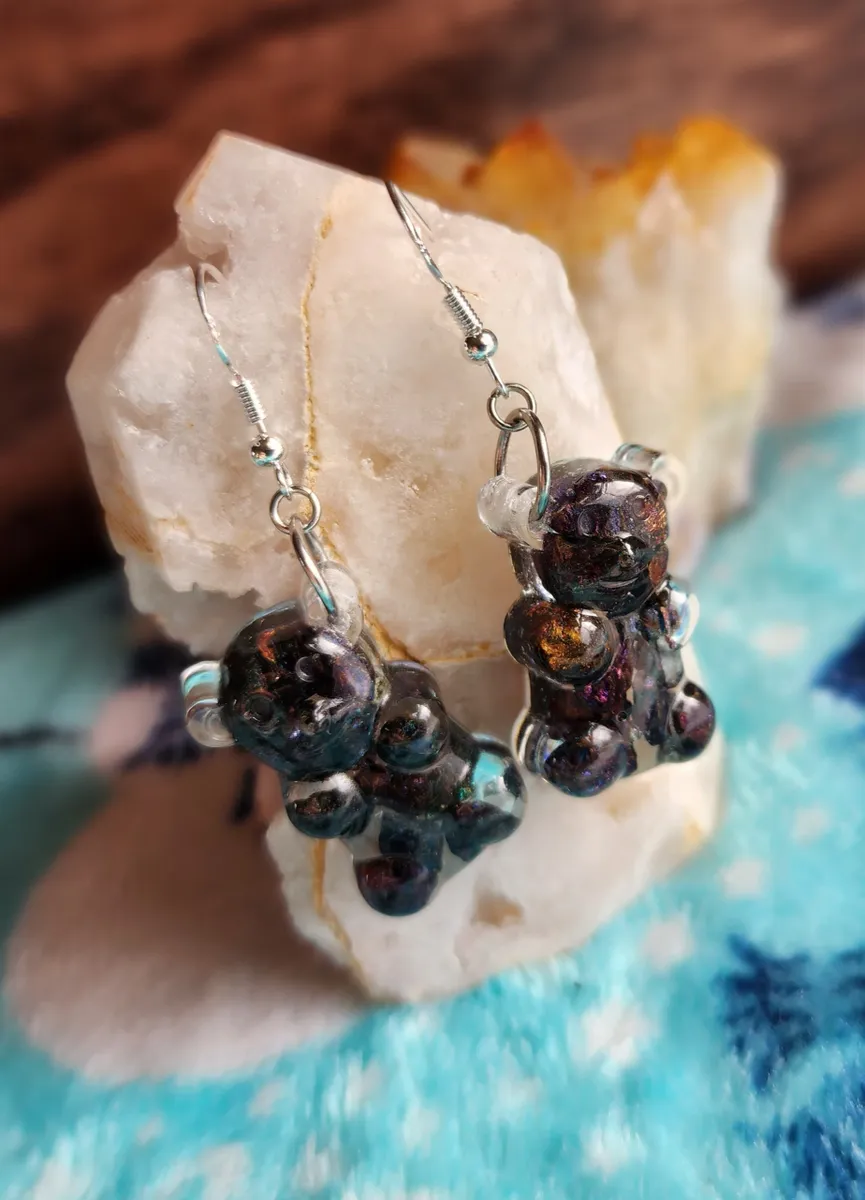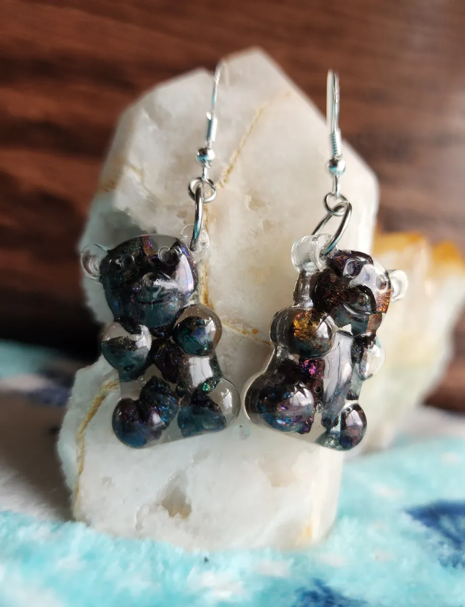 Crafted with love, each earring features a colorful gummy bear made from epoxy and sparkling Chalcopyrite (Peacock Ore) stones, adding a touch of enchantment to your style. Resting atop a rock, these adorable accessories showcase the wonders of Earth’s treasures in the most fashionable way.