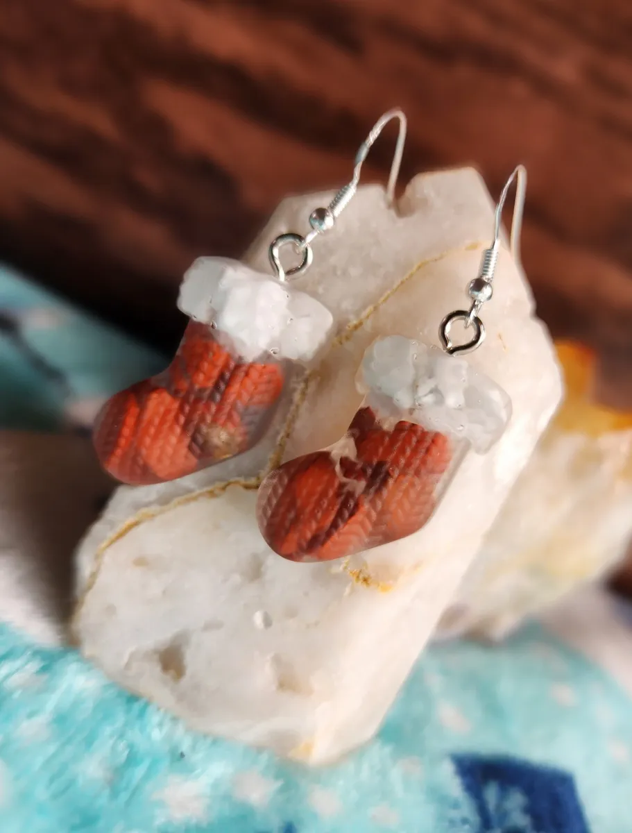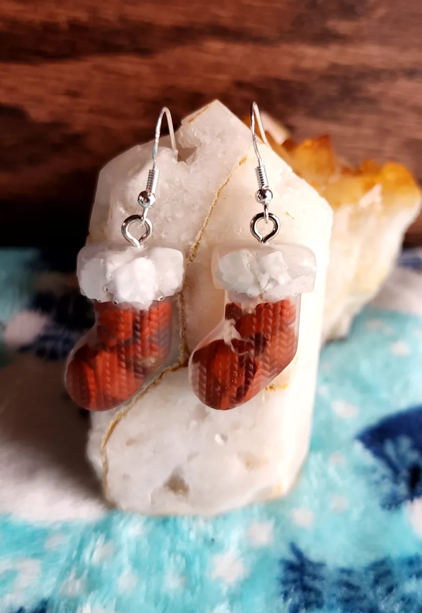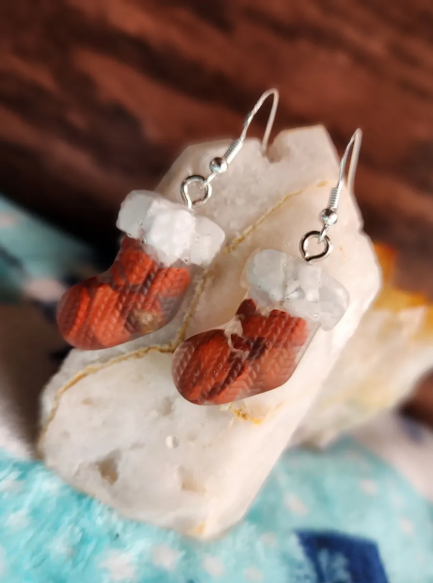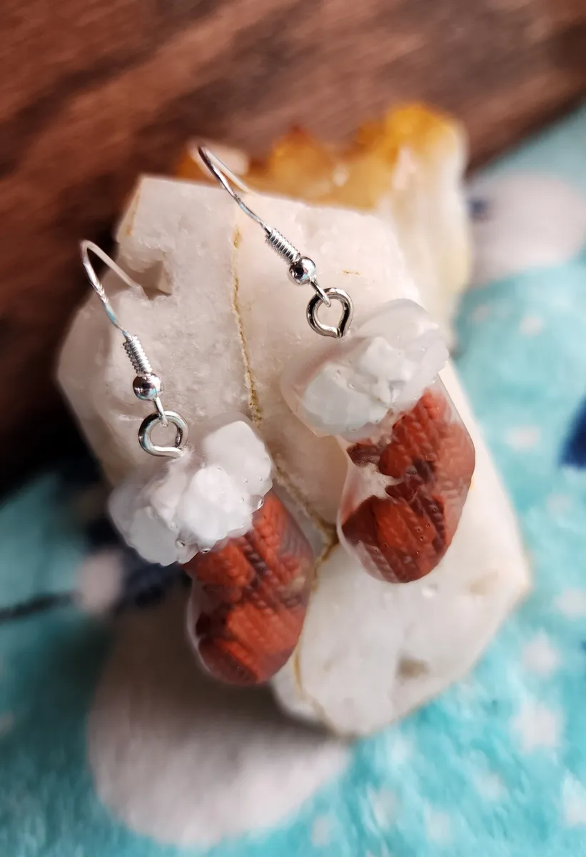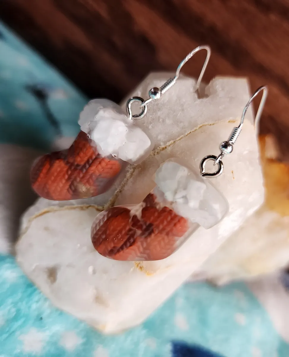 Introducing our Chunky Red Jasper and Howlite Stocking Earrings, the perfect accessory to add a dash of quirkiness to any outfit! Crafted with love, these earrings are a unique blend of epoxy and stones, resulting in an eye-catching design that is sure to turn heads. Picture this: a delightful combination of vibrant red jasper stones and calming howlite stones dangling from your ears like miniature stockings. So why settle for ordinary when you can rock these playful earrings? Grab a pair now and let your ears do the talking!
