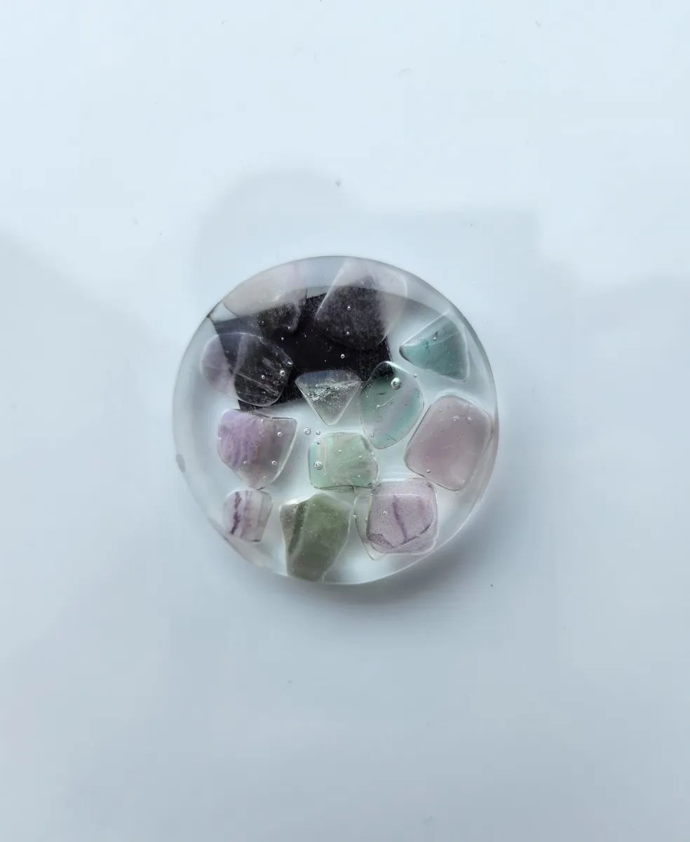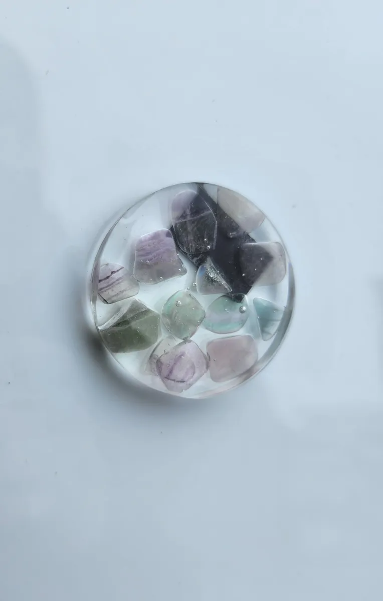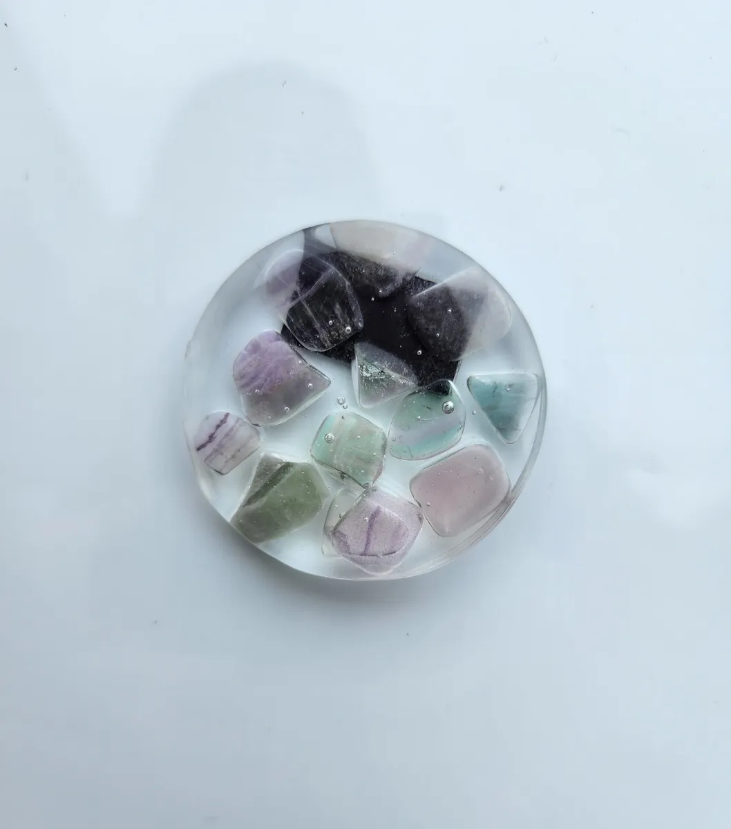 Add a touch of natural beauty to your space with our Fluorite Circle Magnet! This epoxy circle is filled with an array of vibrant colored Fluorite stones, creating a stunning and eye-catching display. Perfect for adding a pop of color to your fridge, locker, or any magnetic surface, this unique magnet is sure to spark joy and conversation wherever it’s placed. Handcrafted with care and attention to detail, each Fluorite Circle Magnet is a one-of-a-kind piece of art that will brighten up your day every time you see it. Bring a little piece of nature into your home with this charming and whimsical magnet!