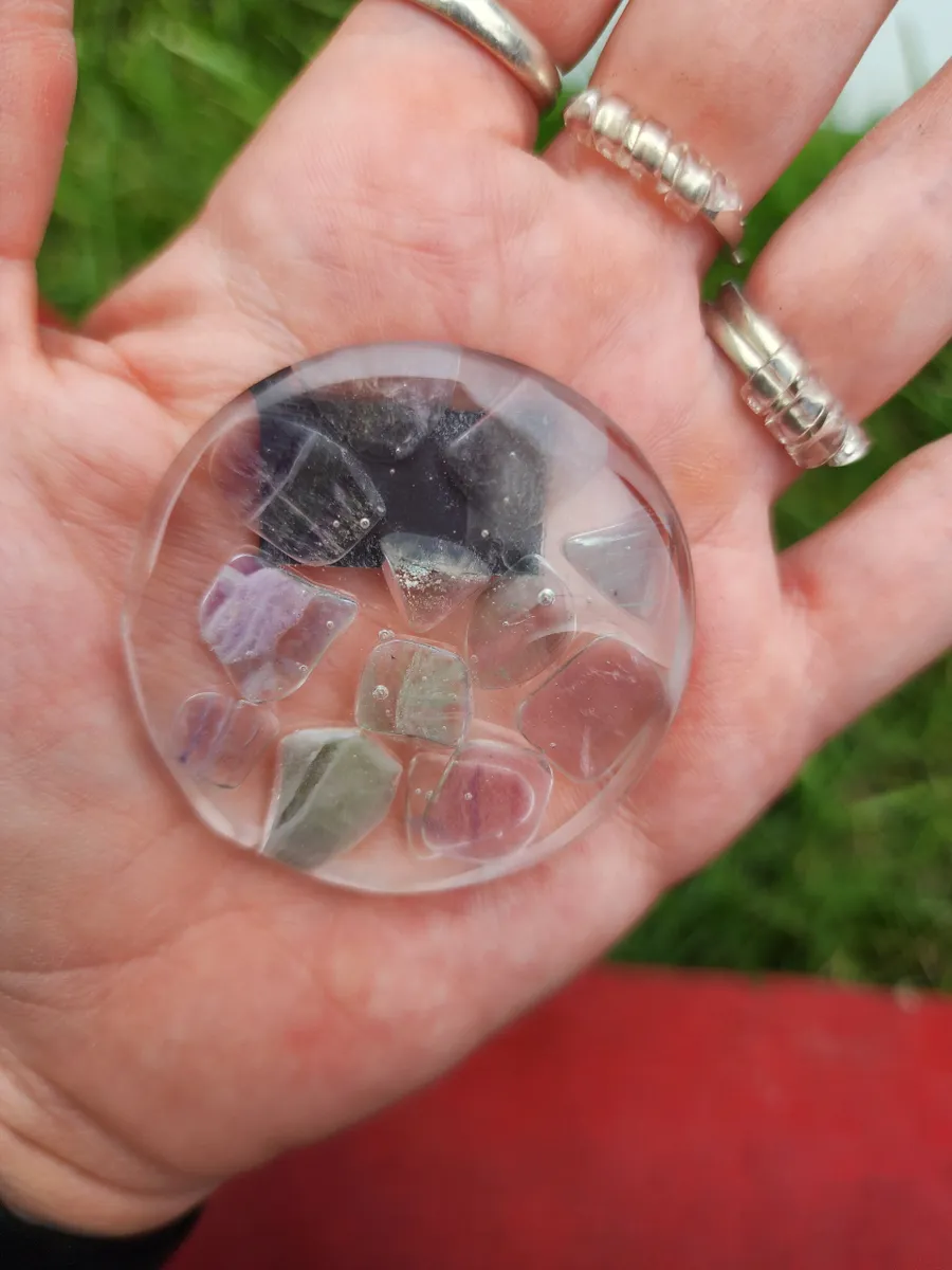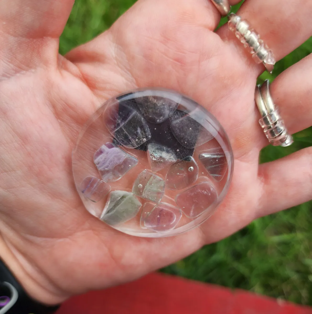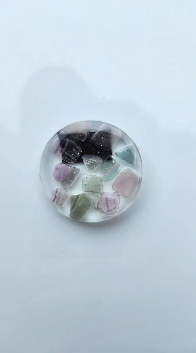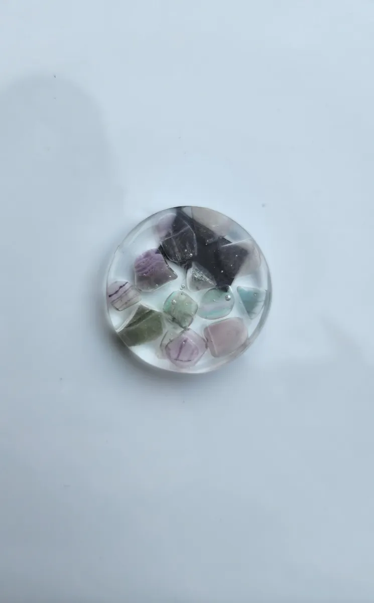 Add a touch of natural beauty to your space with our Fluorite Circle Magnet! This epoxy circle is filled with an array of vibrant colored Fluorite stones, creating a stunning and eye-catching display. Perfect for adding a pop of color to your fridge, locker, or any magnetic surface, this unique magnet is sure to spark joy and conversation wherever it’s placed. Handcrafted with care and attention to detail, each Fluorite Circle Magnet is a one-of-a-kind piece of art that will brighten up your day every time you see it. Bring a little piece of nature into your home with this charming and whimsical magnet!