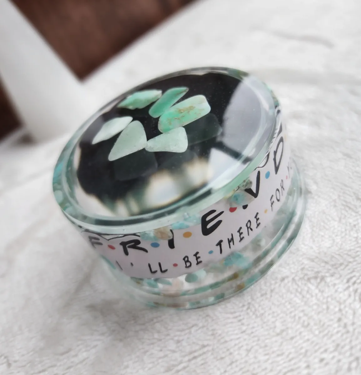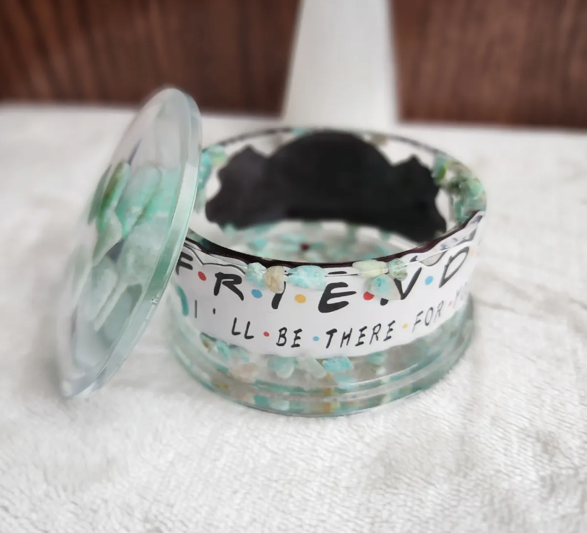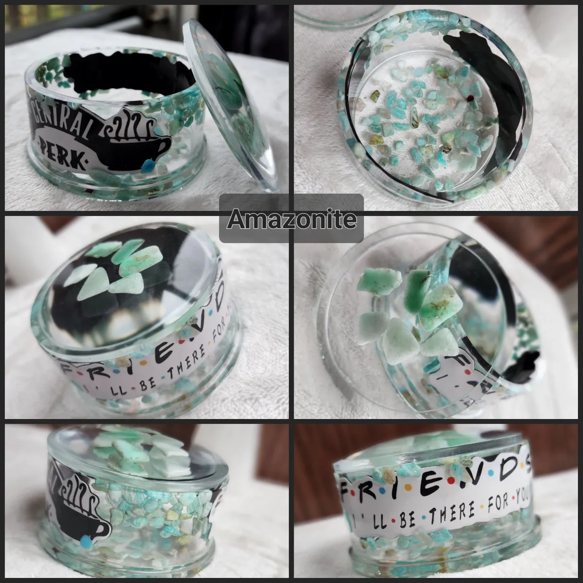 Introducing our Friends Inspired Amazonite Trinket Bowl with Lid, the perfect fusion of style and functionality for all the craft lovers out there! This eye-catching bowl is a delightful addition to your home décor, inspired by the iconic TV show Friends. The collage of photos on the product image showcases the magical contents of a jar, featuring mesmerizing green and white glass Amazonite stones. Crafted with utmost care, this witty trinket bowl with a lid is ideal for storing your beloved trinkets, jewelry, or even as a quirky candy dish. Bring a touch of nostalgia and elegance to your space with this unique piece from our craft business collection.