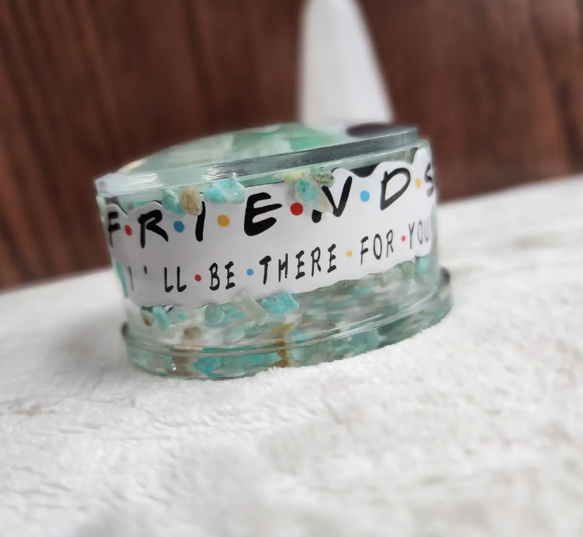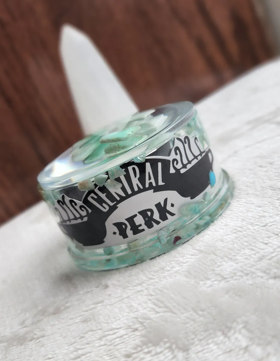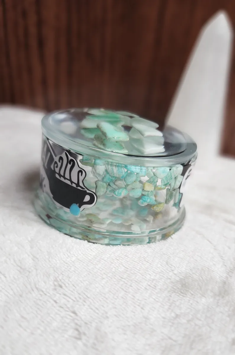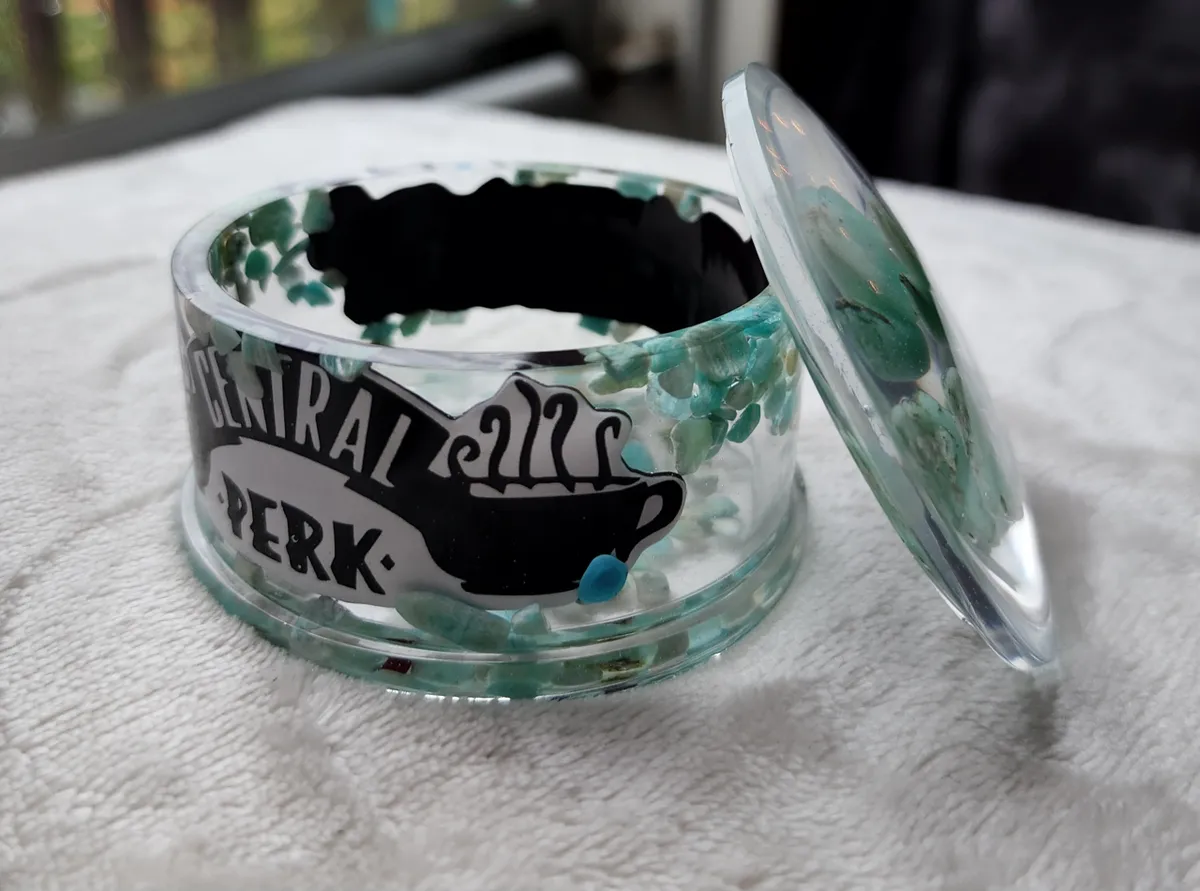 Introducing our Friends Inspired Amazonite Trinket Bowl with Lid, the perfect fusion of style and functionality for all the craft lovers out there! This eye-catching bowl is a delightful addition to your home décor, inspired by the iconic TV show Friends. The collage of photos on the product image showcases the magical contents of a jar, featuring mesmerizing green and white glass Amazonite stones. Crafted with utmost care, this witty trinket bowl with a lid is ideal for storing your beloved trinkets, jewelry, or even as a quirky candy dish. Bring a touch of nostalgia and elegance to your space with this unique piece from our craft business collection.