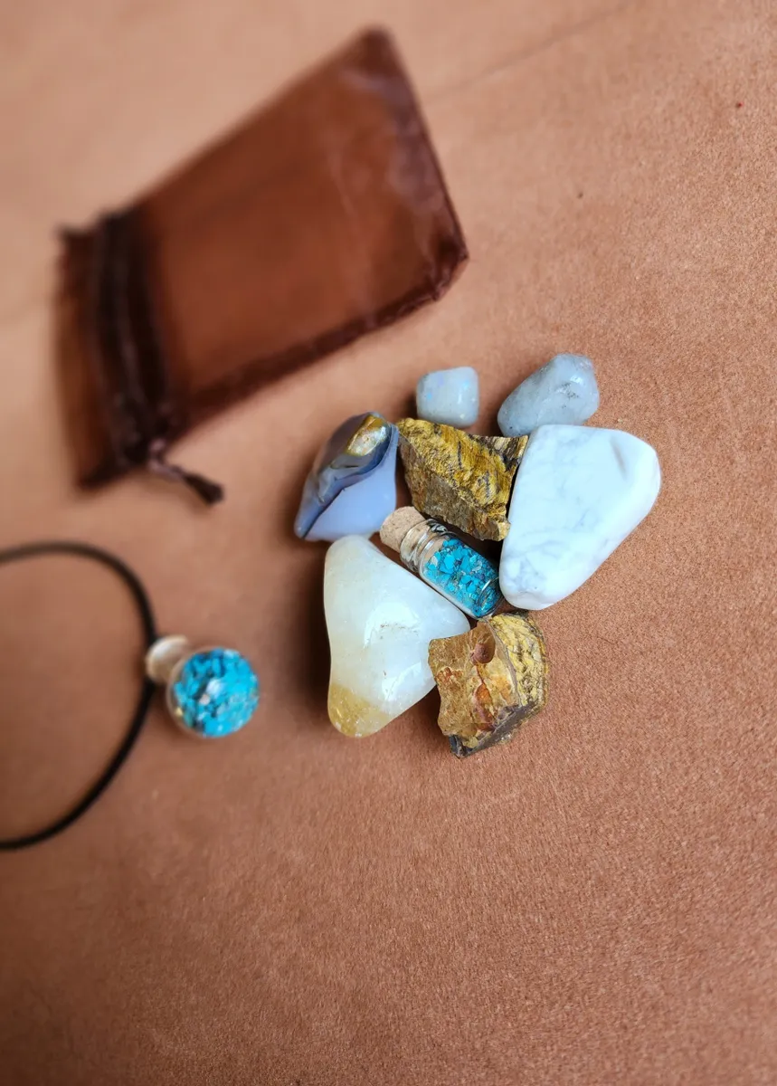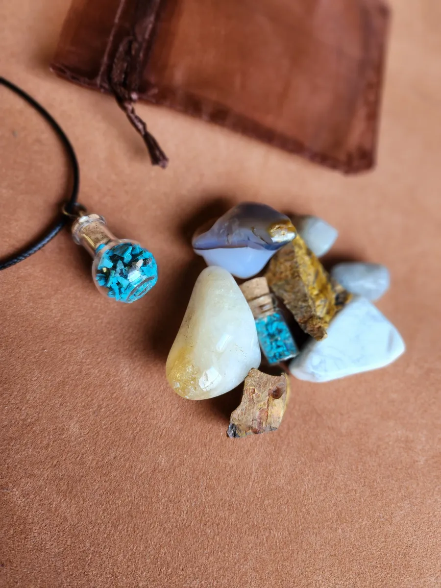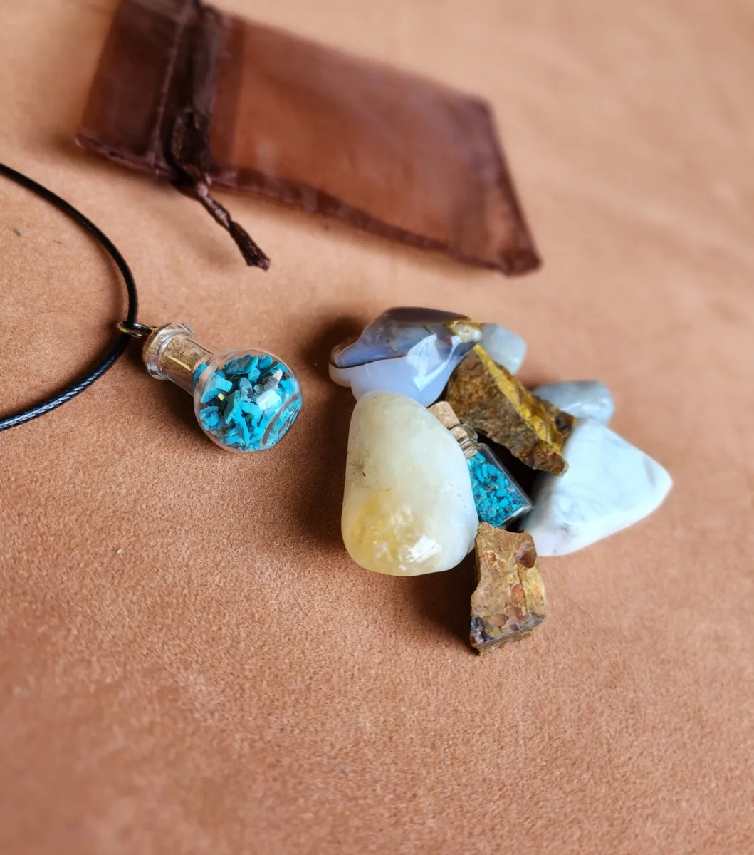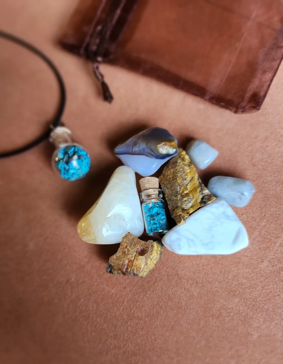 Introducing the Gemini Crystal Bag, the ultimate cosmic accessory for the zodiac enthusiasts and crystal lovers! This stunning necklace adorned with Chrysocolla gemstones inside a glass bottle, is here to elevate your style and embrace your inner celestial self. Crafted with meticulous attention to detail, this Crystal Bag showcases the mesmerizing beauty of a tiny bottle of Chrysocolla, a captivating Agate,raw Tigers Eye, Citrine, Howlite and piece of Labradorite. Delicately placed on a table, this image portrays the perfect blend of elegance and nature’s wonders. Get ready to rock your crafty world and carry the cosmic energy with you wherever you go!