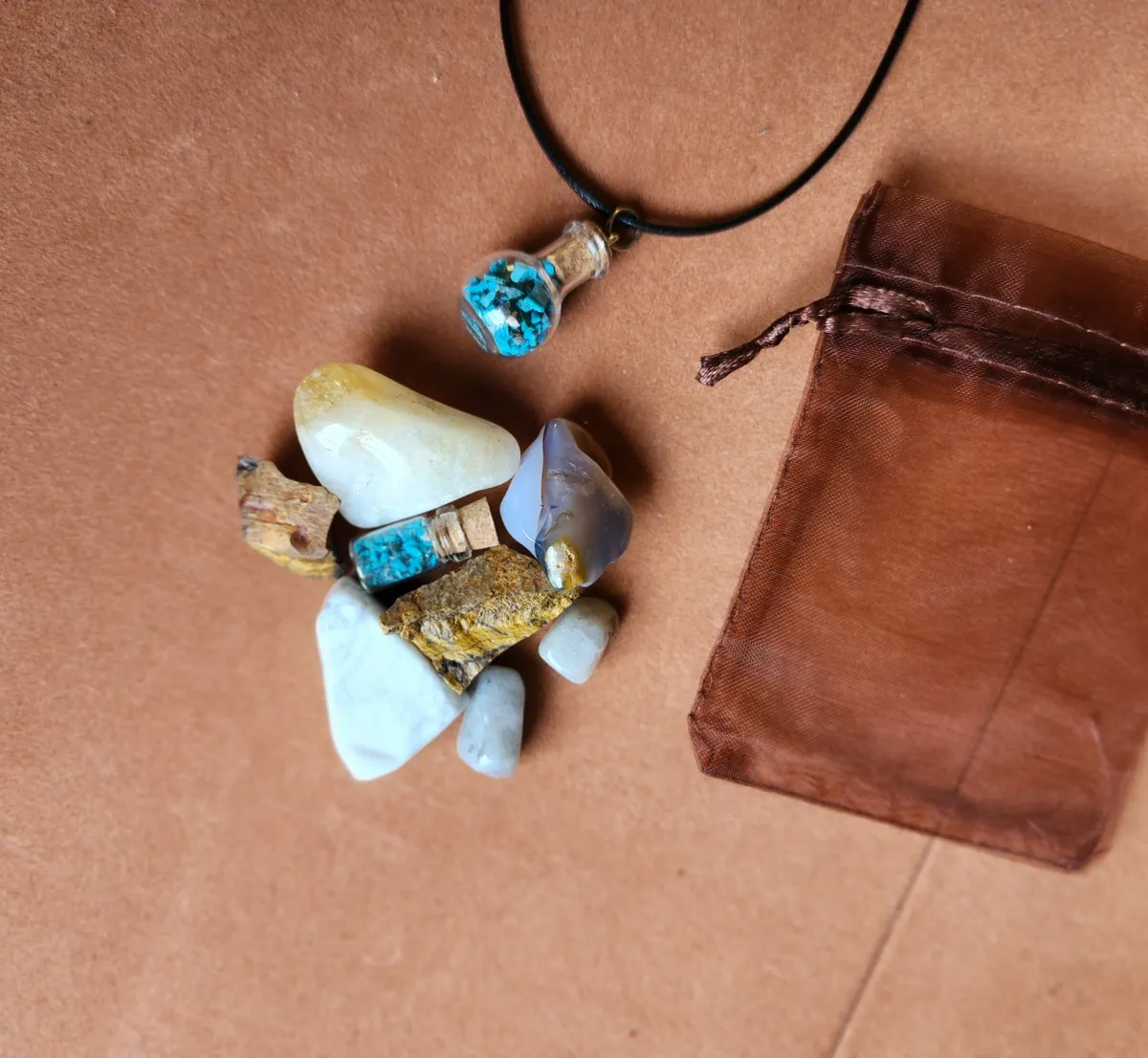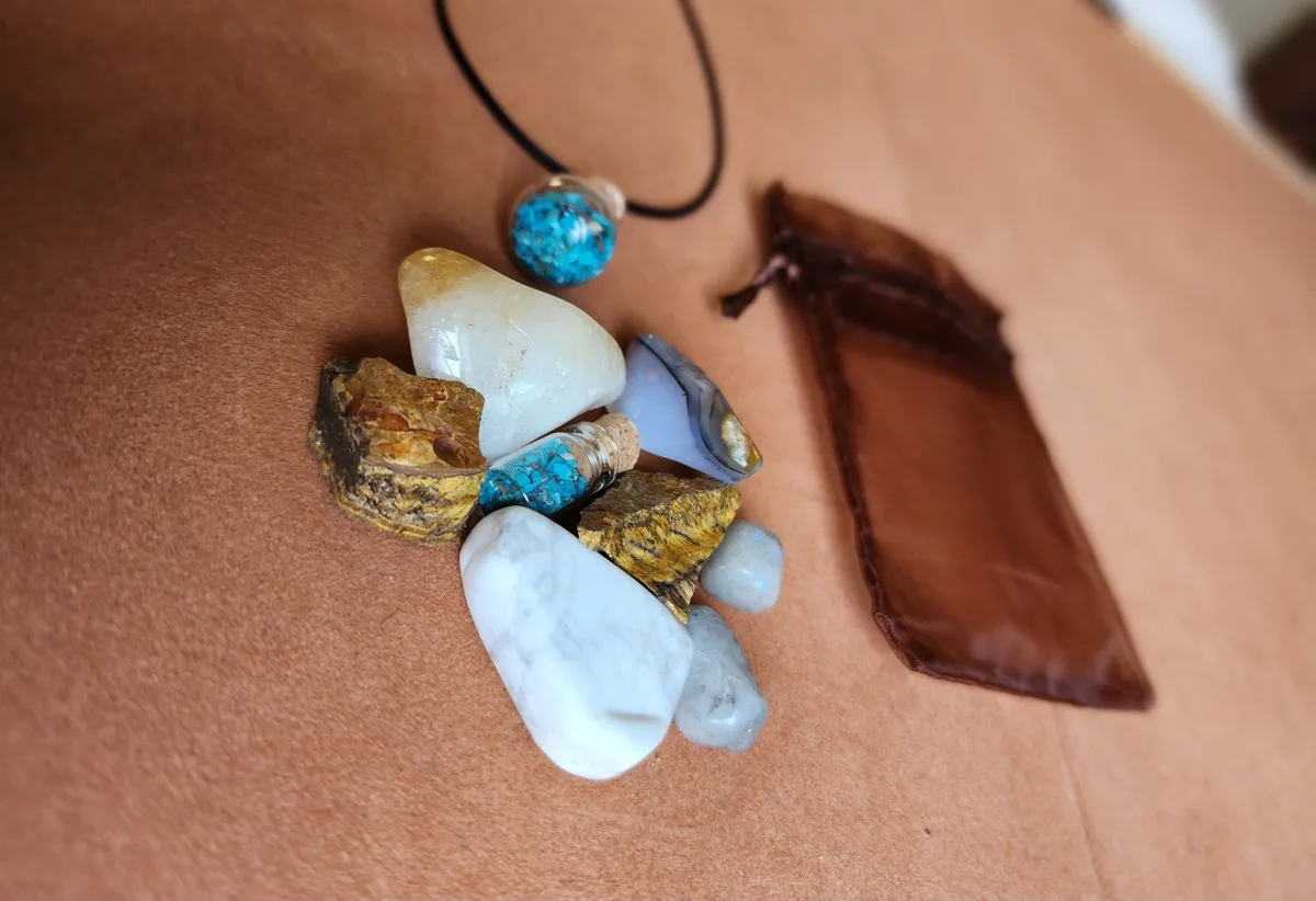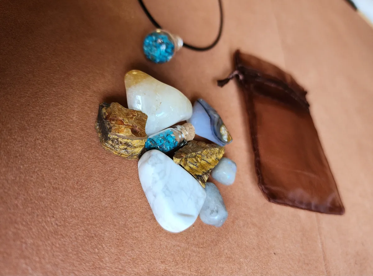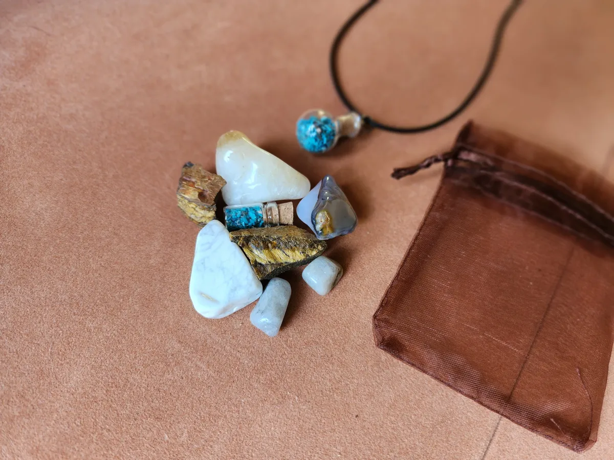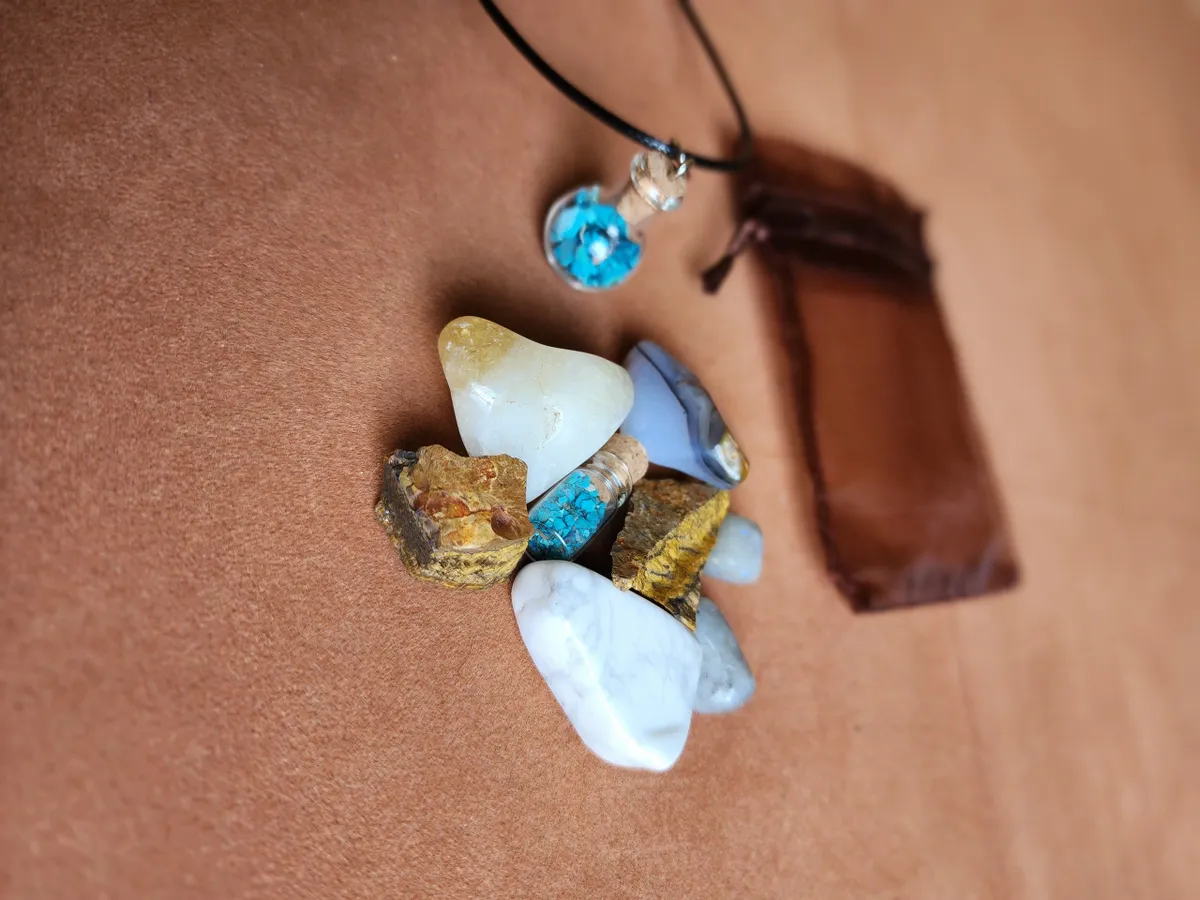 Introducing the Gemini Crystal Bag, the ultimate cosmic accessory for the zodiac enthusiasts and crystal lovers! This stunning necklace adorned with Chrysocolla gemstones inside a glass bottle, is here to elevate your style and embrace your inner celestial self. Crafted with meticulous attention to detail, this Crystal Bag showcases the mesmerizing beauty of a tiny bottle of Chrysocolla, a captivating Agate,raw Tigers Eye, Citrine, Howlite and piece of Labradorite. Delicately placed on a table, this image portrays the perfect blend of elegance and nature’s wonders. Get ready to rock your crafty world and carry the cosmic energy with you wherever you go!