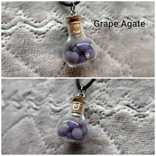 Capture the enchanting beauty of Grape Agate with this unique Grape Agate Glass Bottle Necklace. Featuring genuine Grape Agate stones delicately encased in a charming glass bottle pendant, this handcrafted necklace blends natural elegance with a whimsical touch. The intricate wire wrapping adds artisanal detail, making it a standout accessory for any outfit. Perfect for those who appreciate meaningful, one-of-a-kind jewelry or as a thoughtful gift. Embrace the mystical allure of Grape Agate in a truly distinctive way!