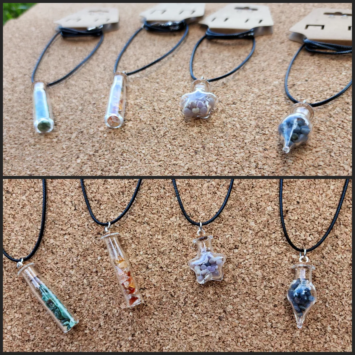 Introducing our stunning Crystal Filled Glass Bottle Necklaces, a unique and enchanting collection that effortlessly combines elegance and craftsmanship. Each necklace features a captivating glass bottle pendant, delicately filled with an array of mesmerizing Grape Agate gemstones.
