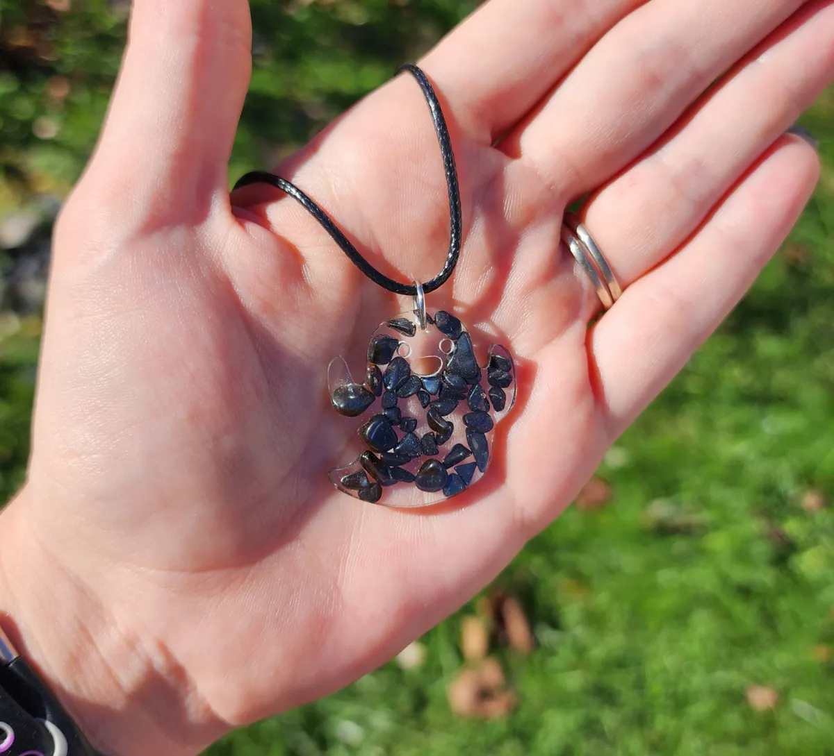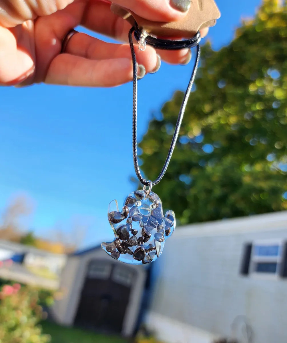 Introducing our stunning Hematite Ghost Necklace! This unique piece features beautiful hematite stones that shimmer and shine like no other. The ghostly design adds a touch of mystery and intrigue to any outfit, making it the perfect accessory for those who love to stand out from the crowd. Handcrafted with care and attention to detail, this necklace is sure to turn heads wherever you go. The glass beads add a touch of elegance, while the blue sky background in the product image creates a serene and magical vibe. Get ready to make a statement with our Hematite Ghost Necklace!