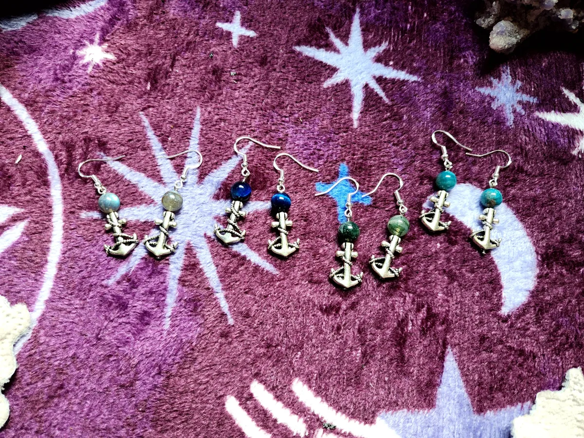 Introducing our exquisite Crystal Earrings with Anchor, featuring the mesmerizing gemstones Labradorite, Blue Tigers Eye, Moss Agate, and Blue Apatite. Handcrafted with precision, these earrings are a true testament to the artistry and craftsmanship that defines our craft business. The Crystal Earrings with Anchor are a perfect blend of elegance and bohemian charm. Each pair is meticulously designed to showcase the natural beauty of the gemstones, offering a unique and captivating accessory for any occasion. Labradorite, with its enchanting play of colors, adds a touch of mystique to these earrings. Blue Tigers Eye, known for its soothing and protective properties, emanates a calming energy when worn. Moss Agate, with its verdant hues, symbolizes growth and abundance. Lastly, Blue Apatite, reminiscent of the tranquil ocean, brings a sense of tranquility and harmony. The earrings are delicately suspended from silver hooks, adding a touch of sophistication to their overall design. The contrasting combination of the vibrant gemstones against the silver accentuates their natural beauty, creating a striking and eye-catching piece of jewelry. Whether you’re attending a formal event or simply want to elevate your everyday style, our Crystal Earrings with Anchor are the perfect accessory to complete your look