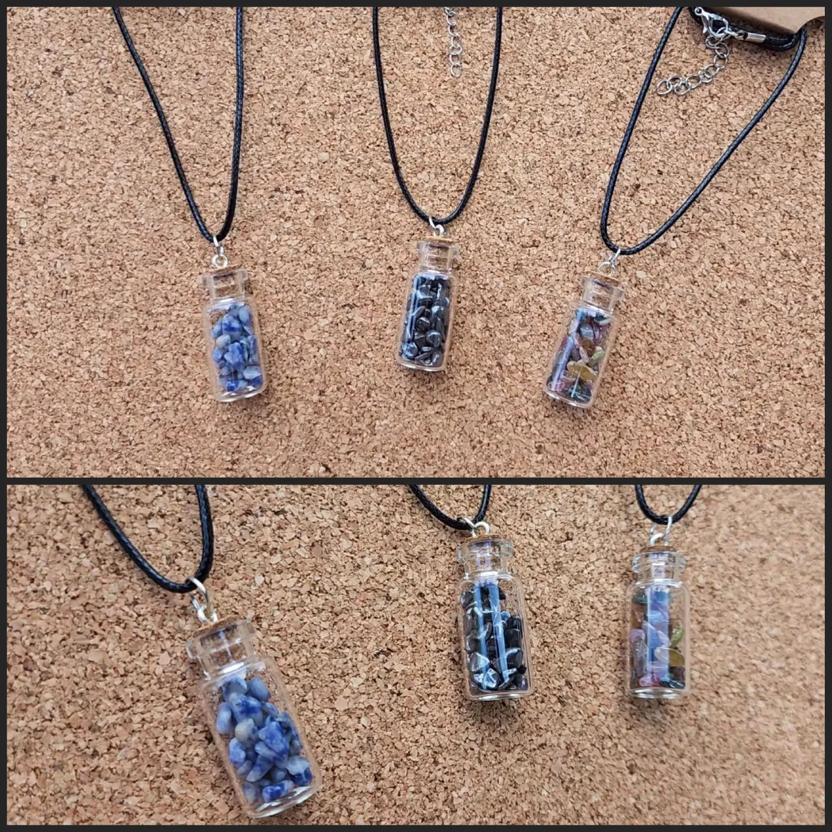 Each necklace features a mesmerizing glass bottle, delicately filled with an array of enchanting stones.