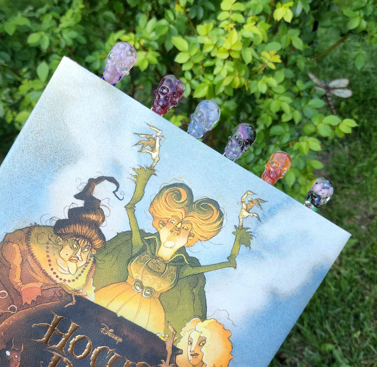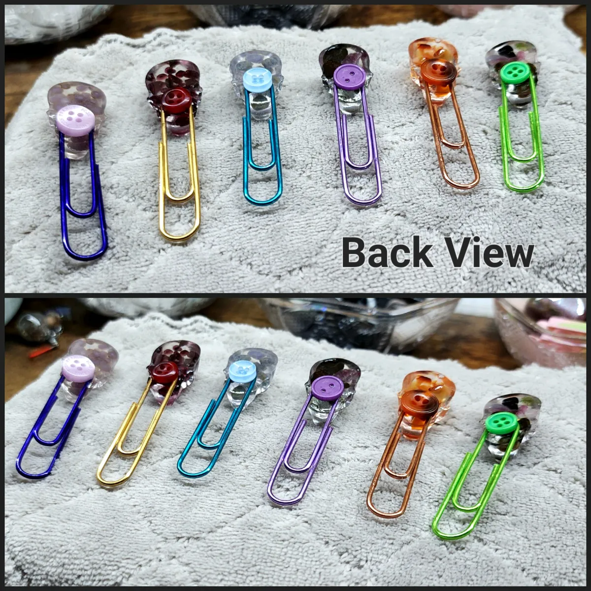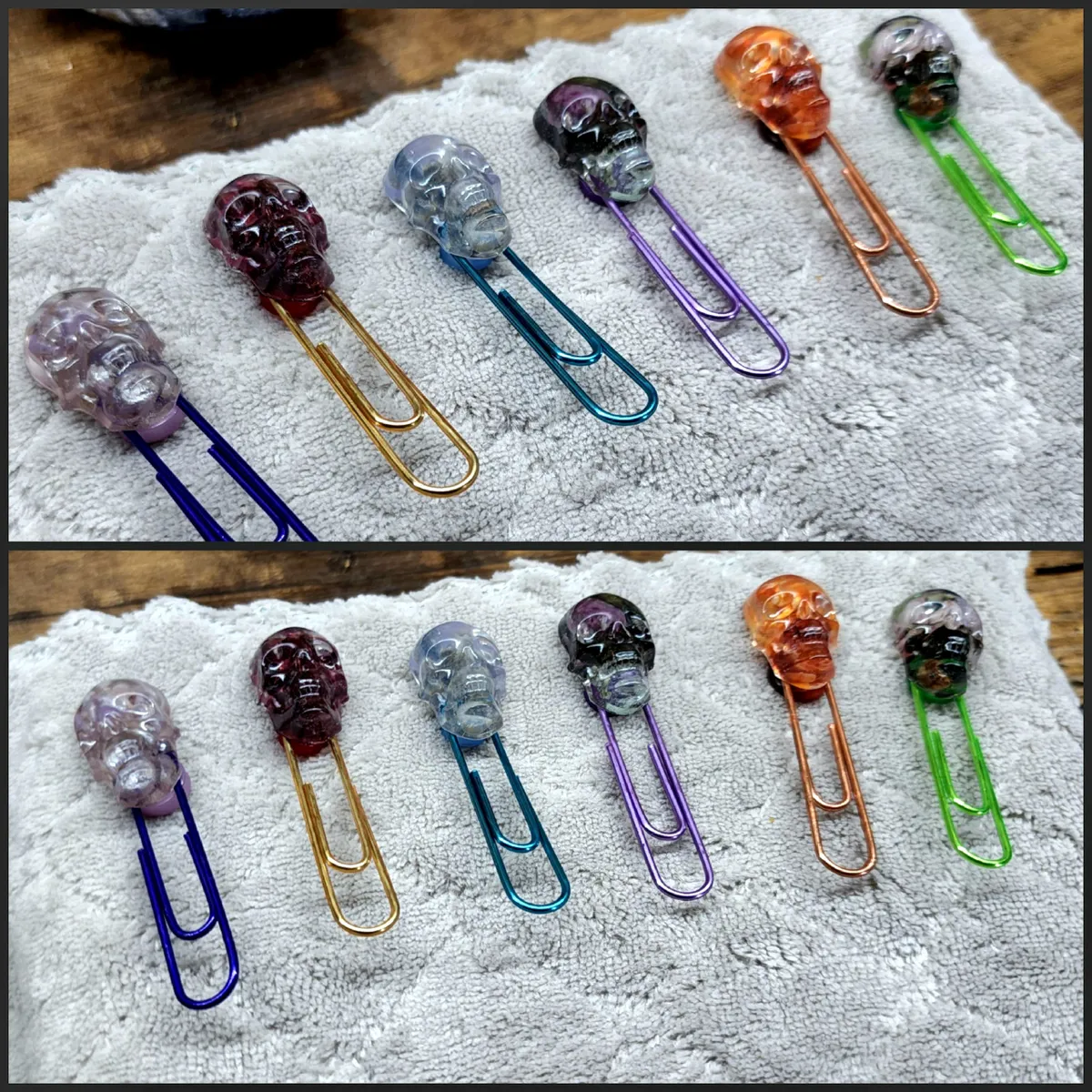 Handmade paperclip crystal bookmarks! These beautiful bookmarks will look great clipping in any book! Why not have good vibes while you’re reading a great book!? These Skull bookmarks are made with epoxy with the crystals in them. They also have a cute little button on the back for stability