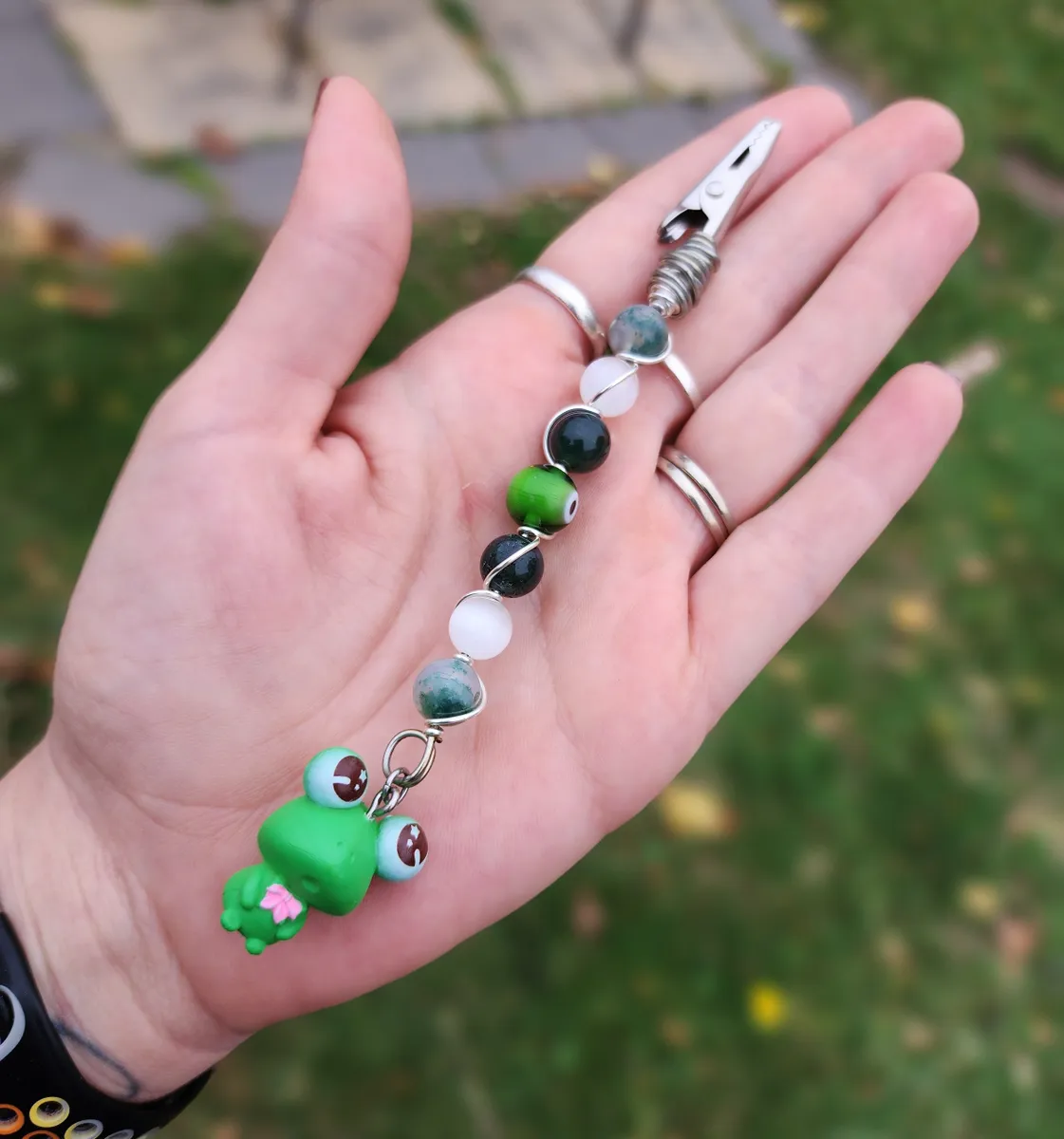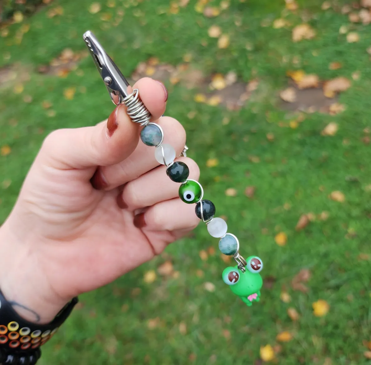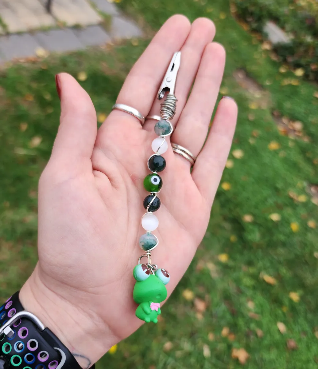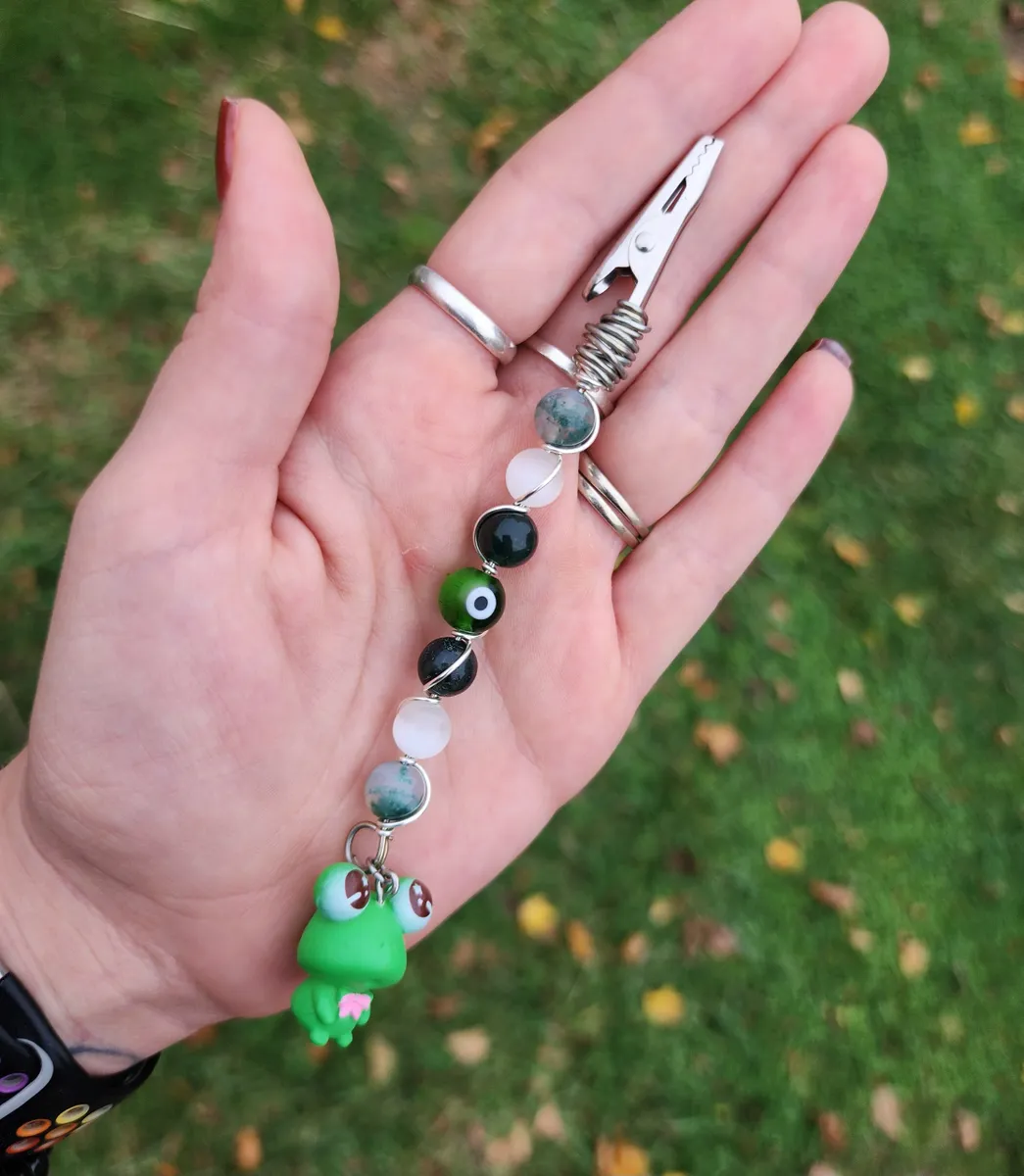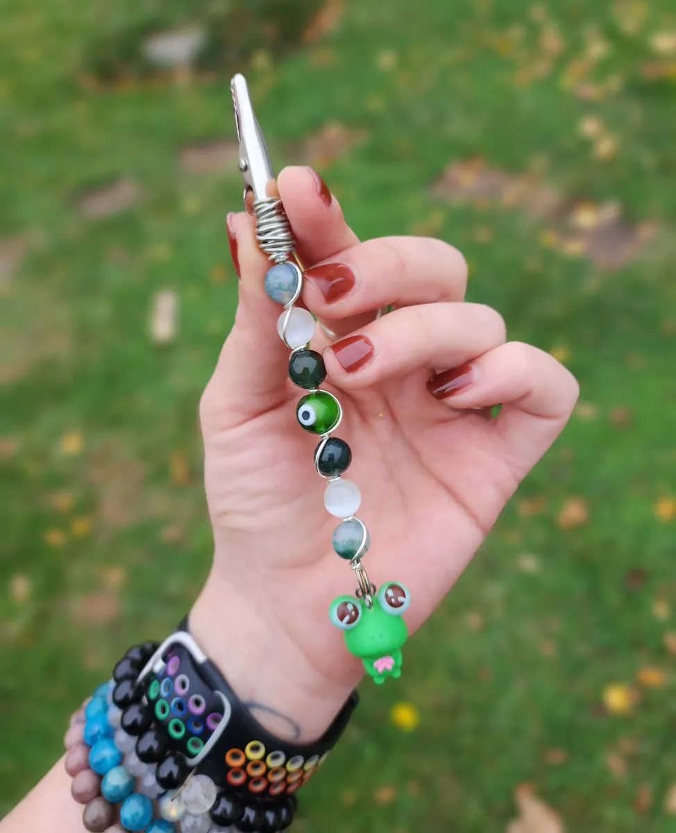 Introducing our hoppingly-awesome Moss Agate and Selenite Roach Clips with Frog Charm! This unique craft_business creation is a must-have for all you nature enthusiasts out there. Not only are these roach clips perfect for keeping your rolled delights secure, but they also add a touch of whimsy to your style game. The exquisite green beads and adorable frog charm make these clips a true statement piece. It’s like Mother Nature herself whispered some crafty secrets. So, whether you’re chilling in the forest or strutting your stuff in the concrete jungle, these roach clips will have you feeling frog-tastic!