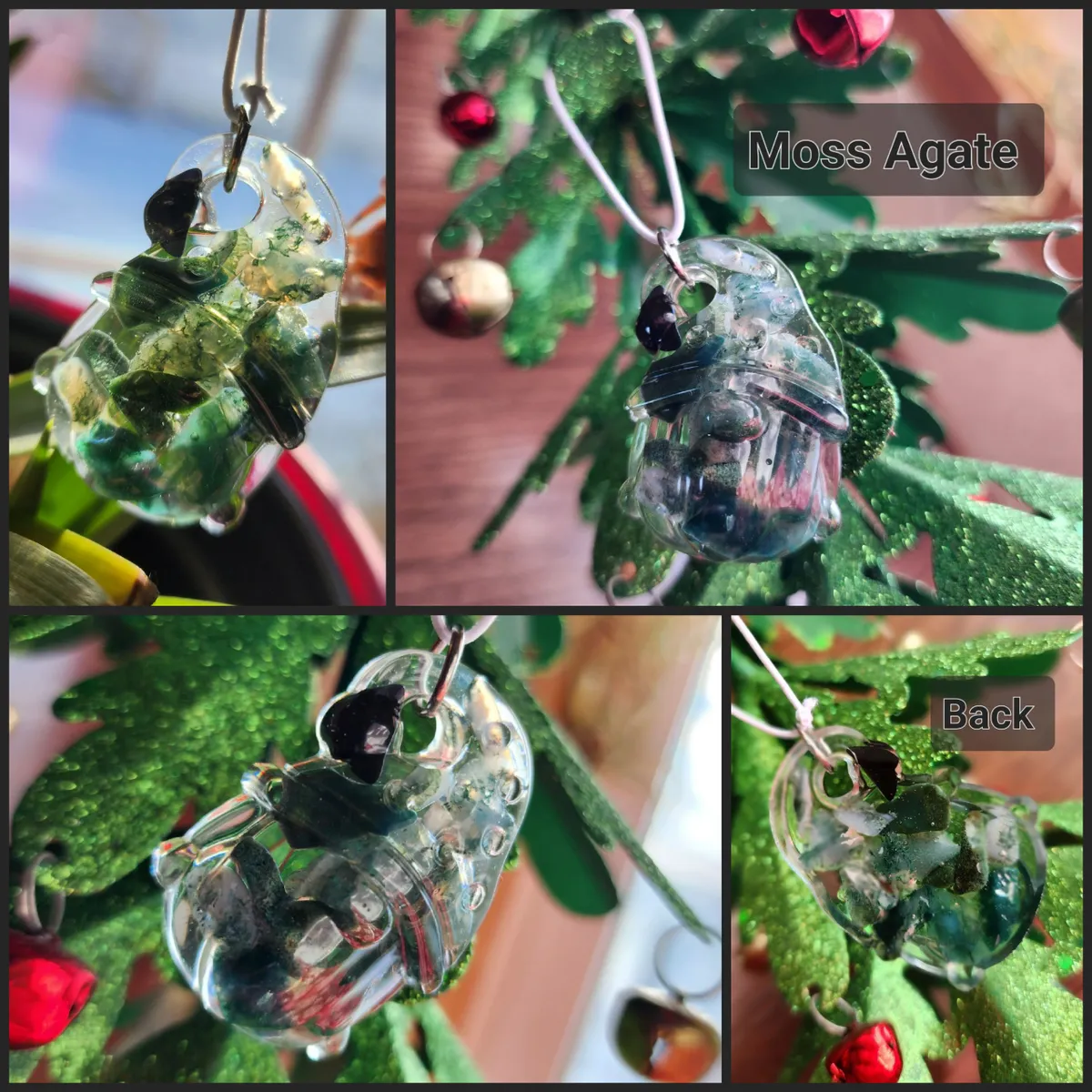 Introducing our mischievous little friend, the Moss Agate Gnome Ornament! This adorable ornament is the perfect addition to your home or garden, adding a touch of whimsy and natural elegance. Crafted with care, it features a charming collage of photos showcasing the mesmerizing beauty of moss agate.