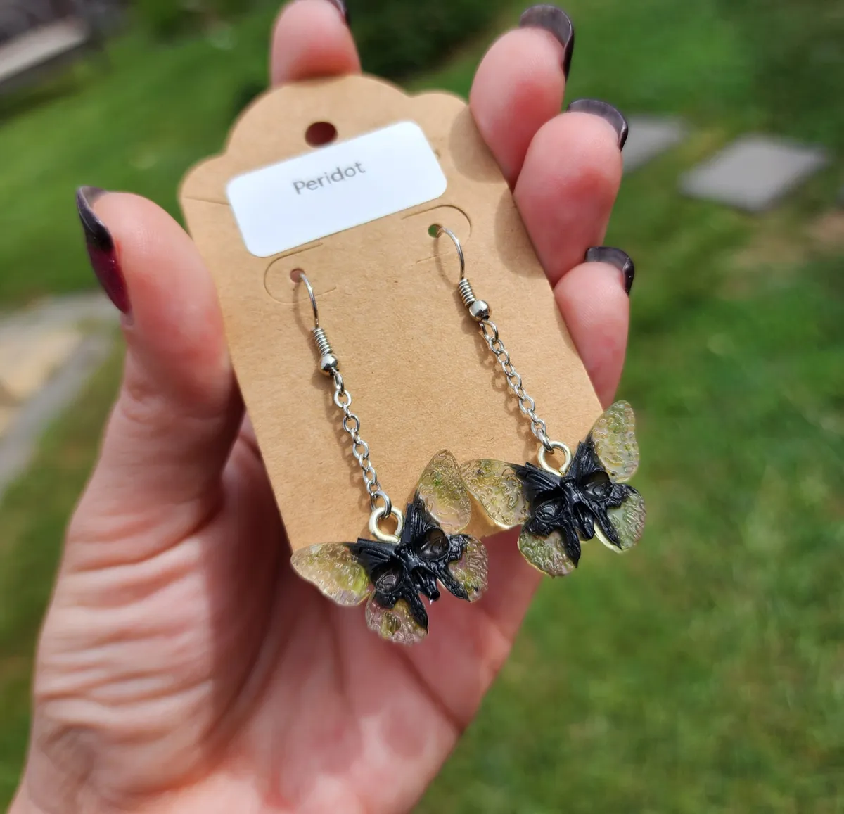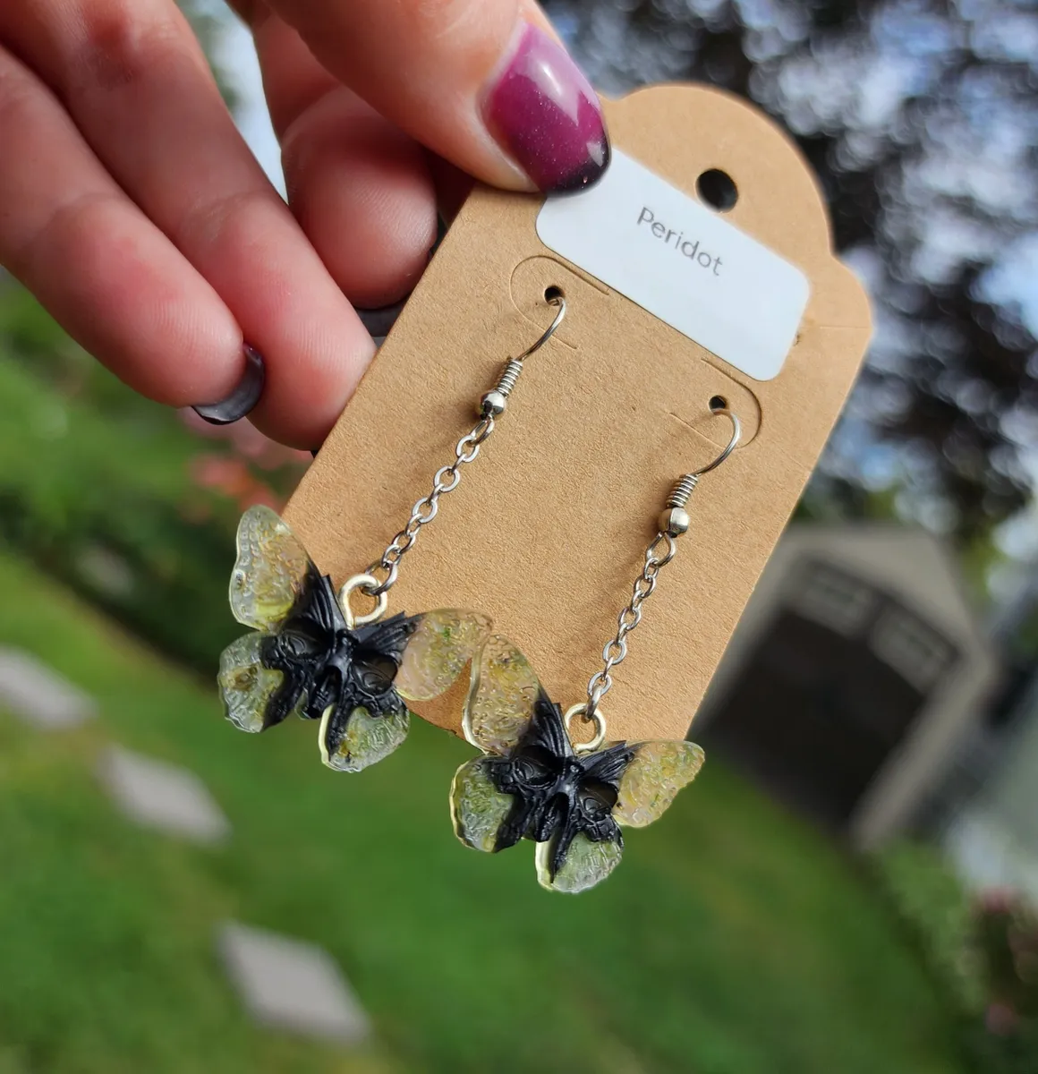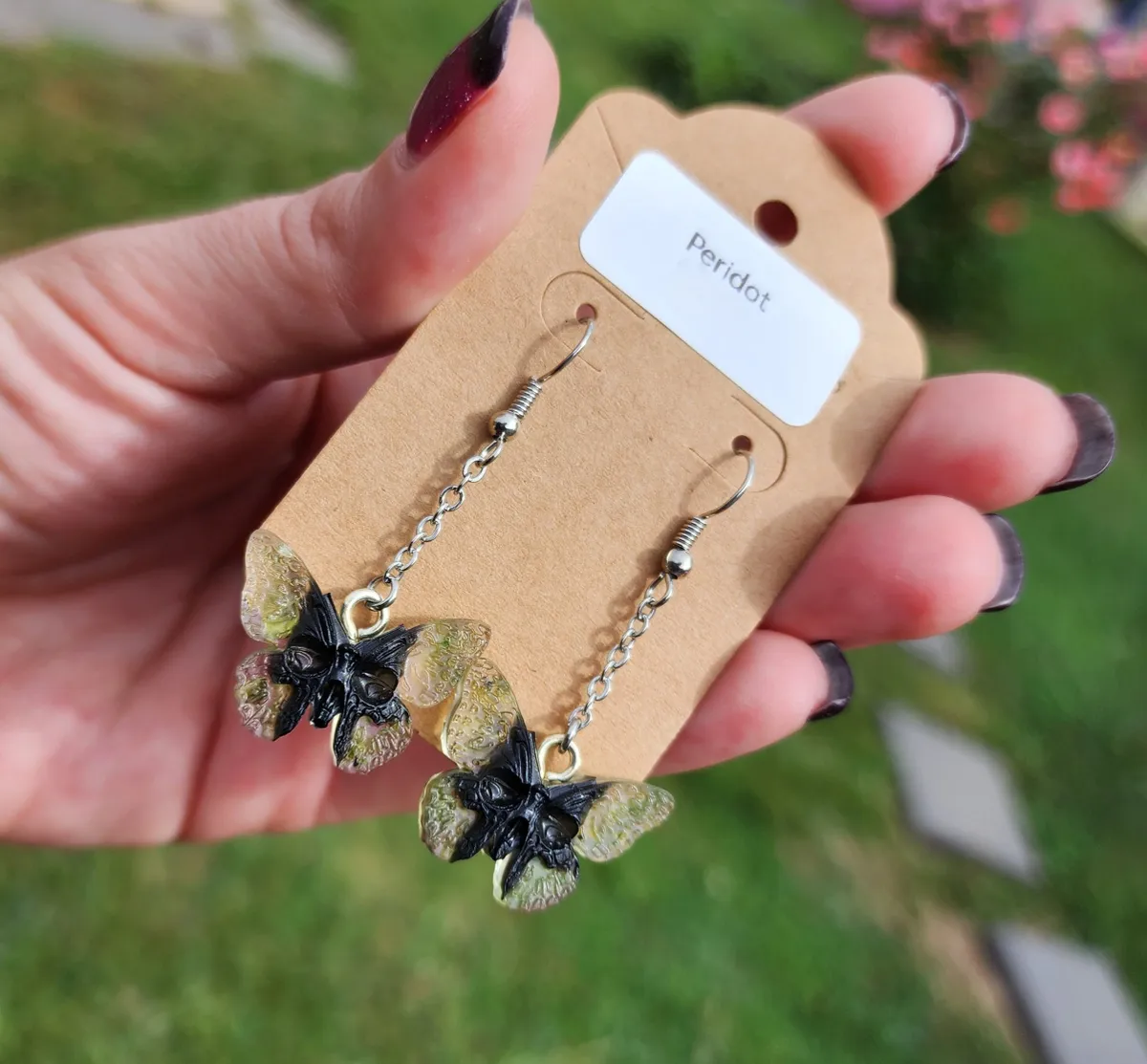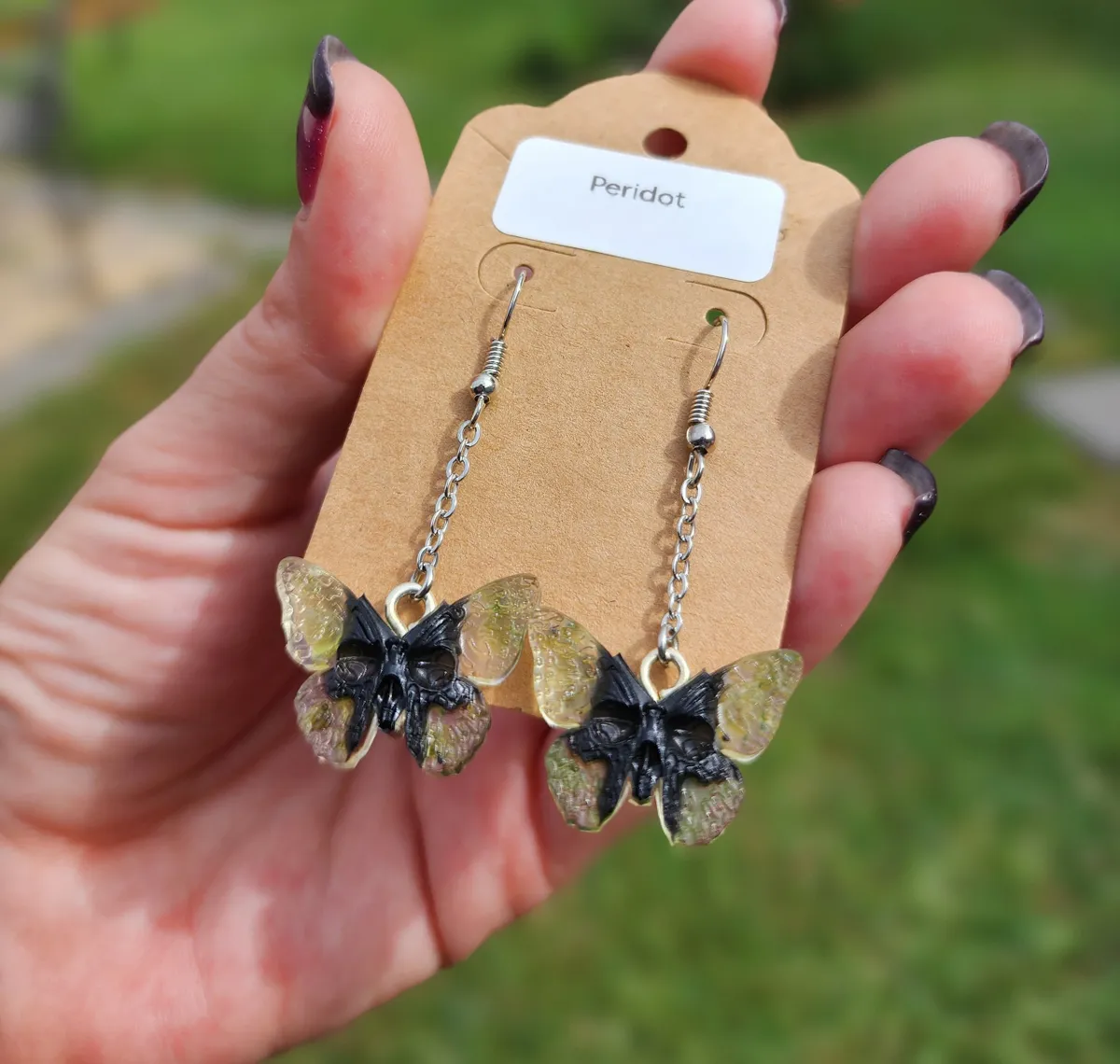 Introducing our stunning Peridot Butterfly Skull Earrings! These unique and eye-catching earrings are perfect for anyone looking to make a statement. Crafted with intricate detail, these earrings feature a beautiful combination of peridot gemstones, butterfly wings, and skull . Each pair is handmade with care and attention to detail, ensuring that you receive a one-of-a-kind piece. Whether you’re dressing up for a special occasion or adding a touch of edgy flair to your everyday look, these earrings are sure to turn heads. Treat yourself or give them as a thoughtful gift to a loved one. Upgrade your accessory game with our Peridot Butterfly Skull Earrings today!