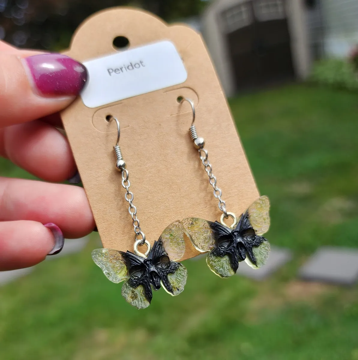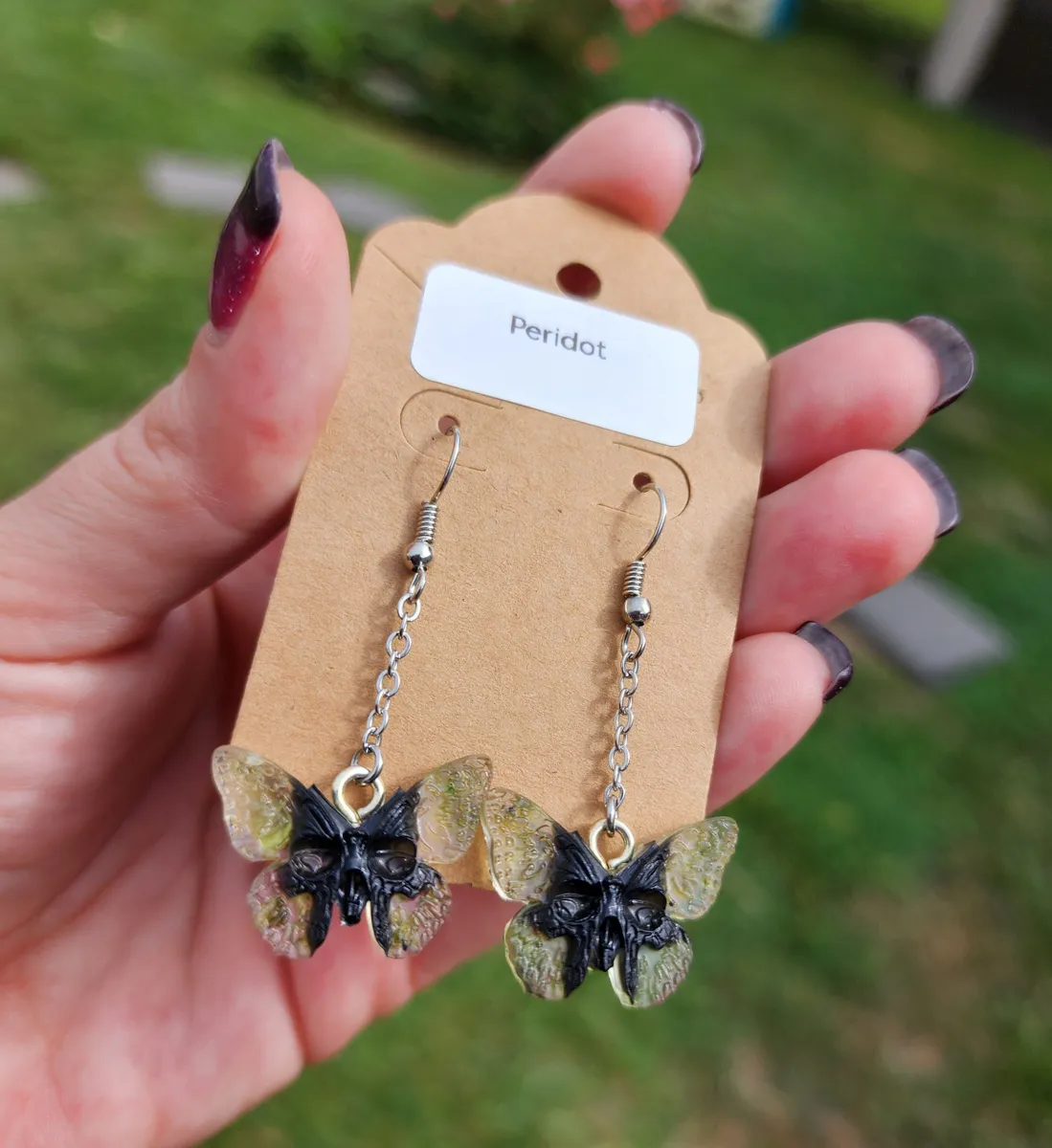 Be the first to review “Peridot Butterfly Skull Earrings”