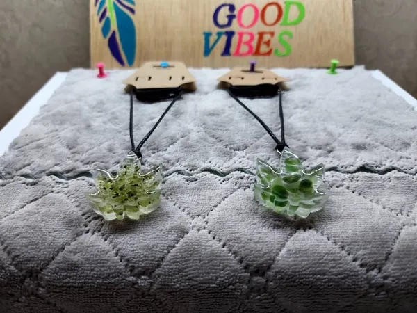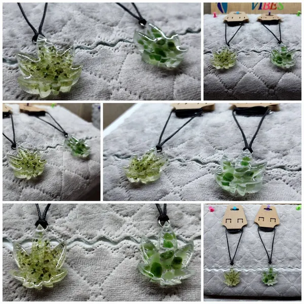 The Leaf necklaces are hand made with epoxy resin and quality, genuine crystal chips! They come knotted on an 18in black cord necklace with an extender. These are perfect for wearing or hanging!