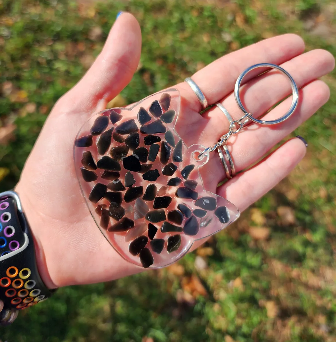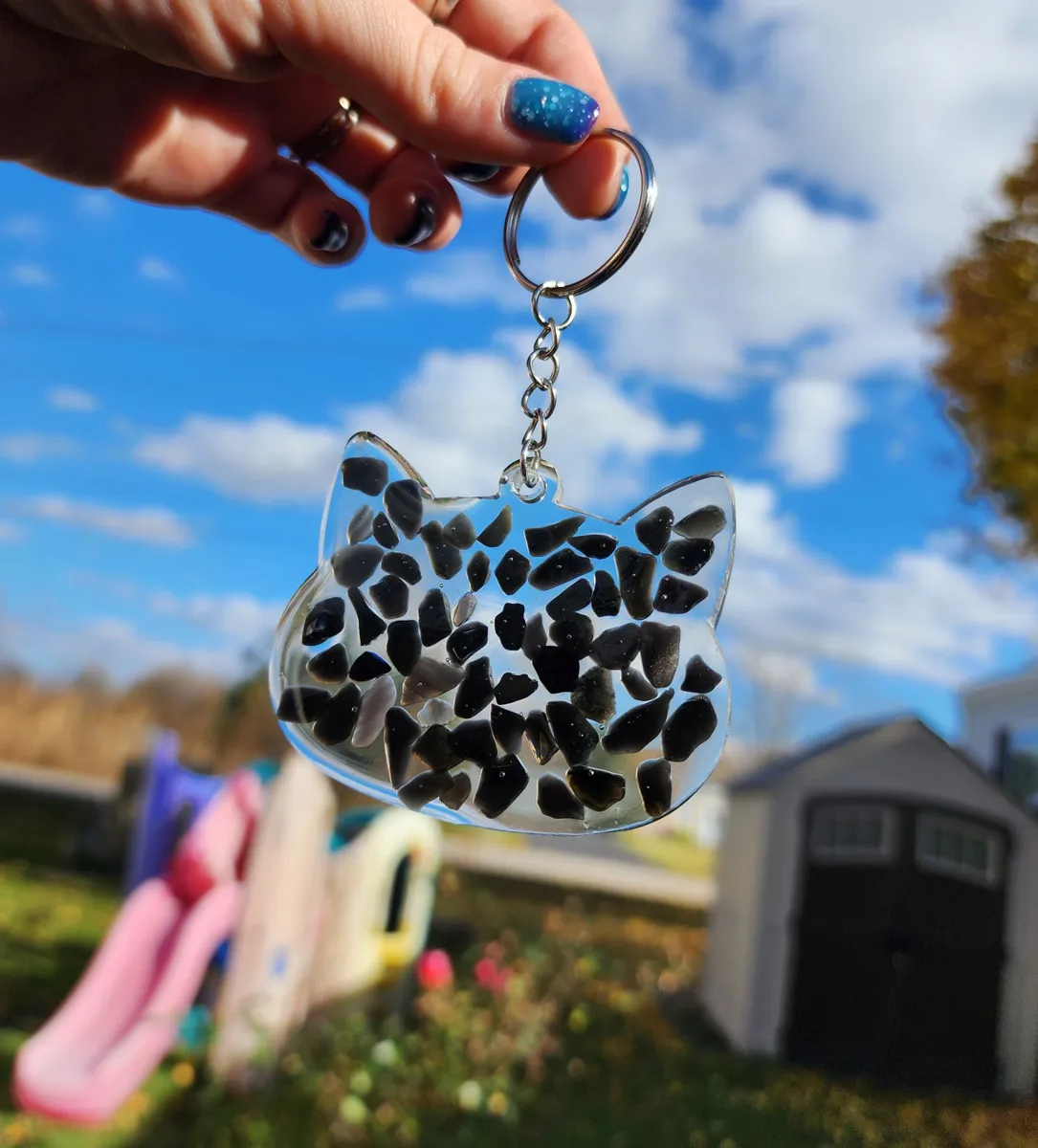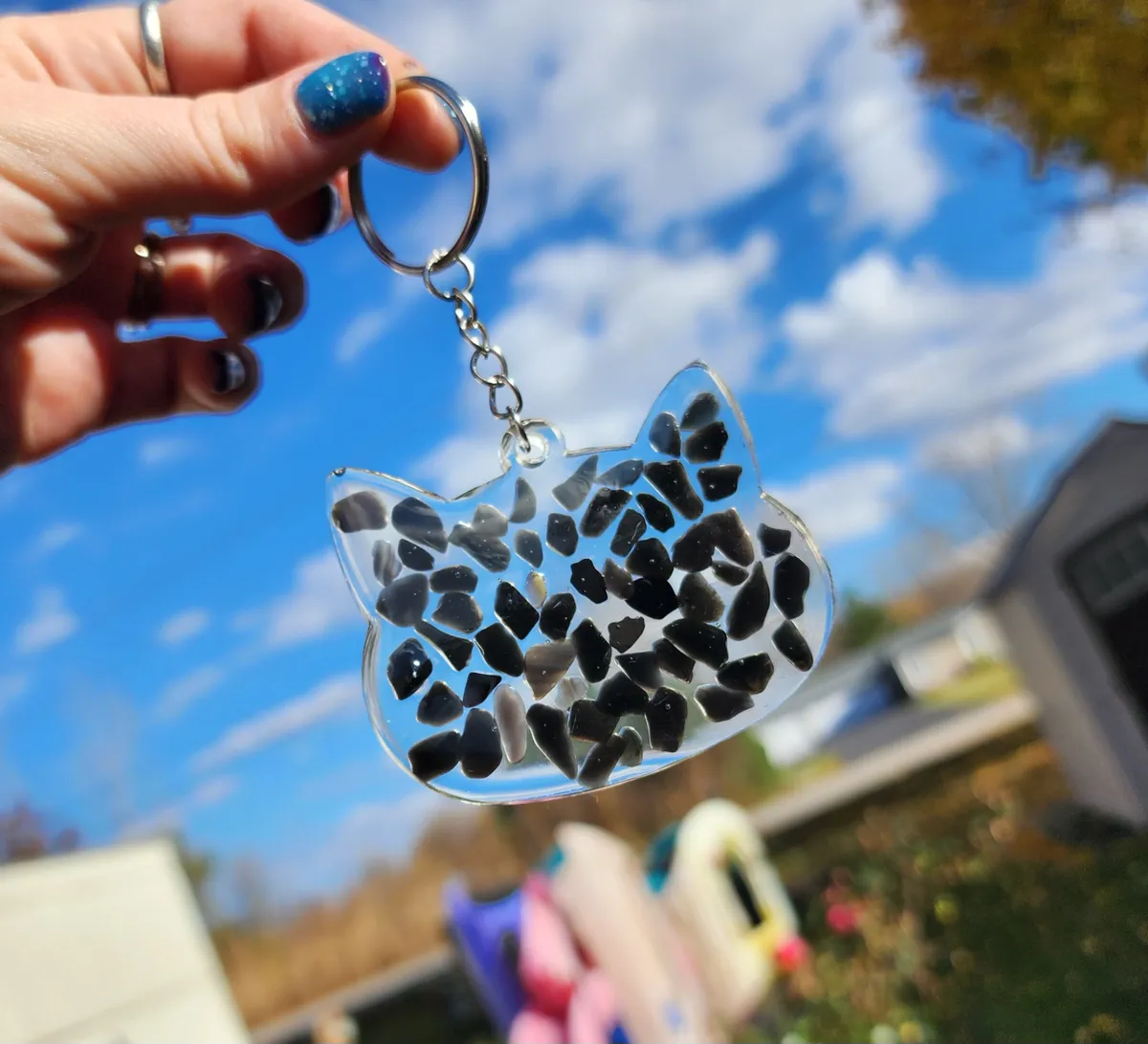 Add a pop of color and whimsy to your keys with our Rainbow Obsidian Keychain! This larger animal keychain features a playful cat design that is sure to brighten your day every time you reach for your keys. The vibrant rainbow hues of the obsidian stone add a touch of magic to this adorable accessory. Perfect for animal lovers and anyone who loves unique, handcrafted items. Treat yourself or gift it to a friend who appreciates one-of-a-kind pieces. Make a statement and stand out from the crowd with this charming animal keychain!