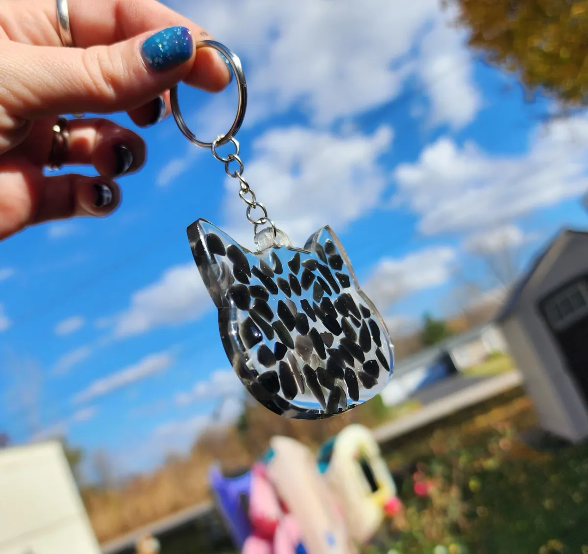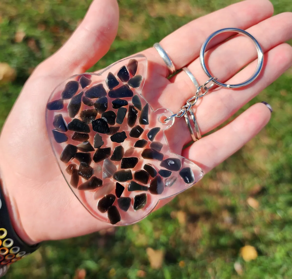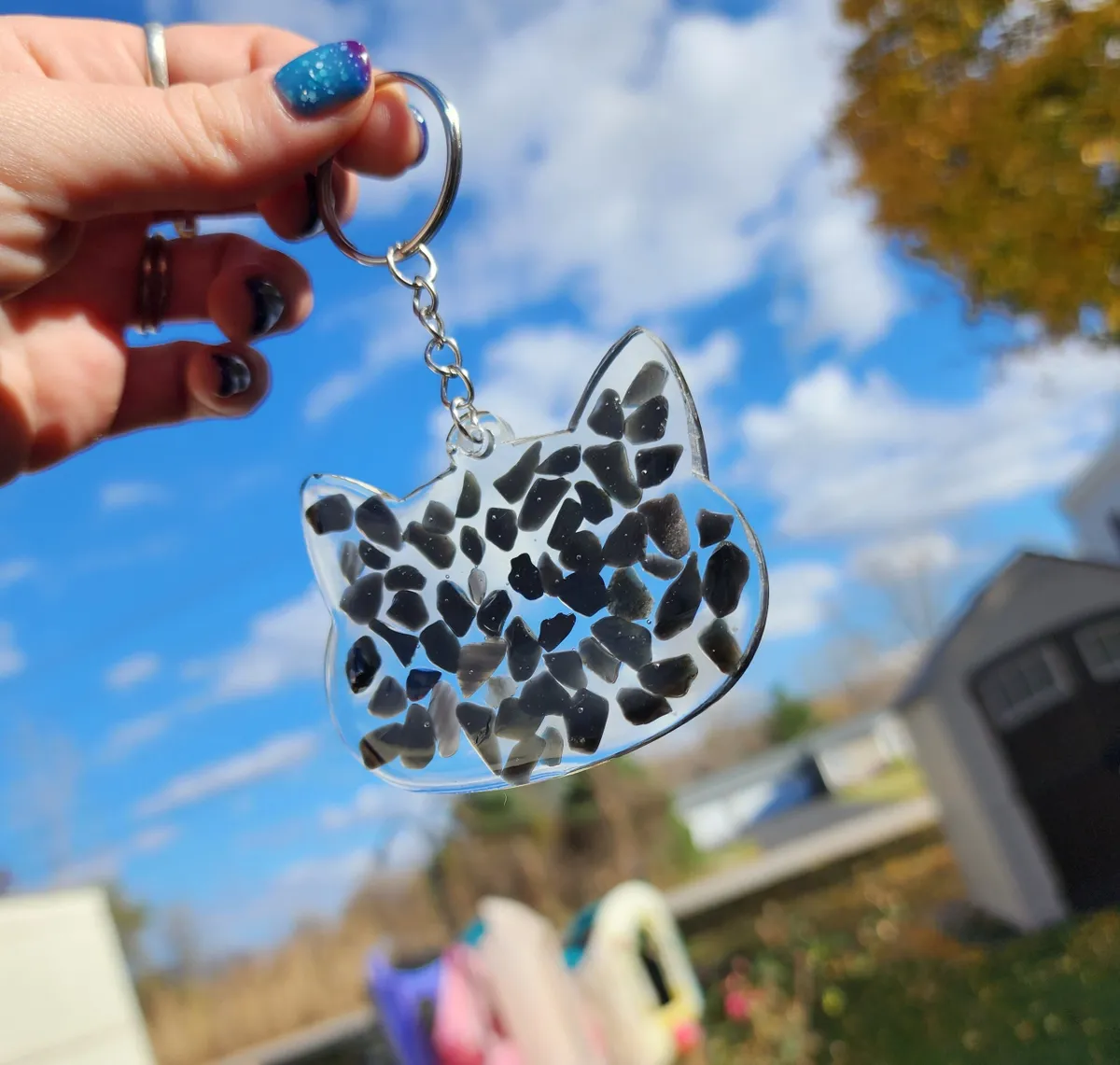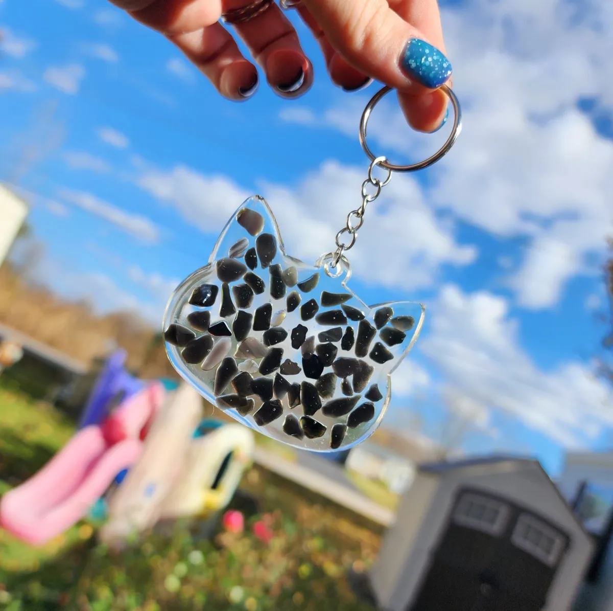 Add a pop of color and whimsy to your keys with our Rainbow Obsidian Keychain! This larger animal keychain features a playful cat design that is sure to brighten your day every time you reach for your keys. The vibrant rainbow hues of the obsidian stone add a touch of magic to this adorable accessory. Perfect for animal lovers and anyone who loves unique, handcrafted items. Treat yourself or gift it to a friend who appreciates one-of-a-kind pieces. Make a statement and stand out from the crowd with this charming animal keychain!
