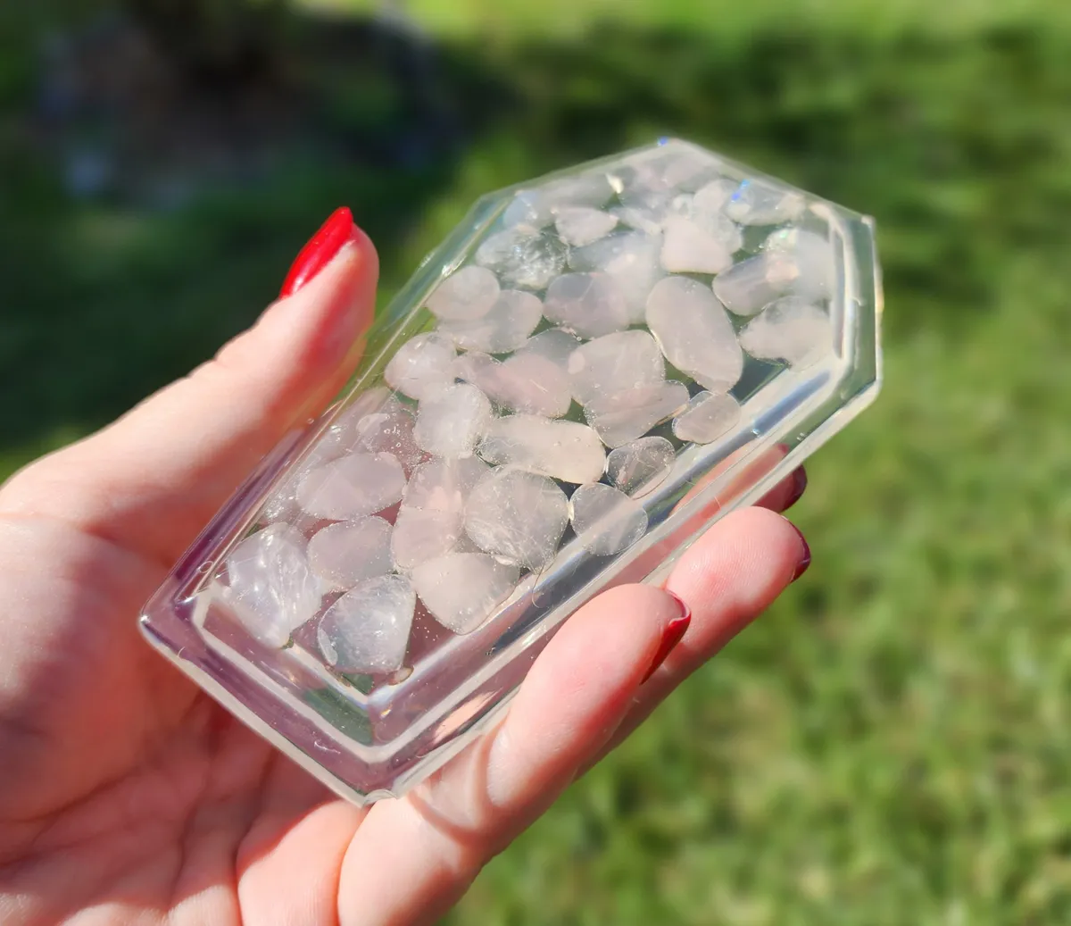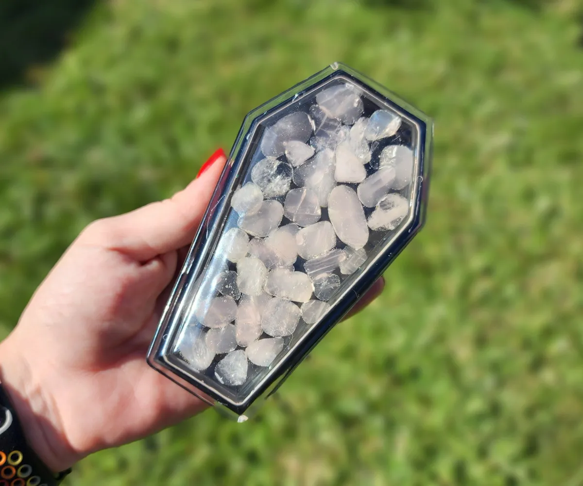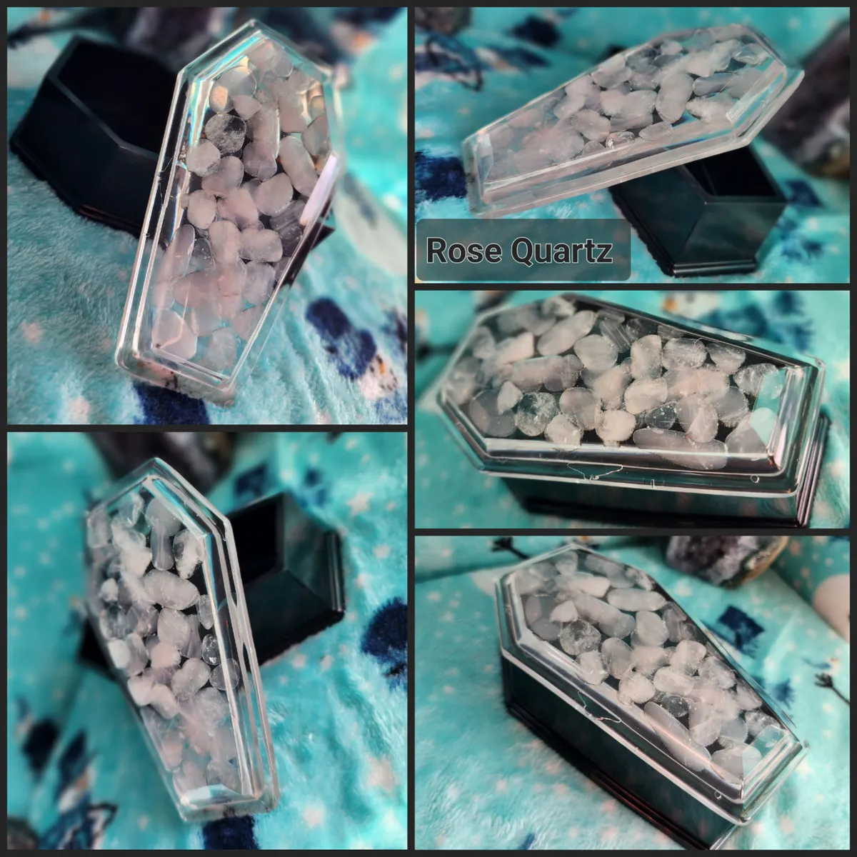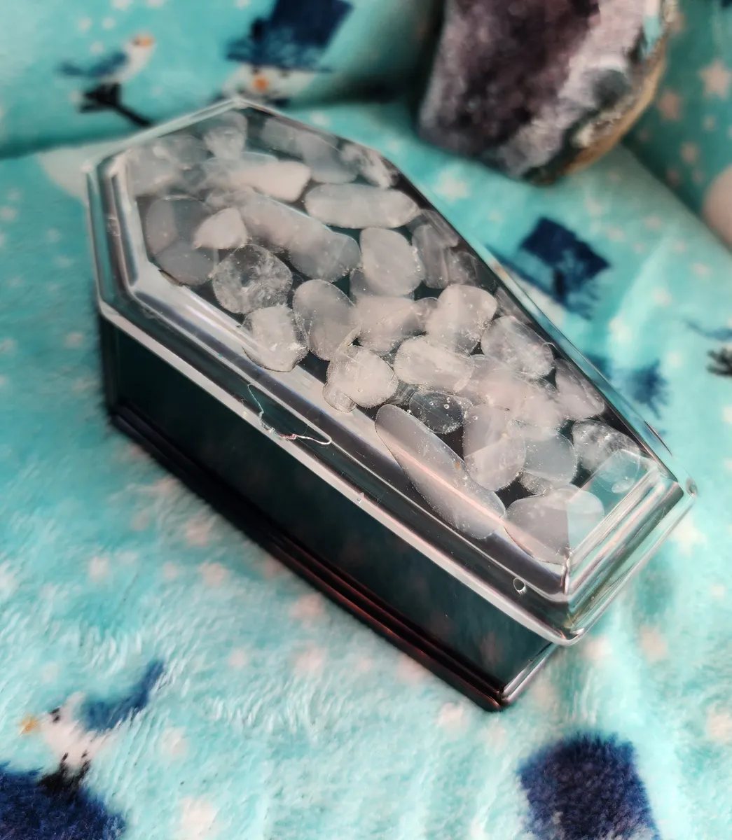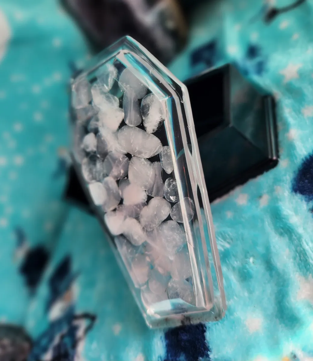 Introducing the Rose Quartz Coffin Trinket Box, where beauty meets edginess in one mesmerizing piece! Our craft business has created a unique masterpiece that will captivate your senses. The stunning epoxy coffin, adorned with enchanting pink stones in the top, adds a touch of elegance to your trinket collection. But wait, there’s more! We’ve added a black epoxy coffin bottom, exuding an air of mystery and intrigue. This exquisite collage of photos showcases the perfect blend of sophistication and badassery. Place your treasures inside and let this witty conversation starter become the crowning jewel of your décor. Unleash your inner gothic goddess with our Rose Quartz Coffin Trinket Box!