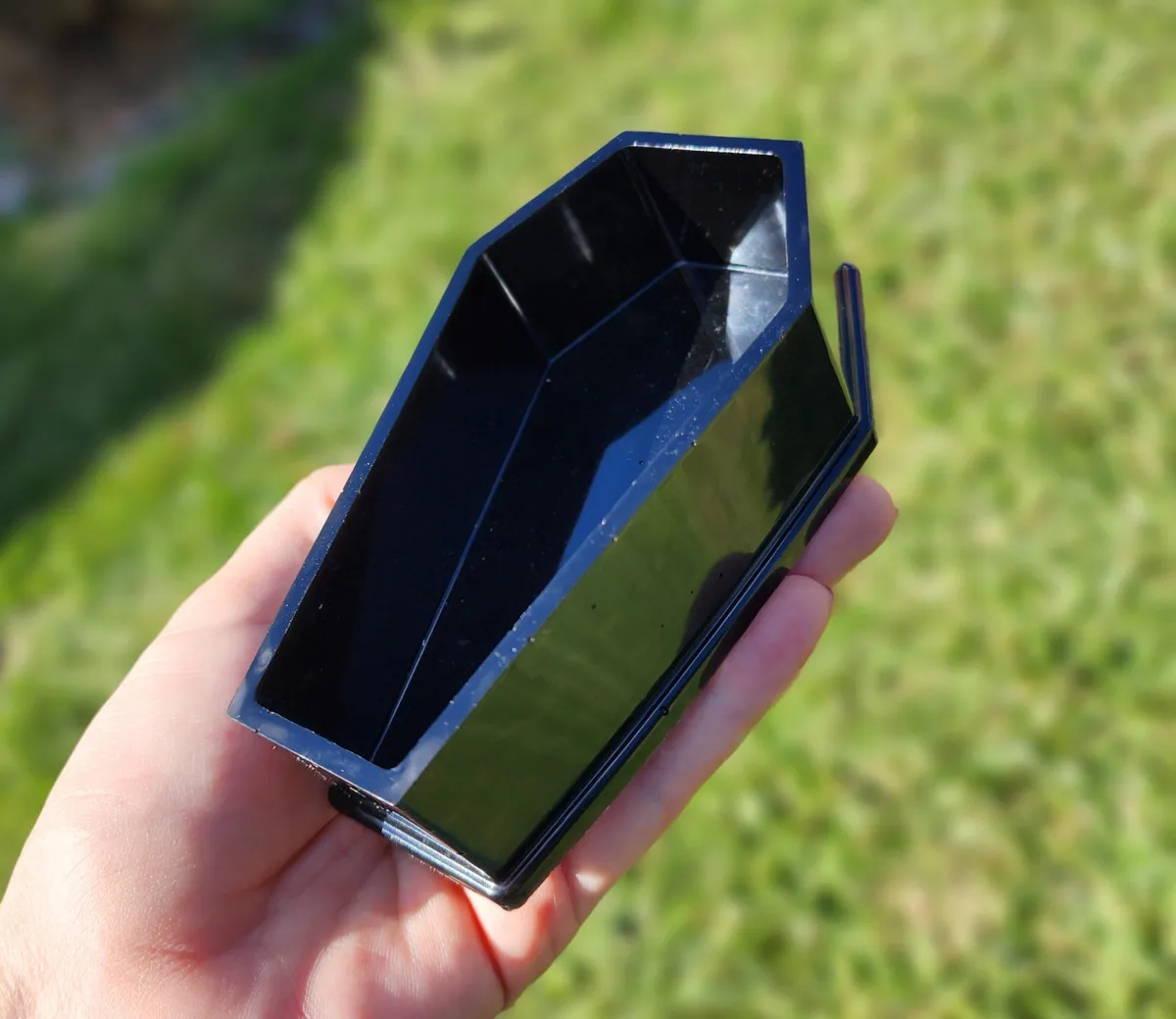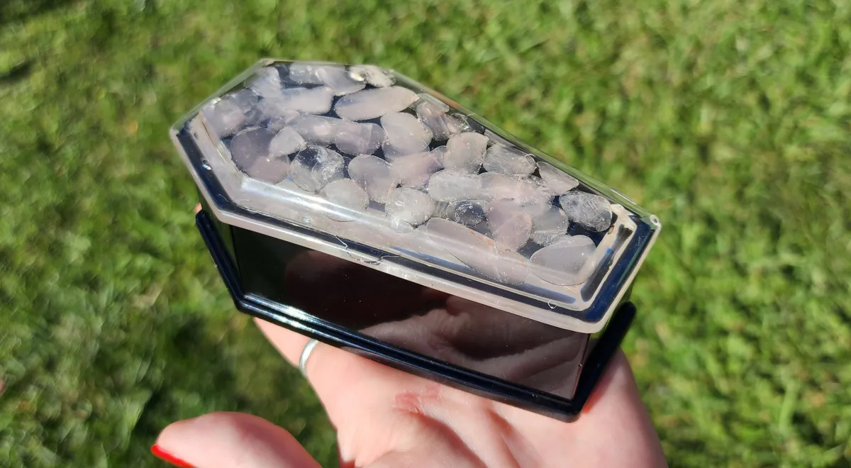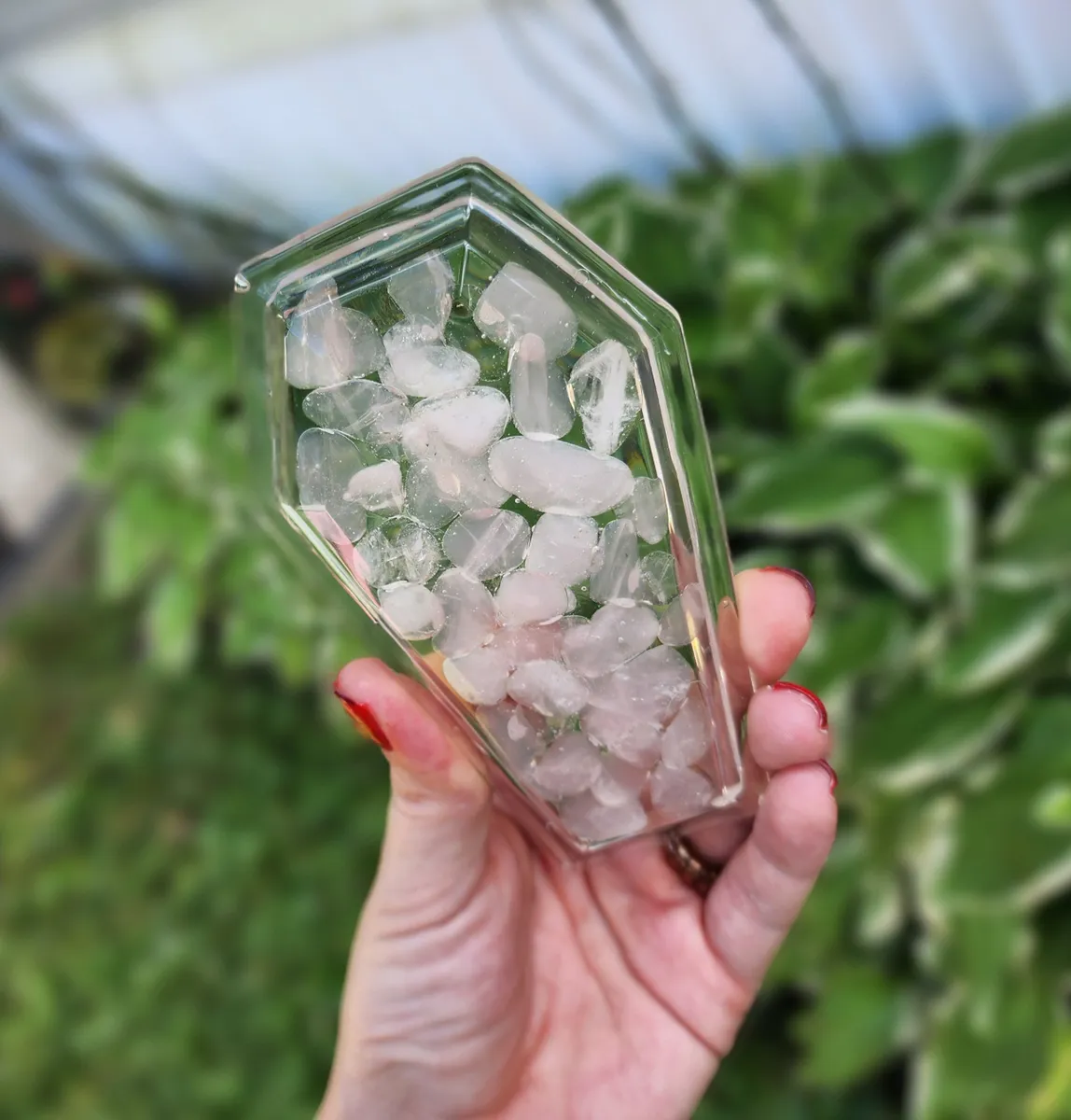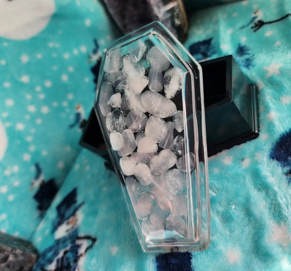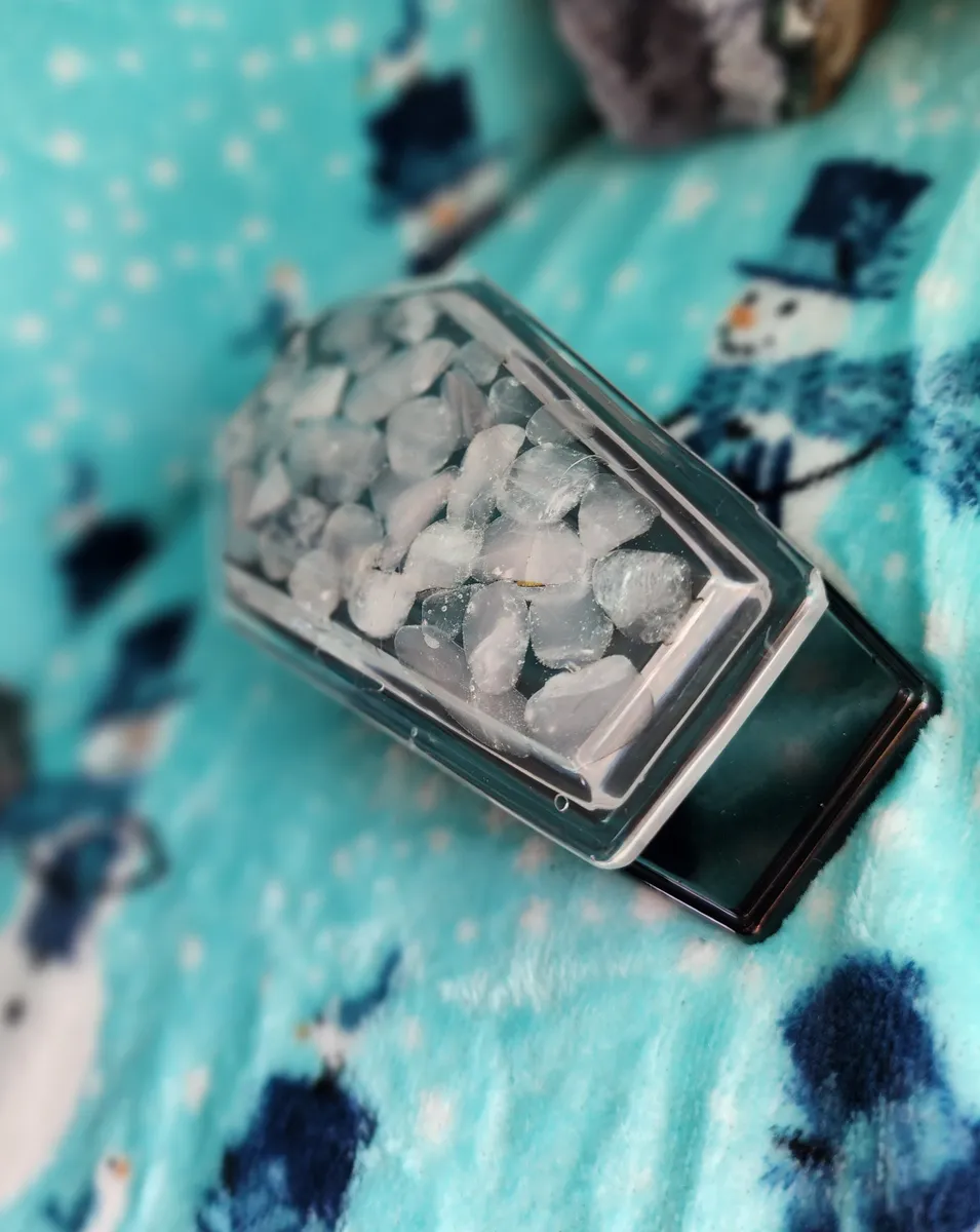 Introducing the Rose Quartz Coffin Trinket Box, where beauty meets edginess in one mesmerizing piece! Our craft business has created a unique masterpiece that will captivate your senses. The stunning epoxy coffin, adorned with enchanting pink stones in the top, adds a touch of elegance to your trinket collection. But wait, there’s more! We’ve added a black epoxy coffin bottom, exuding an air of mystery and intrigue. This exquisite collage of photos showcases the perfect blend of sophistication and badassery. Place your treasures inside and let this witty conversation starter become the crowning jewel of your décor. Unleash your inner gothic goddess with our Rose Quartz Coffin Trinket Box!
