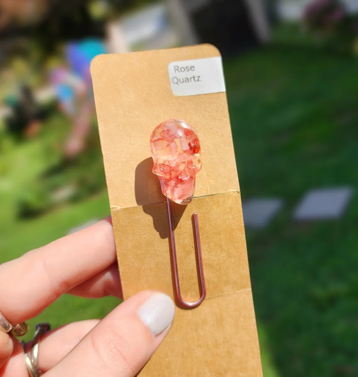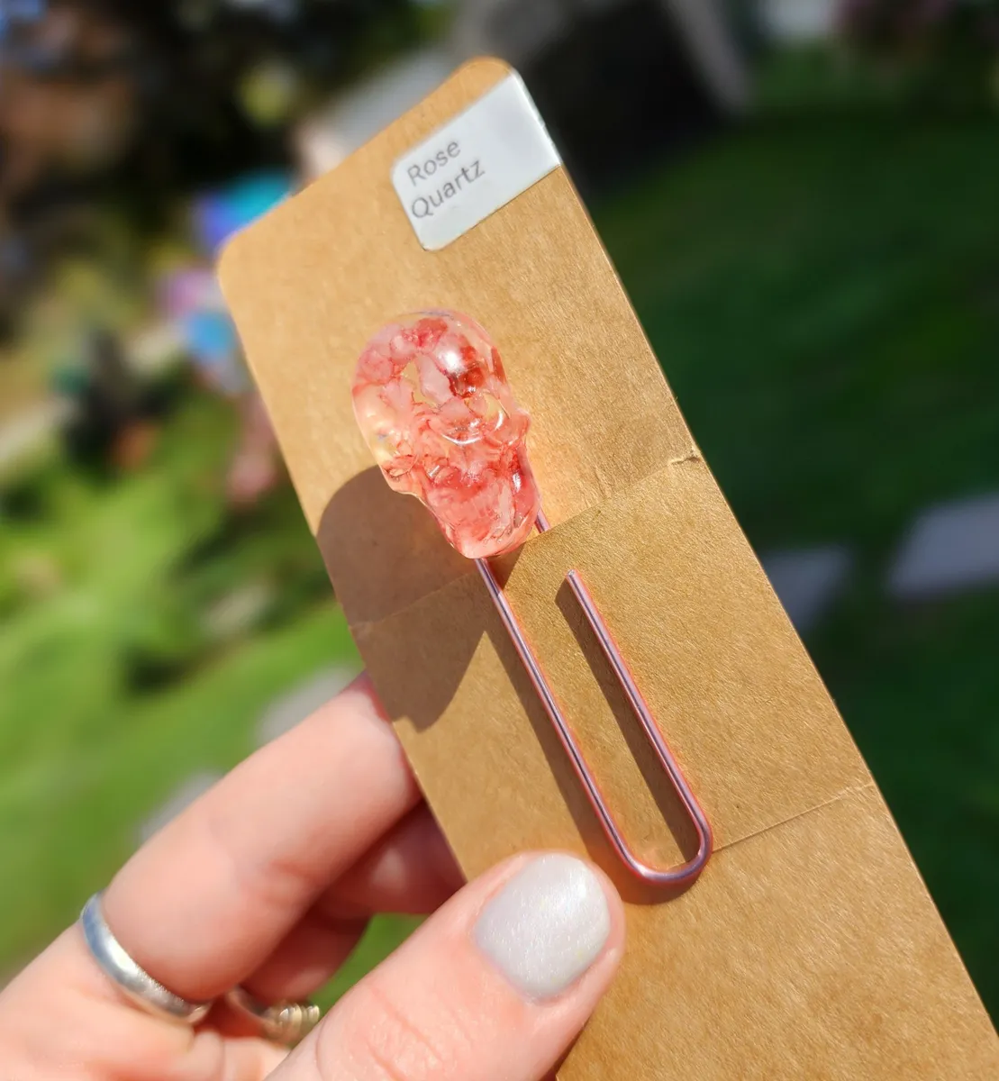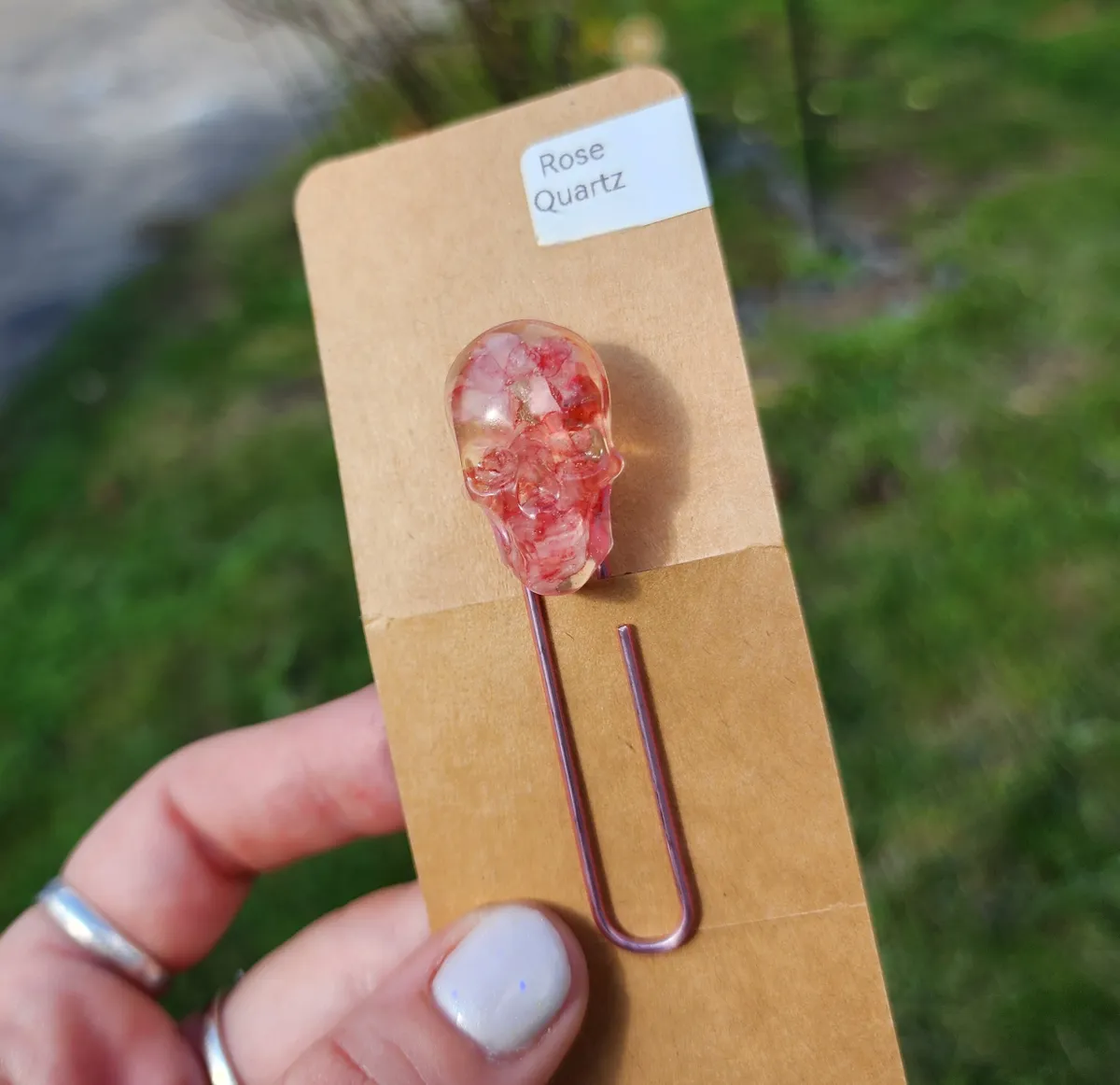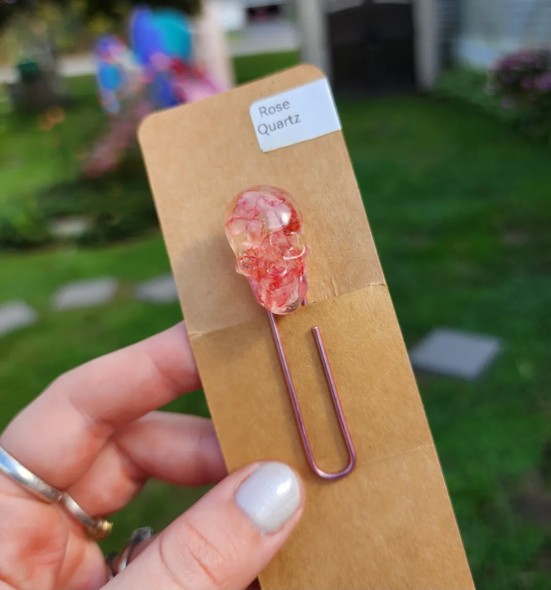 Introducing our Rose Quartz Skull Paperclip Bookmark – the perfect accessory for all book lovers! This unique and eye-catching bookmark features stunning pink Rose Quartz stones inside an epoxy skull design that is sure to stand out in any book. The intricate details and vibrant colors make it a must-have for adding a touch of personality to your reading experience. Made with high-quality materials, this bookmark is durable and will keep your place securely. Whether you’re a fan of horror novels or just love a little edge in your reading routine, this Rose Quartz Skull Bookmark is a must-have addition to your collection. Get yours today and add a touch of whimsy to your reading adventures!
