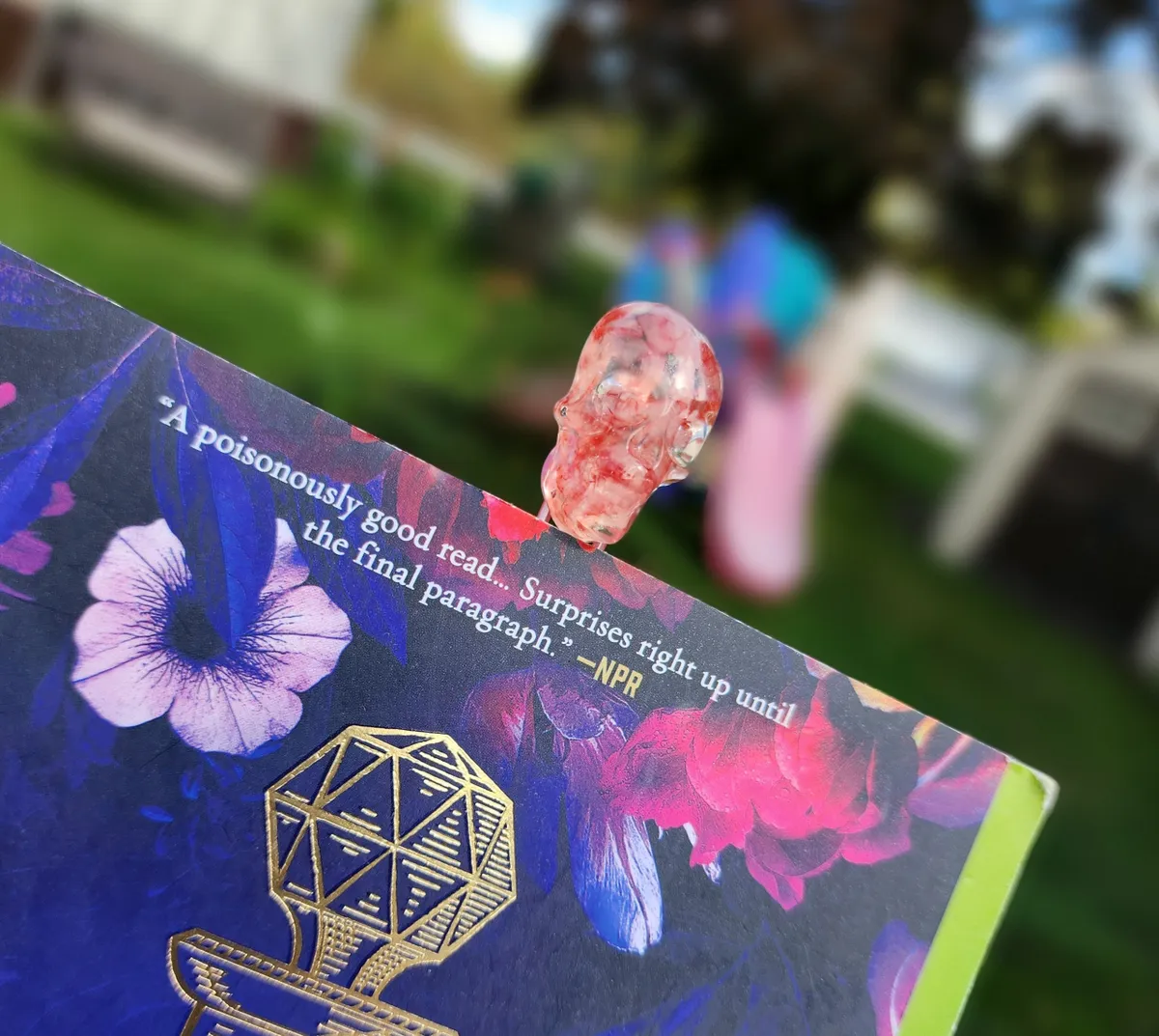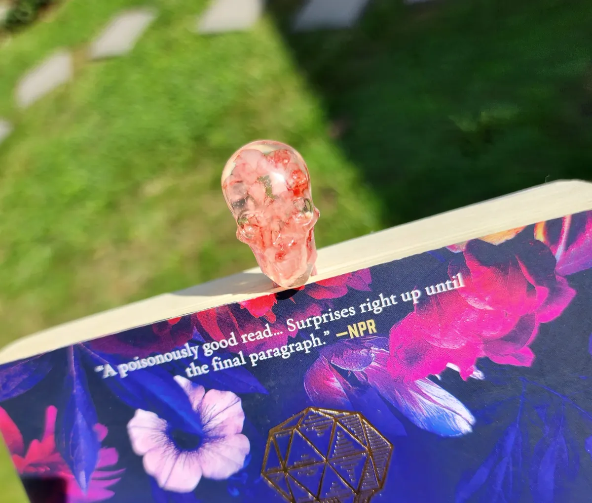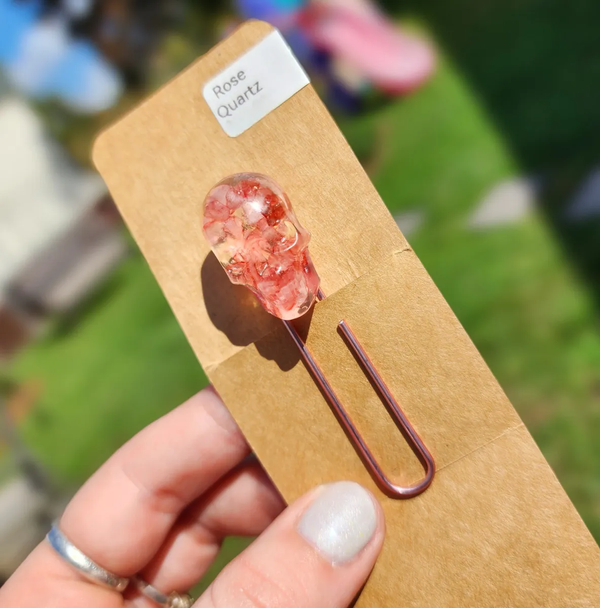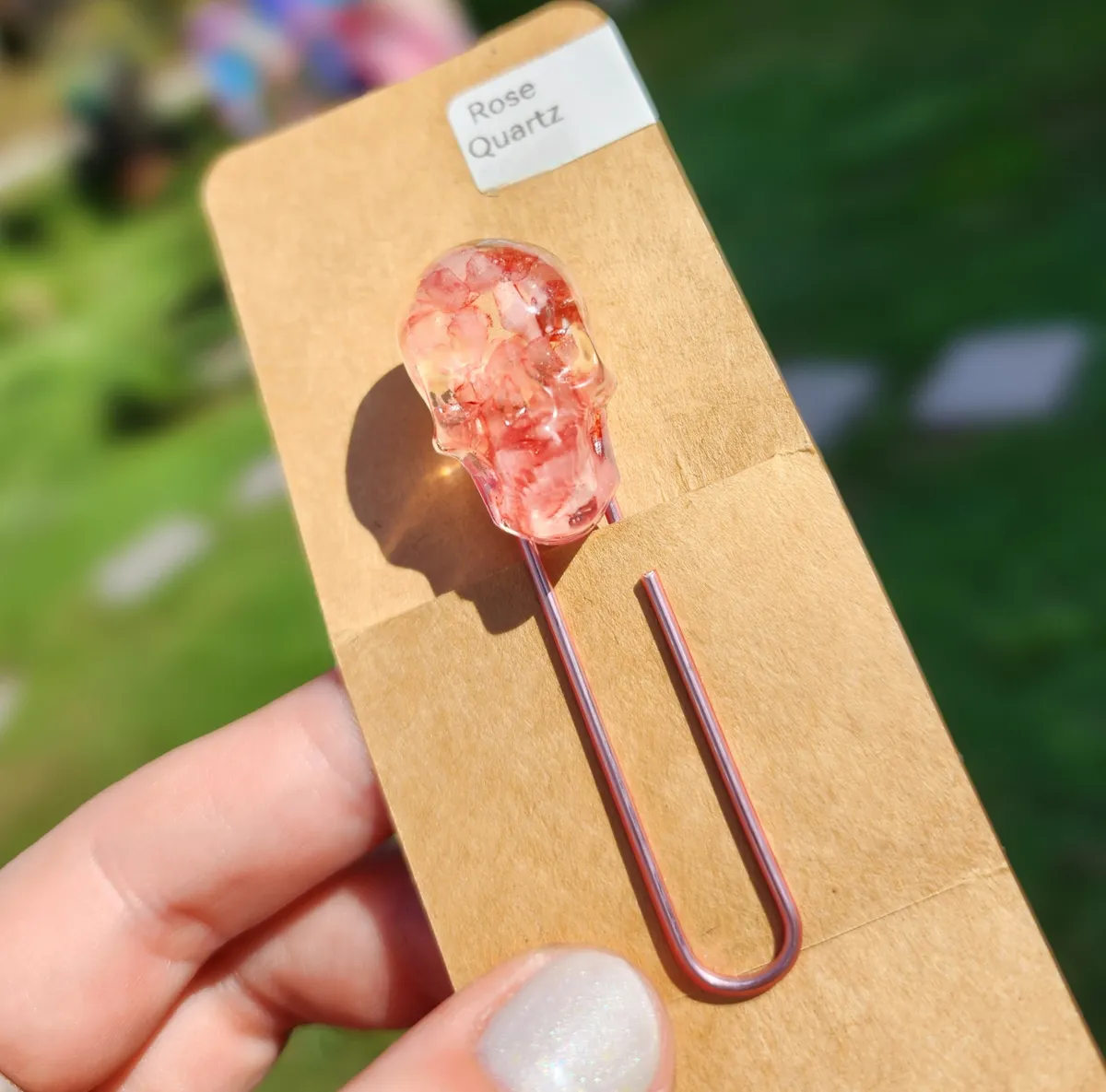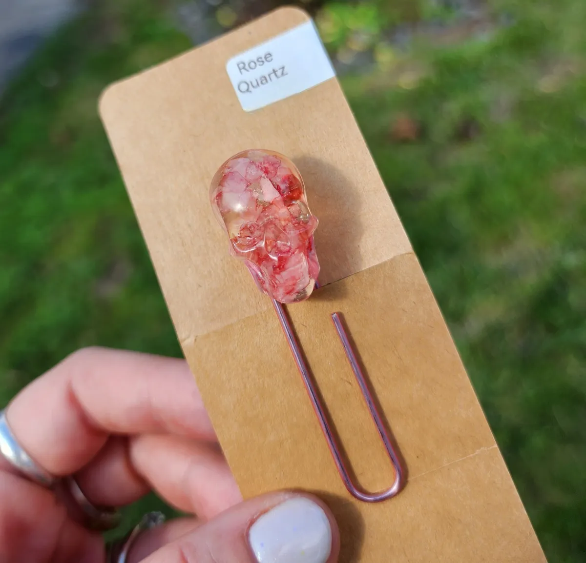 Introducing our Rose Quartz Skull Paperclip Bookmark – the perfect accessory for all book lovers! This unique and eye-catching bookmark features stunning pink Rose Quartz stones inside an epoxy skull design that is sure to stand out in any book. The intricate details and vibrant colors make it a must-have for adding a touch of personality to your reading experience. Made with high-quality materials, this bookmark is durable and will keep your place securely. Whether you’re a fan of horror novels or just love a little edge in your reading routine, this Rose Quartz Skull Bookmark is a must-have addition to your collection. Get yours today and add a touch of whimsy to your reading adventures!