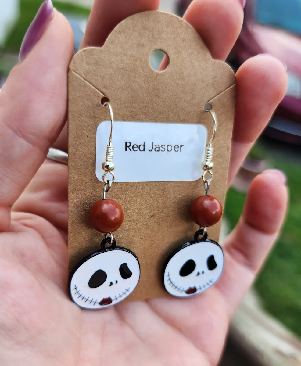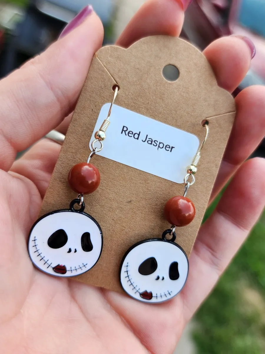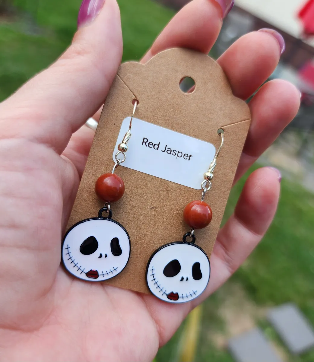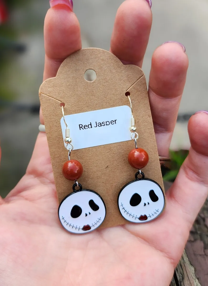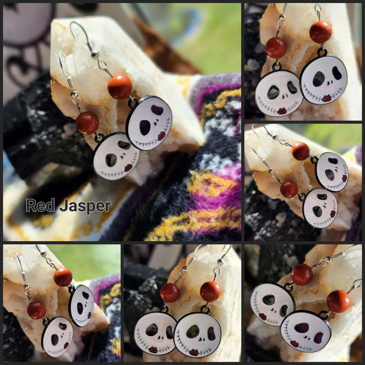The product image showcases a collage of photos that perfectly capture the essence of these earrings. From various angles, you can see the intricate details of the skeleton face, the mesmerizing red jasper beads, and the overall composition of the earrings. Each photo is a testament to the uniqueness and artistry of our craft.