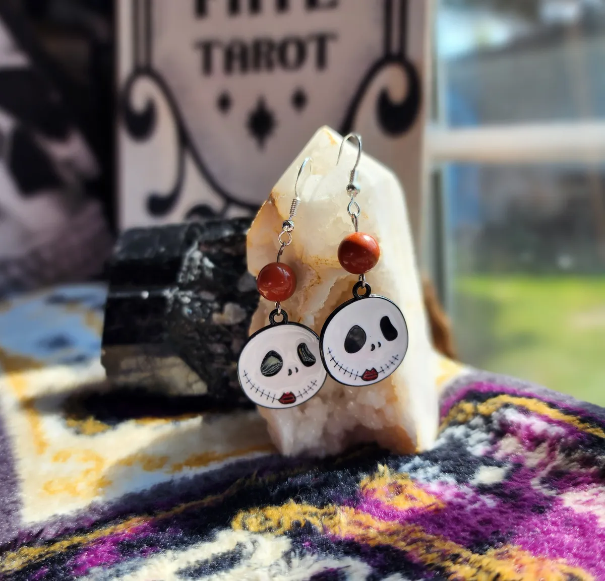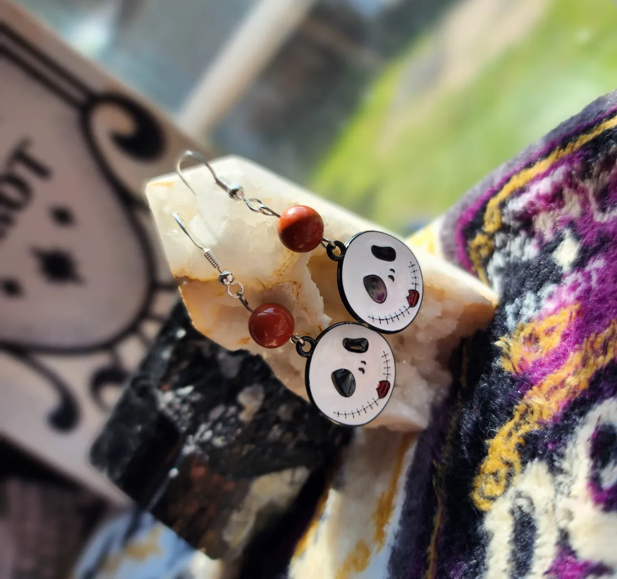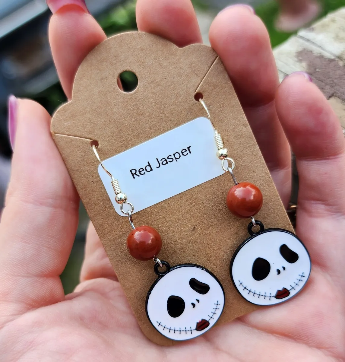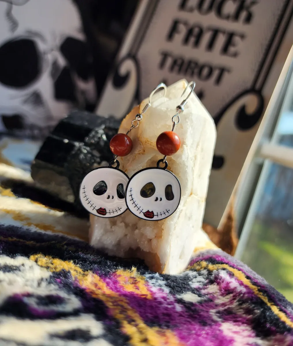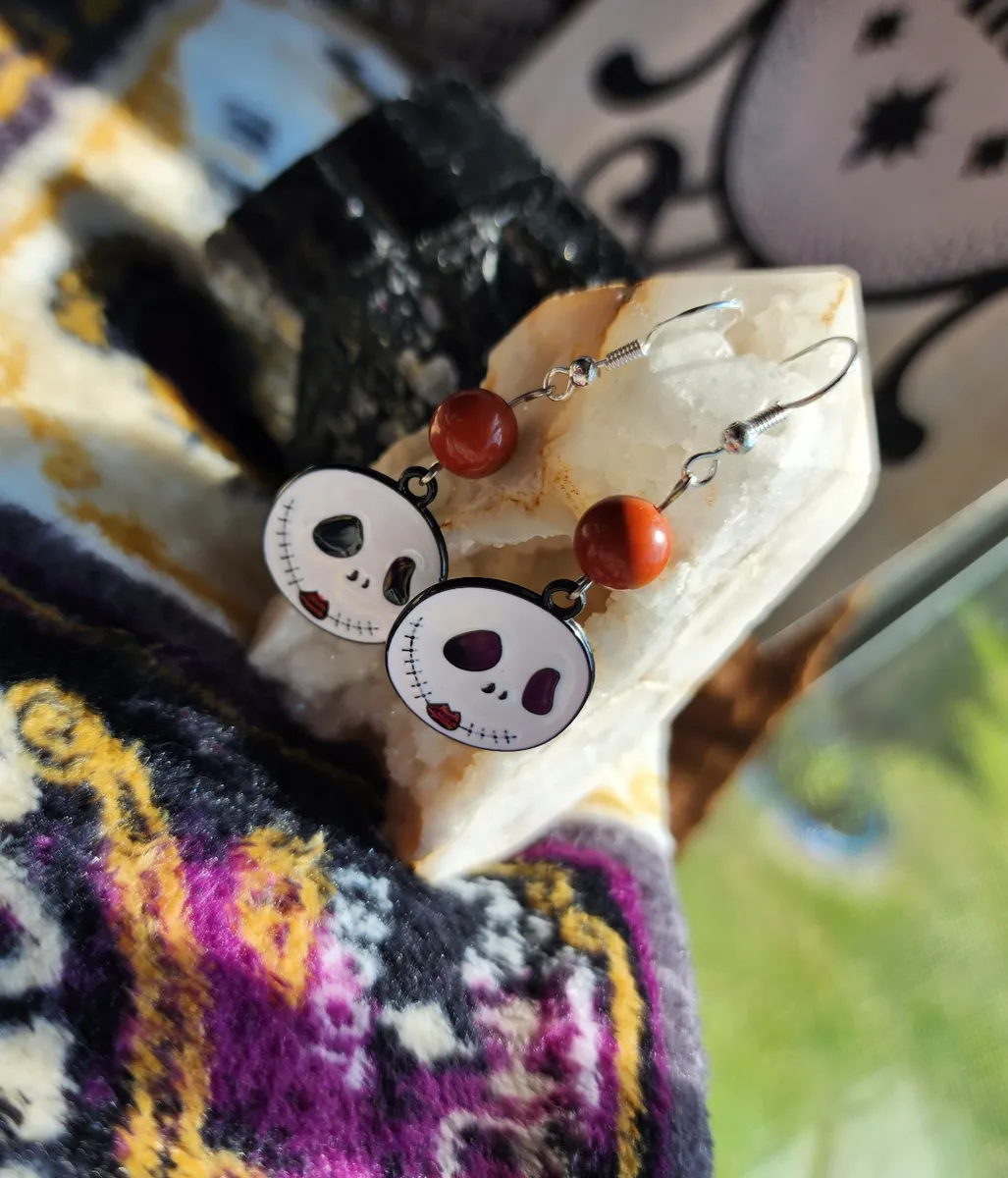 The product image showcases a collage of photos that perfectly capture the essence of these earrings. From various angles, you can see the intricate details of the skeleton face, the mesmerizing red jasper beads, and the overall composition of the earrings. Each photo is a testament to the uniqueness and artistry of our craft.