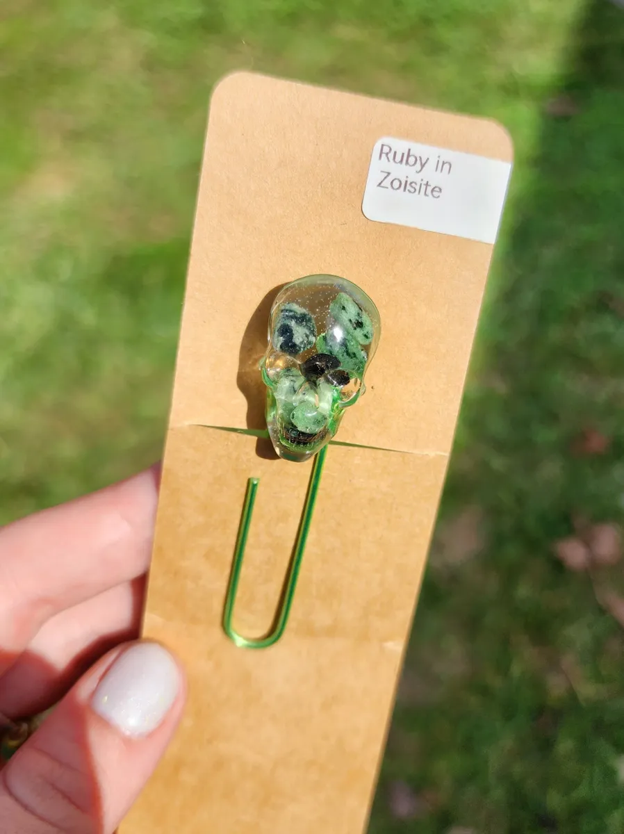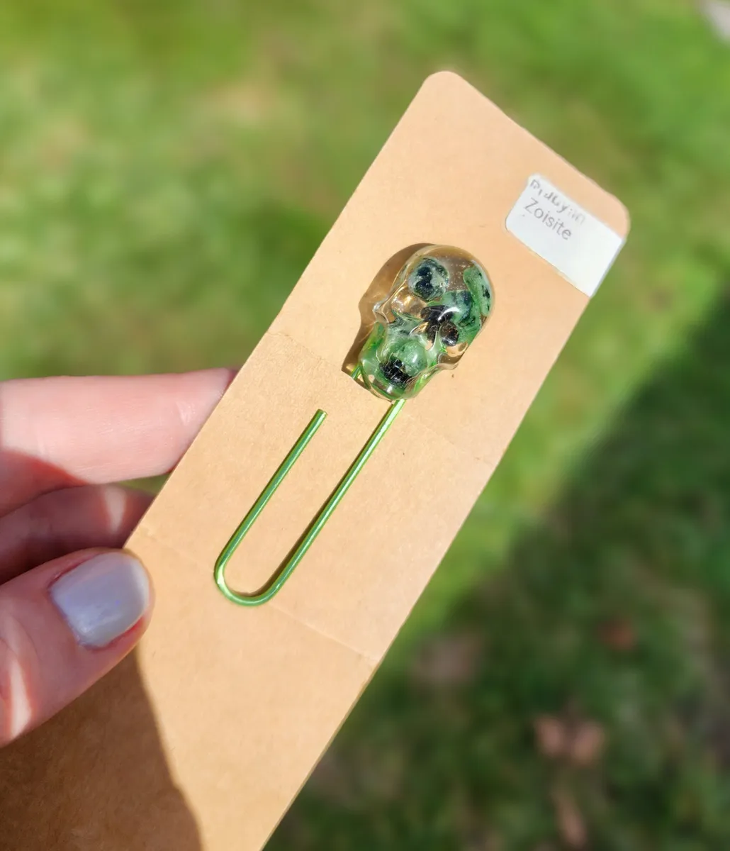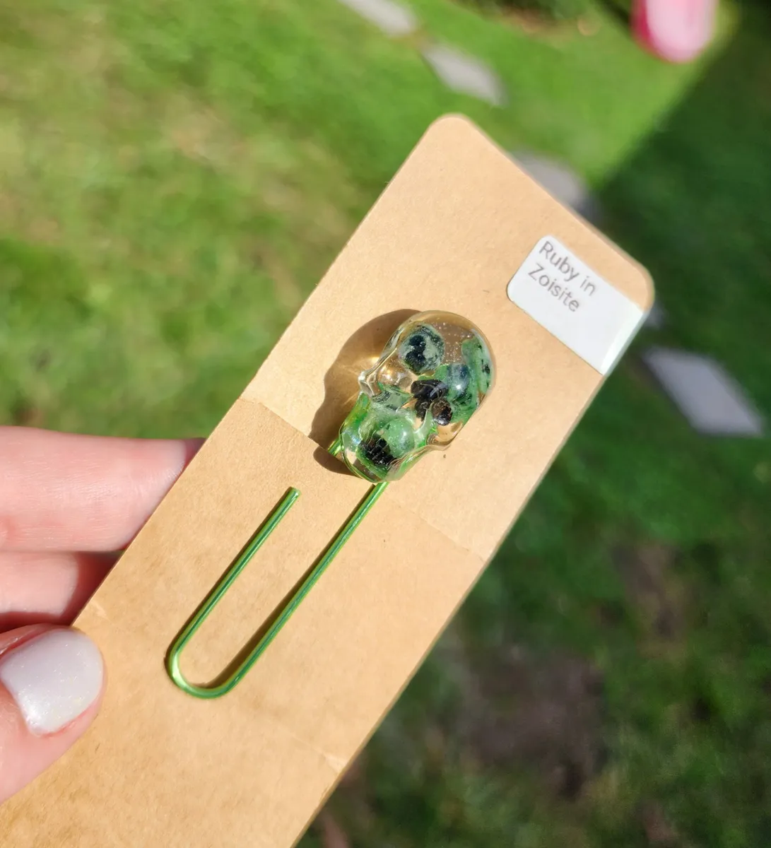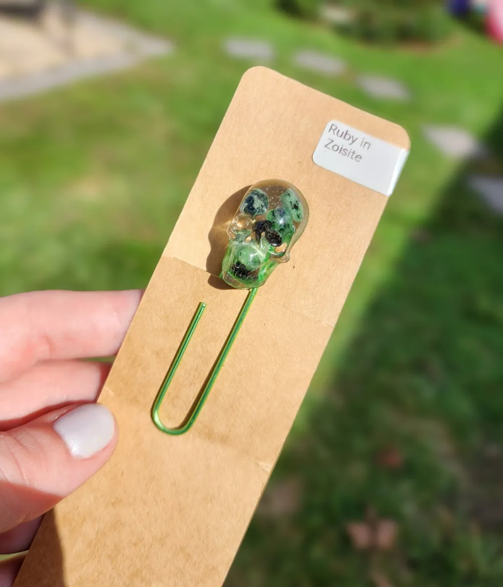 Add a touch of edgy elegance to your reading experience with our Ruby in Zoisite Skull Bookmark! This unique paperclip bookmark features a beautifully crafted epoxy skull made with ruby in zoisite inside, a stunning combination vibrant green hues. Perfect for adding a pop of personality to your favorite book or journal, this bookmark is sure to make a statement. Whether you’re a bookworm or just love to accessorize your reading materials, this skull bookmark is a must-have for any avid reader. Elevate your reading game with this one-of-a-kind piece from our craft business collection!