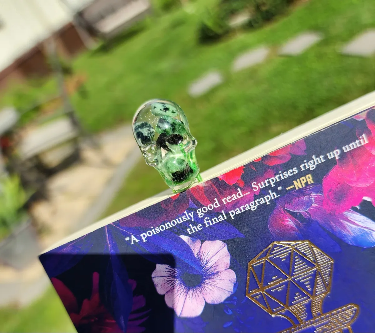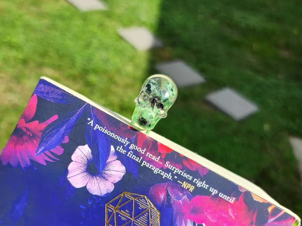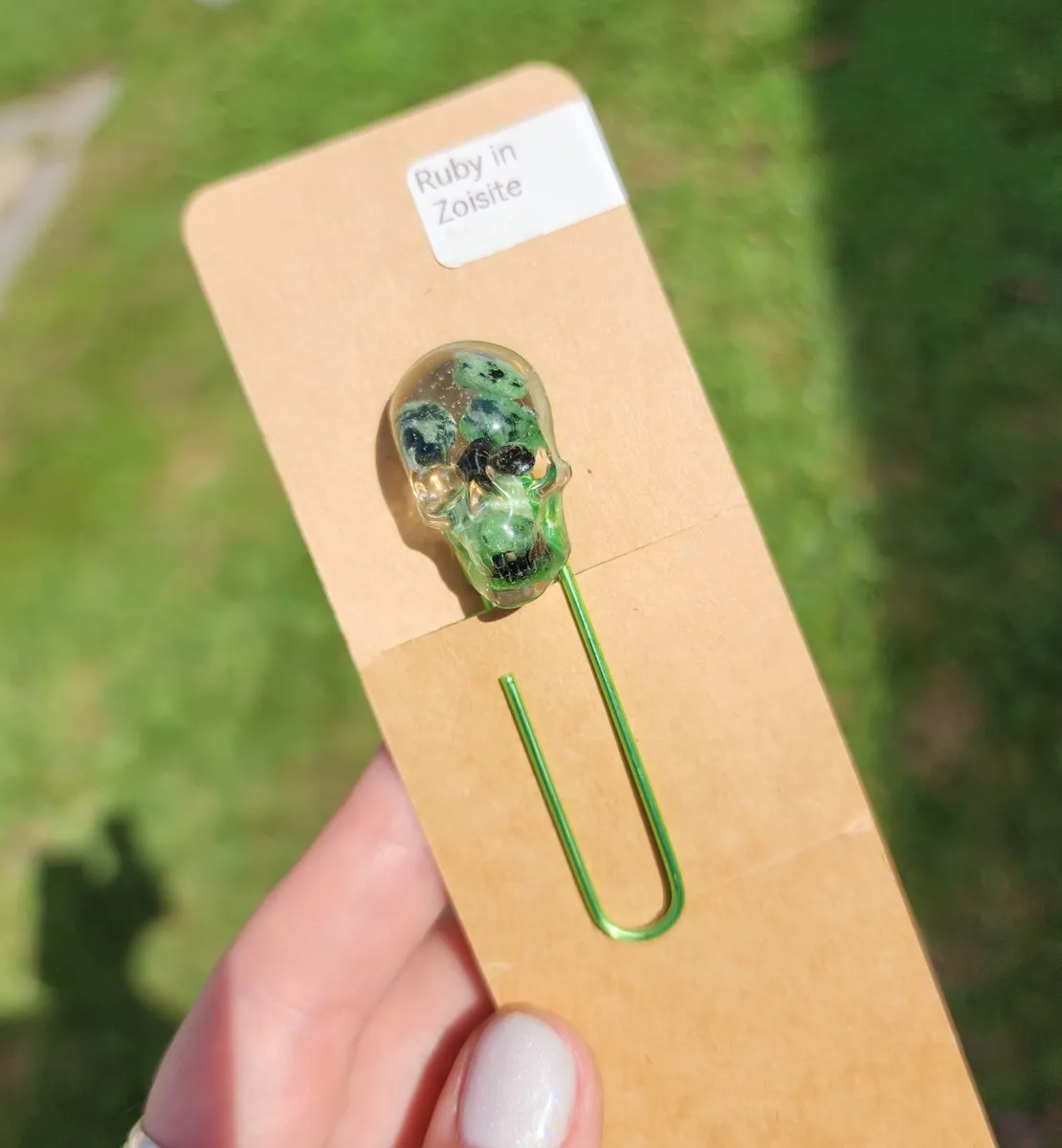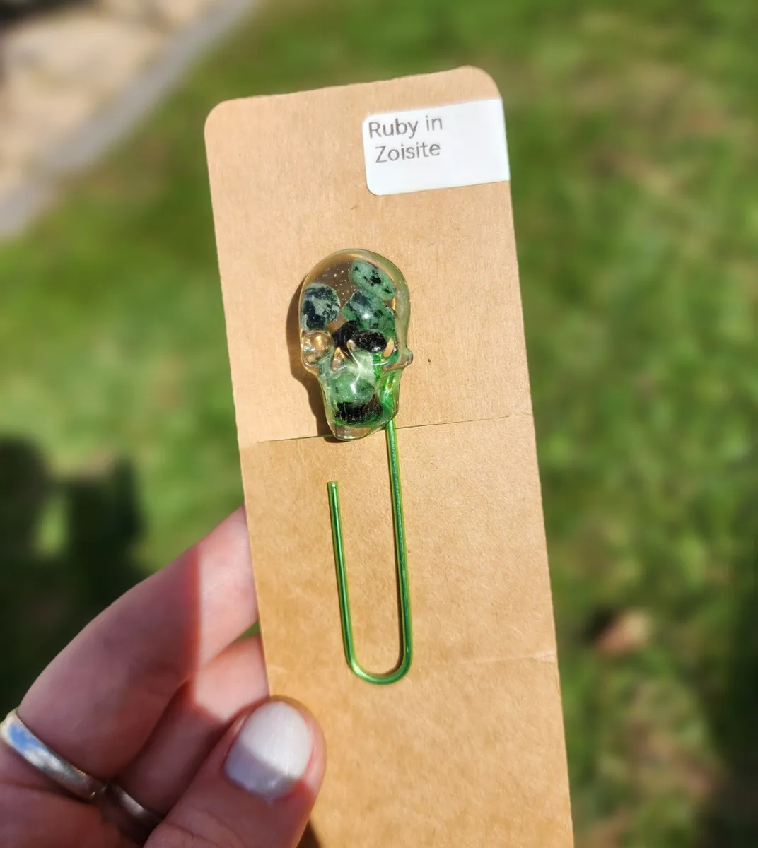Add a touch of edgy elegance to your reading experience with our Ruby in Zoisite Skull Bookmark! This unique paperclip bookmark features a beautifully crafted epoxy skull made with ruby in zoisite inside, a stunning combination vibrant green hues. Perfect for adding a pop of personality to your favorite book or journal, this bookmark is sure to make a statement. Whether you’re a bookworm or just love to accessorize your reading materials, this skull bookmark is a must-have for any avid reader. Elevate your reading game with this one-of-a-kind piece from our craft business collection!