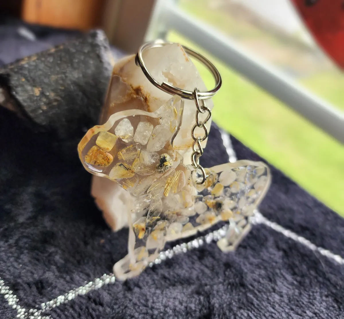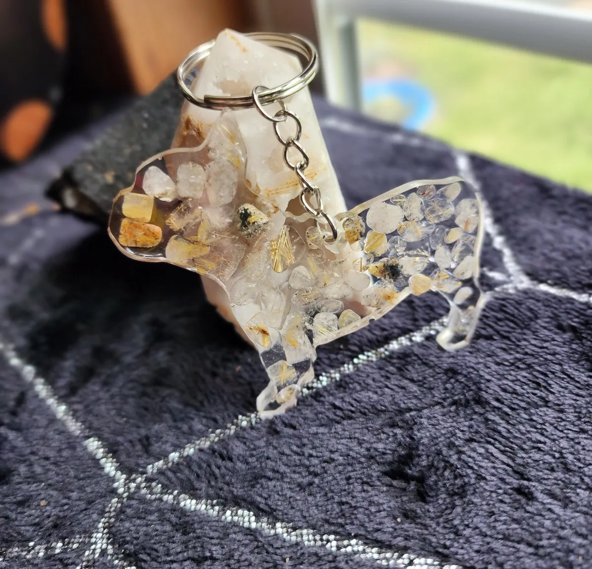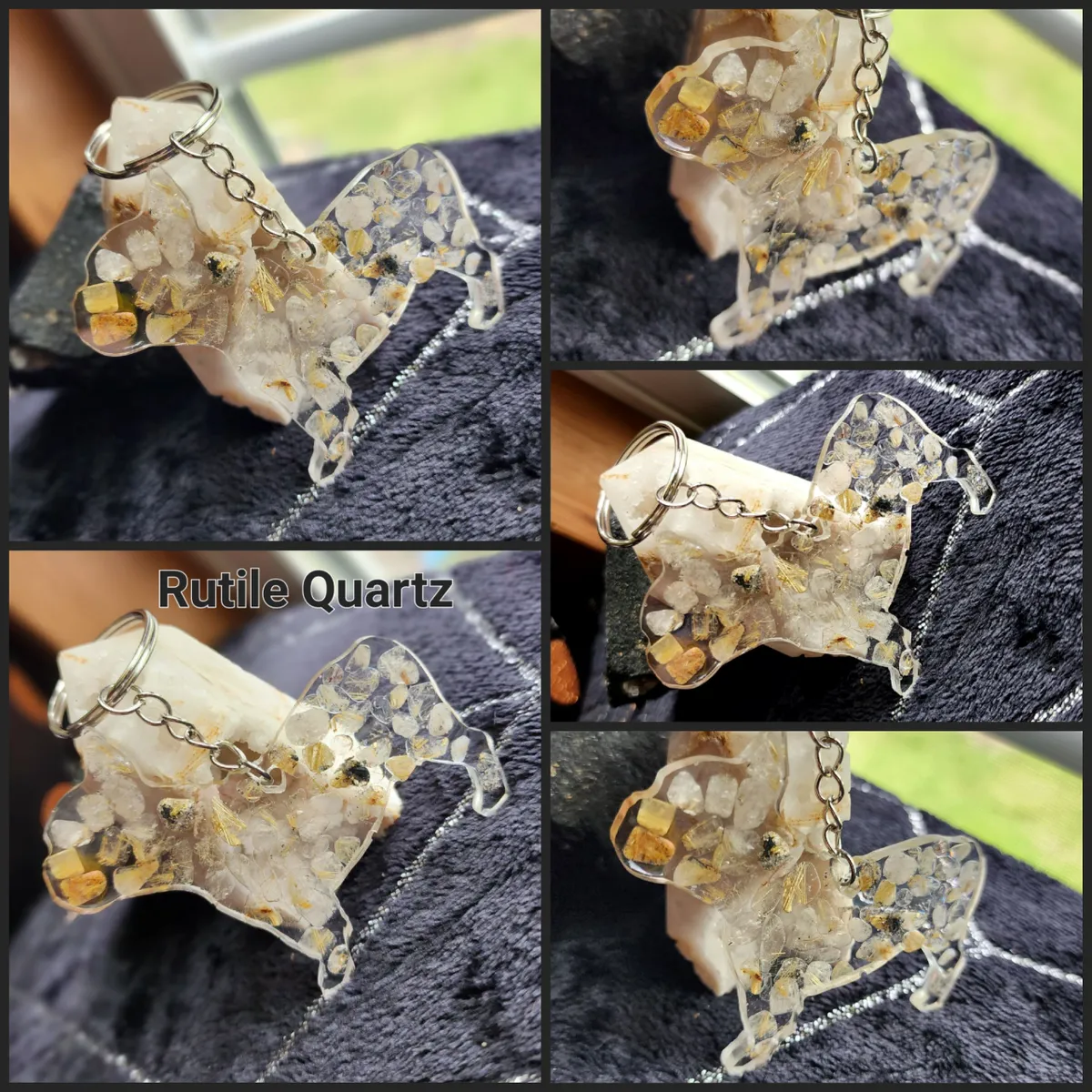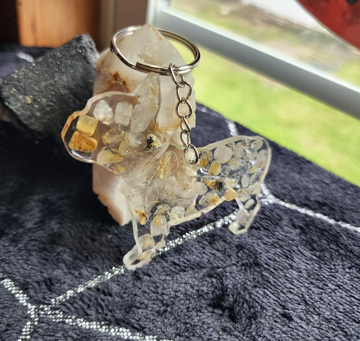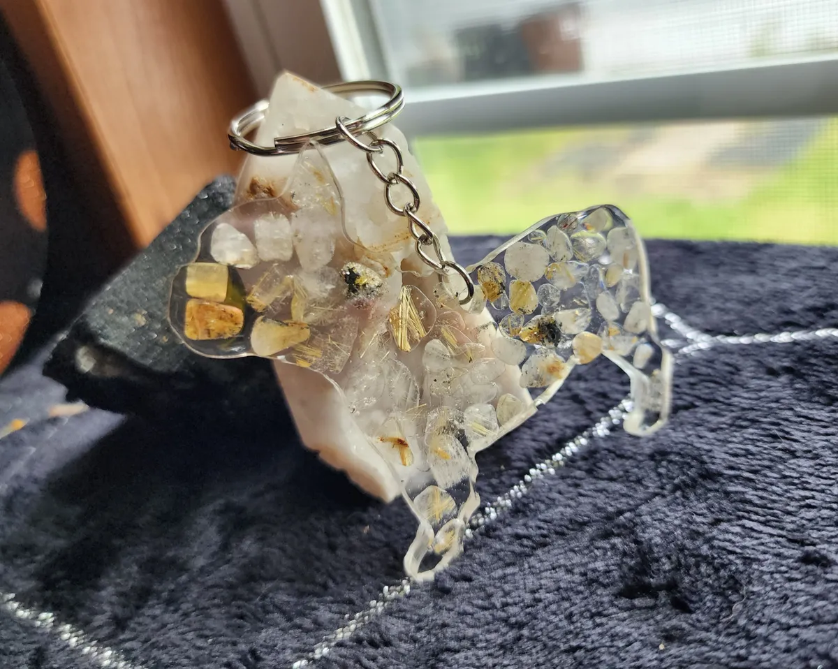 Introducing our exquisite Rutile Quartz Bulldog Keychain, a must-have accessory for the animal or crystal enthusiast. Meticulously handcrafted, this keychain showcases the natural beauty of rutile quartz in a unique and captivating manner. The collage of photos featured on the product image portrays a mesmerizing blend of delicate rocks, carefully cut and arranged to create a striking visual appeal. The intricate detailing and expert craftsmanship of this keychain make it a standout piece within our craft business collection. With its durable chain and sturdy construction, this keychain effortlessly combines style with functionality, ensuring that your keys are always secure and easily accessible. Elevate your everyday essentials with our Rutile Quartz Bulldog Keychain, a perfect blend of elegance and practicality.
