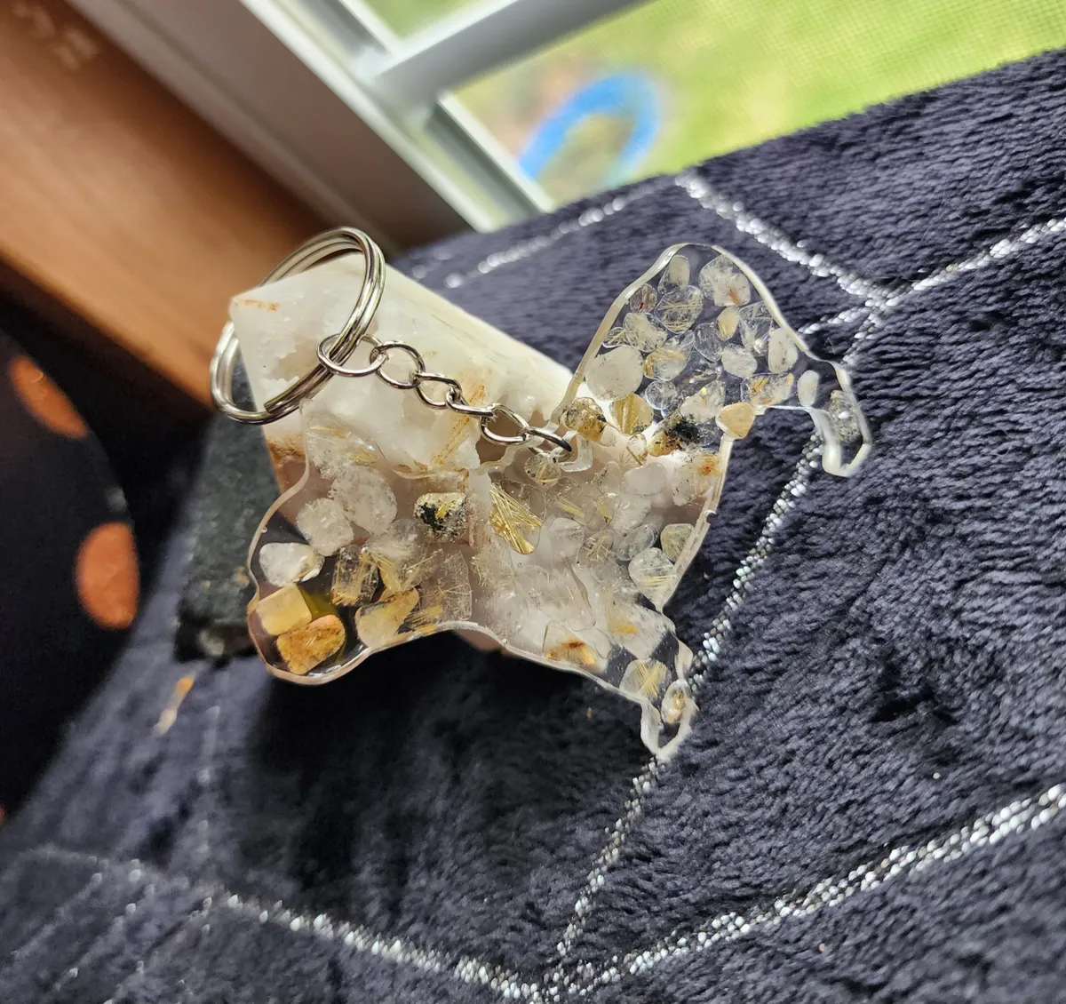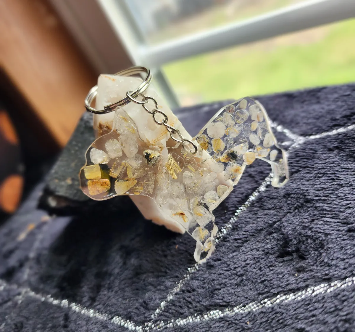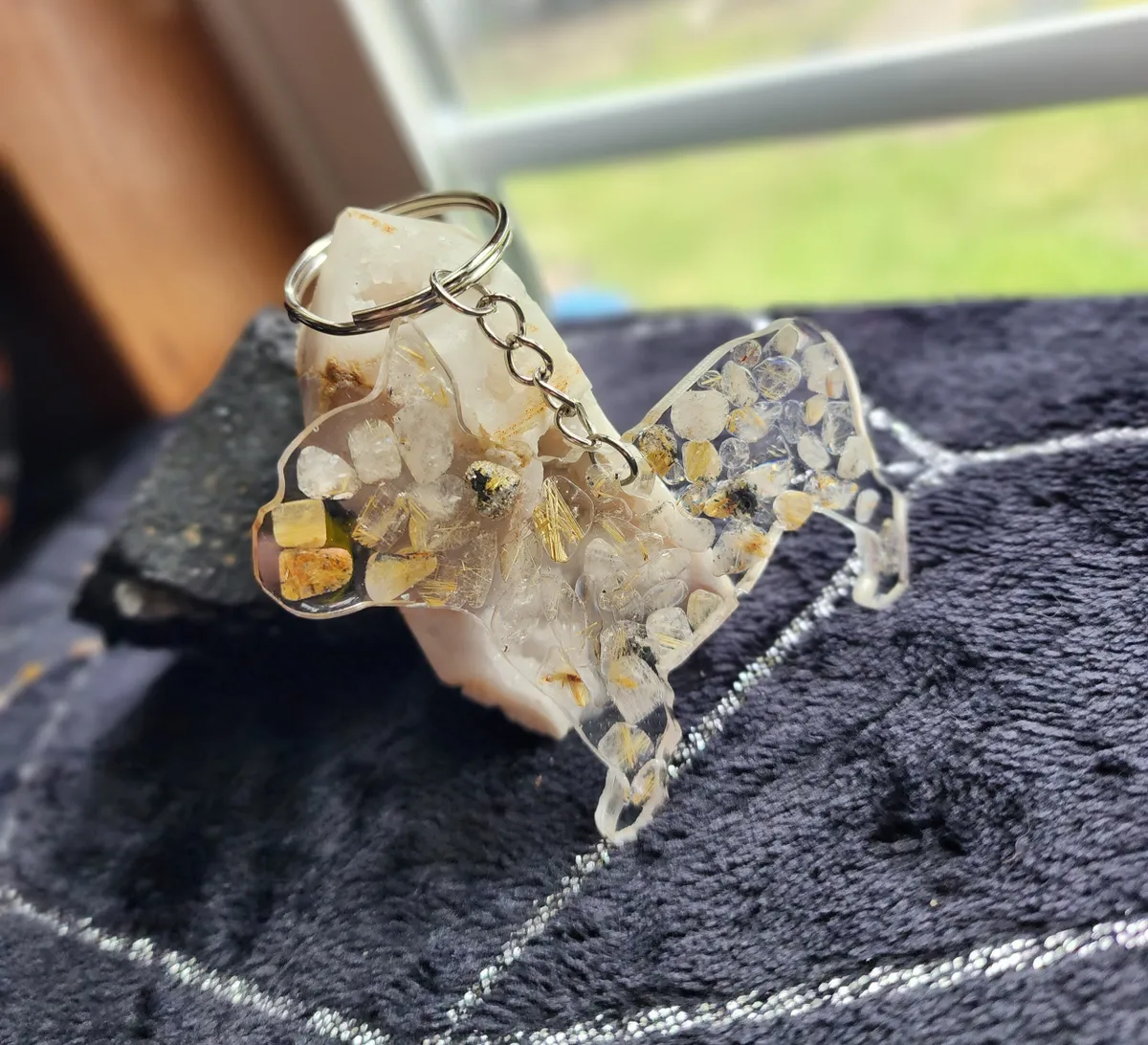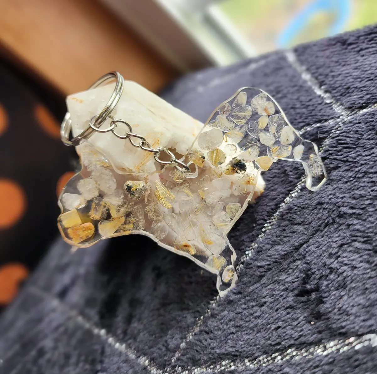 Introducing our exquisite Rutile Quartz Bulldog Keychain, a must-have accessory for the animal or crystal enthusiast. Meticulously handcrafted, this keychain showcases the natural beauty of rutile quartz in a unique and captivating manner. The collage of photos featured on the product image portrays a mesmerizing blend of delicate rocks, carefully cut and arranged to create a striking visual appeal. The intricate detailing and expert craftsmanship of this keychain make it a standout piece within our craft business collection. With its durable chain and sturdy construction, this keychain effortlessly combines style with functionality, ensuring that your keys are always secure and easily accessible. Elevate your everyday essentials with our Rutile Quartz Bulldog Keychain, a perfect blend of elegance and practicality.