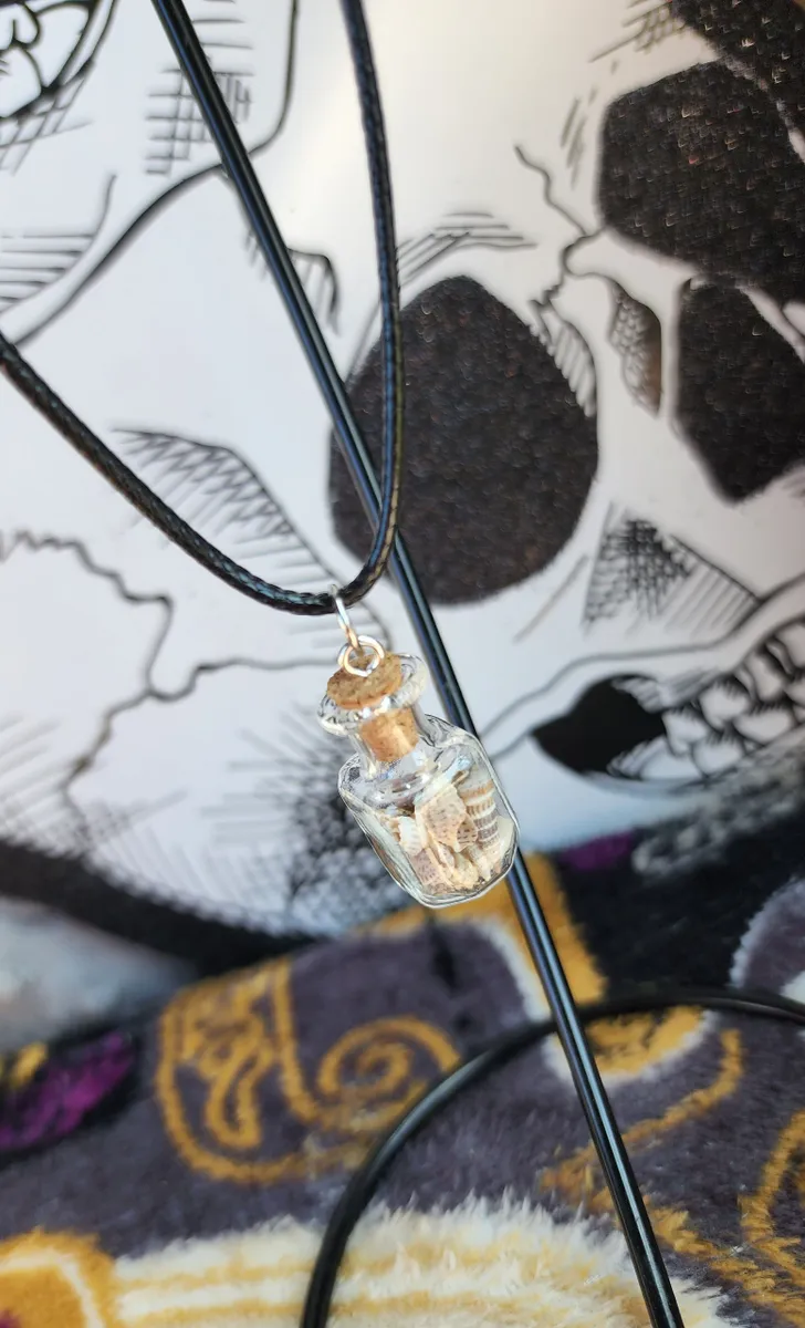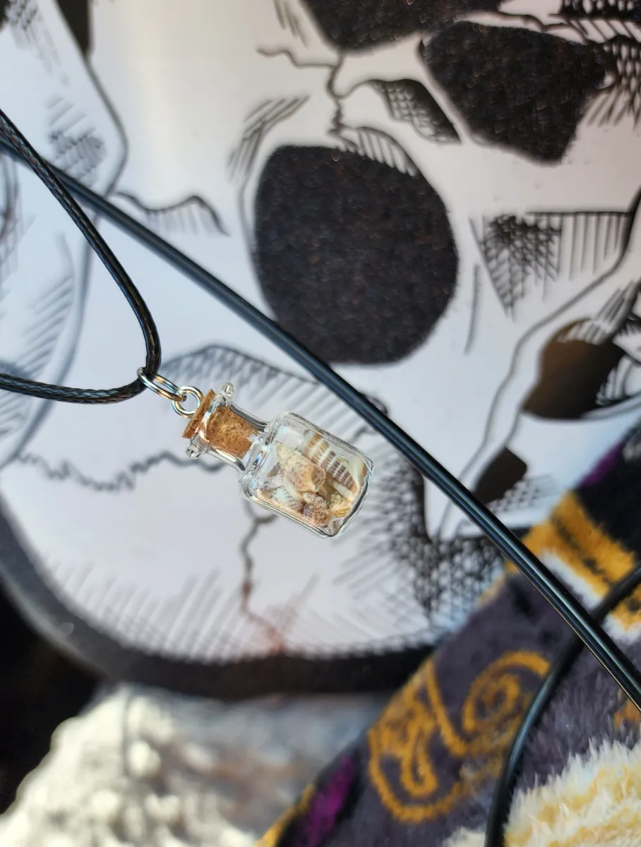 To add a unique twist, the glass bottles are suspended from a sleek black cord, effortlessly blending elegance with a touch of edginess. The contrast of the dark cord against the vibrant sea shells creates a visually striking combination, making this necklace a statement accessory that effortlessly elevates any outfit.