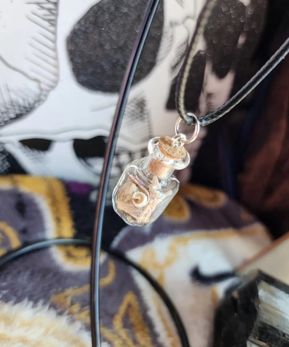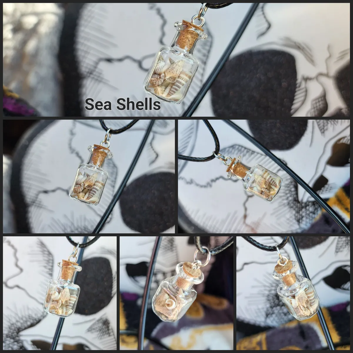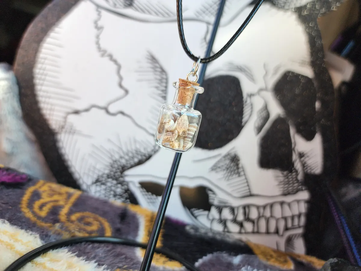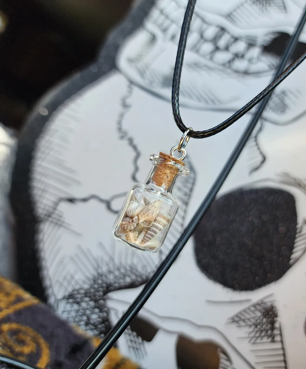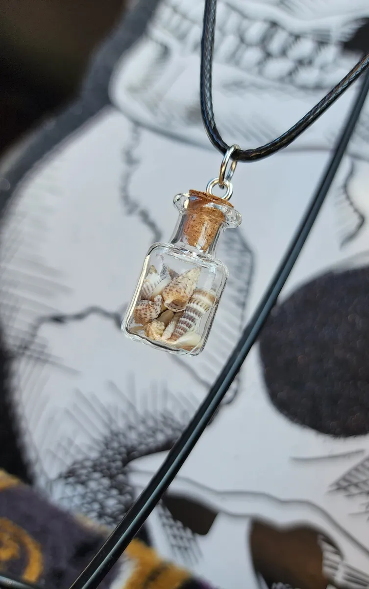Introducing our stunning Sea Shell filled Glass Bottle Necklace, a captivating piece that combines the beauty of nature with an edgy touch. This exquisite necklace features a collection of carefully selected sea shells gracefully encased within a delicate glass bottle, creating a mesmerizing collage that captures the essence of beachside serenity.
