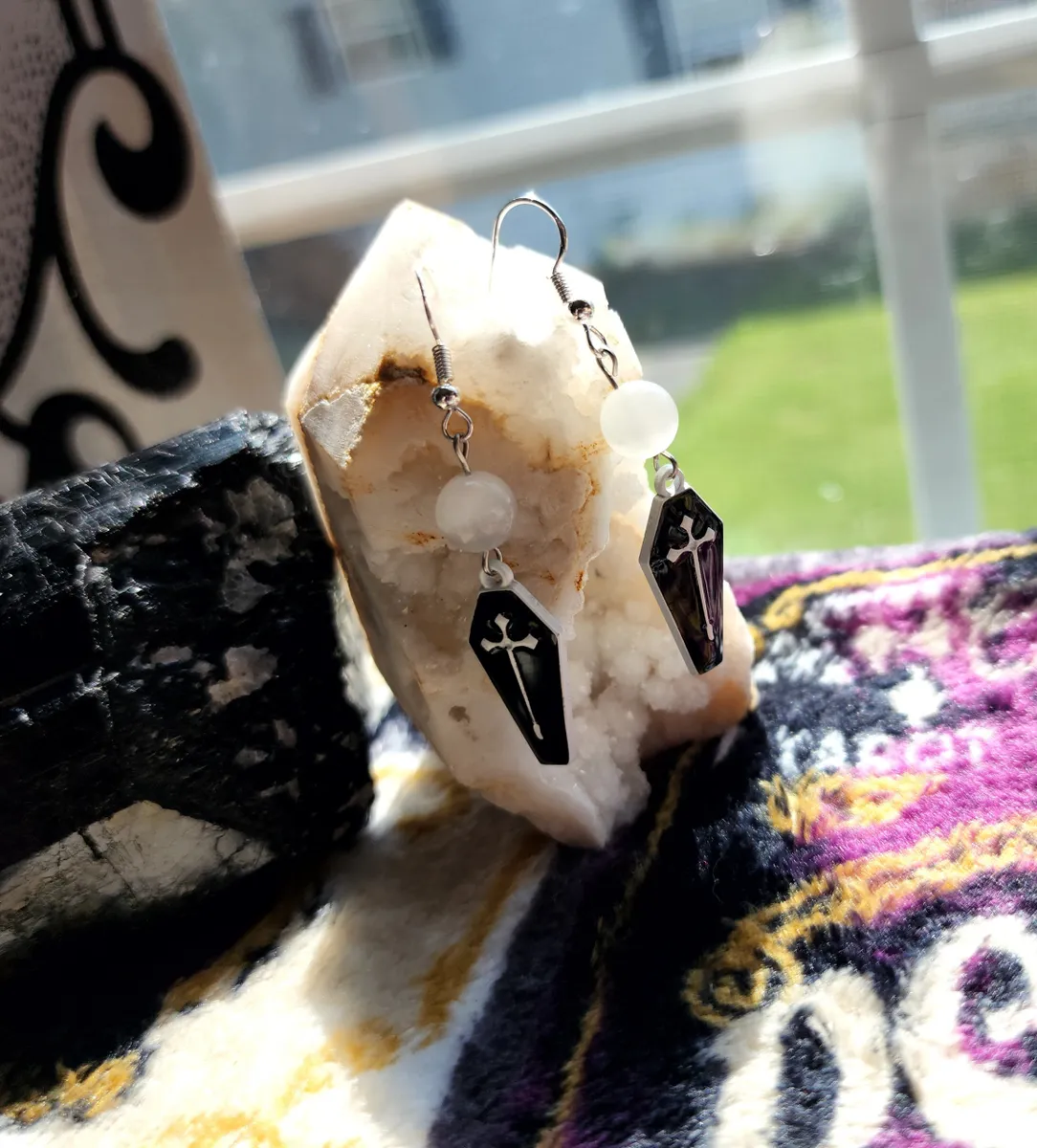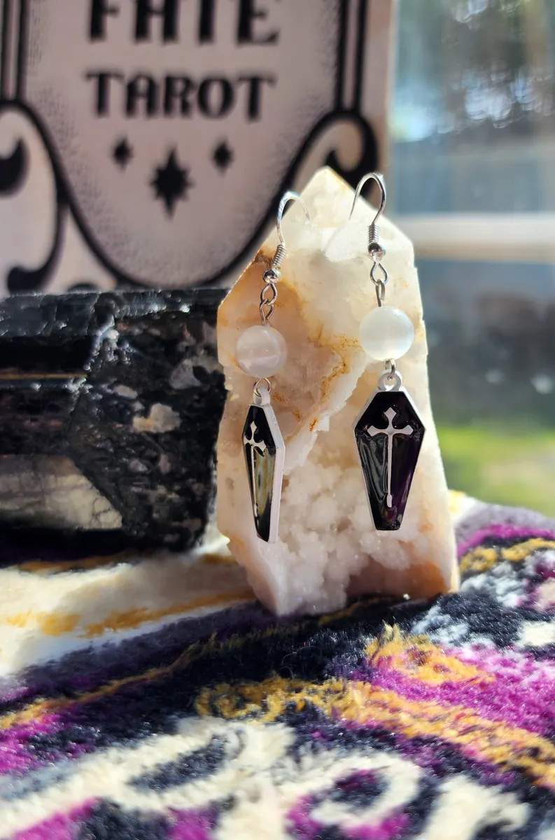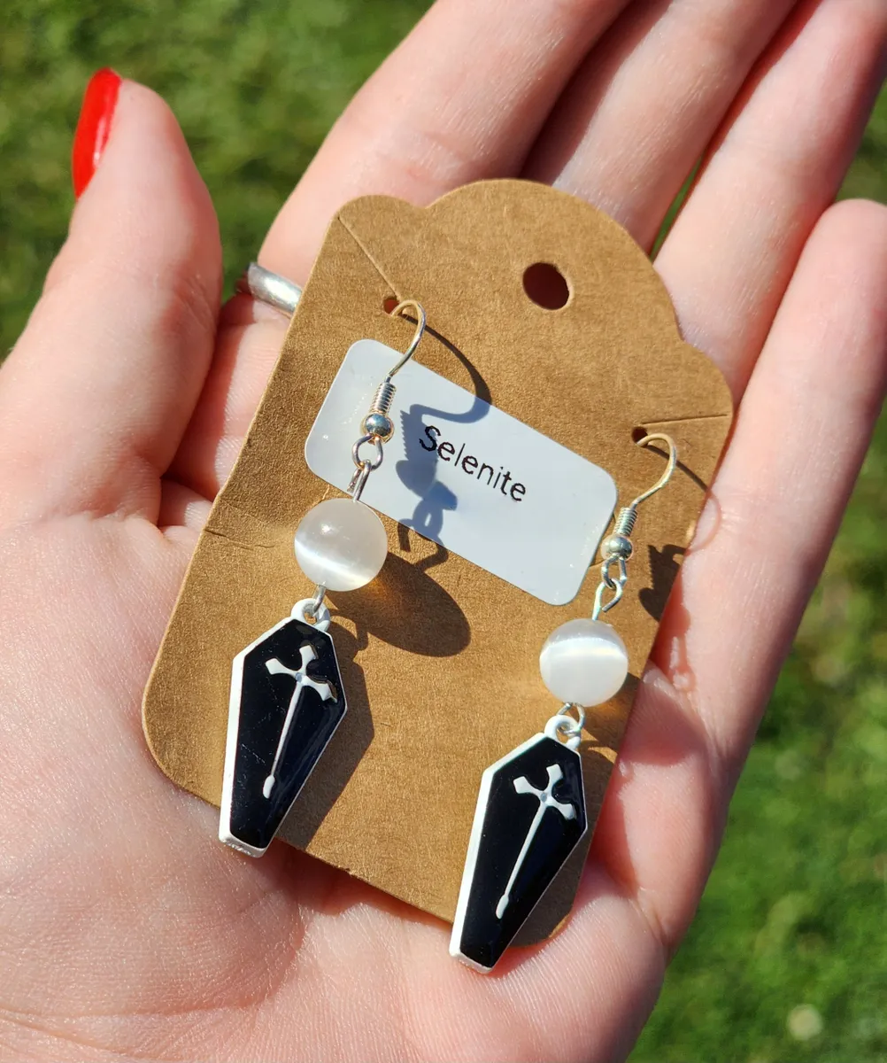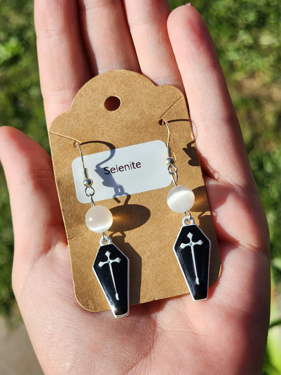 Indulge in the indulgent world of fine craftsmanship with these Selenite with Coffin Earrings.